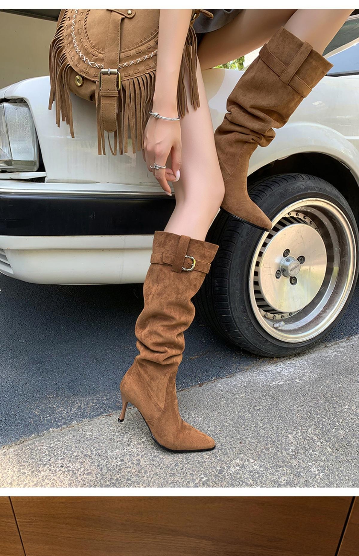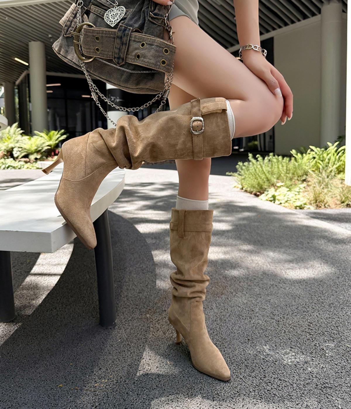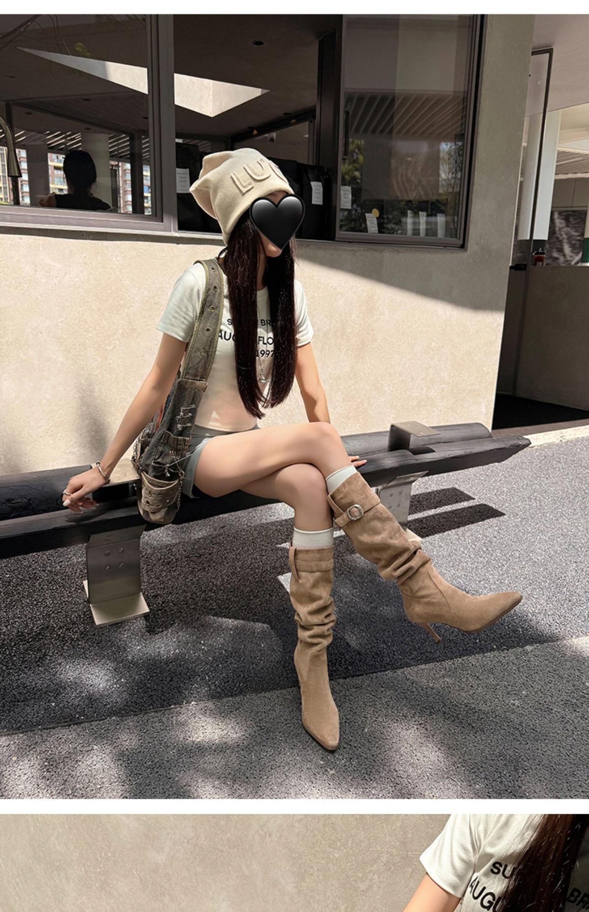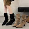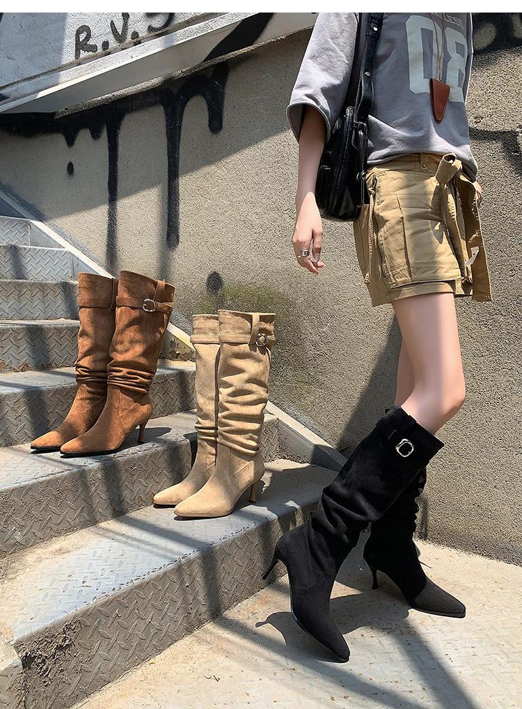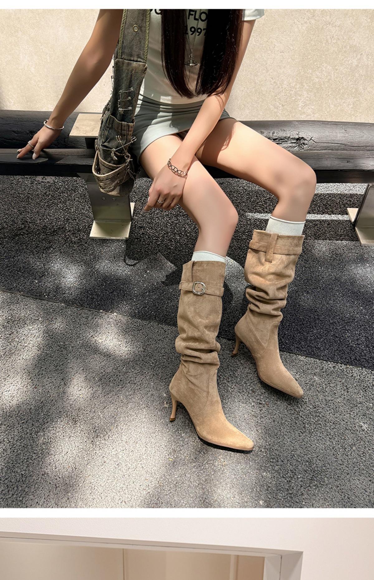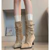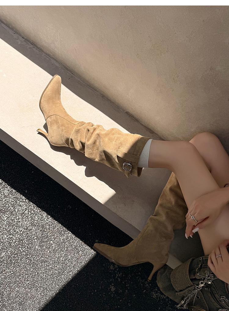 Botas Apiladas Fruncidas de Punta Europea y Americana para Mujer 2025 Otoño/Invierno Nuevo Estilo Tacón de Aguja Botas Altas hasta la Rodilla Temperamento Adelgazantes Botas Altas Mujer