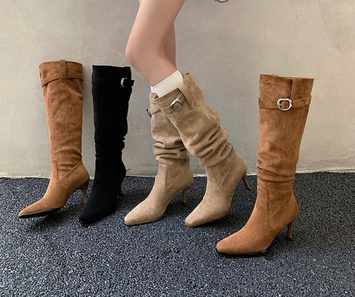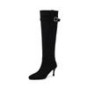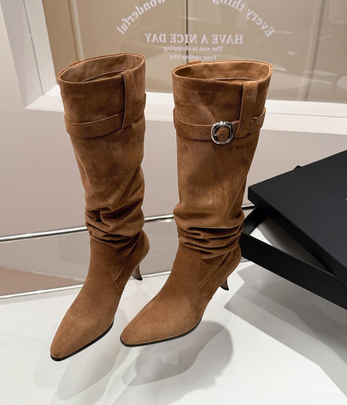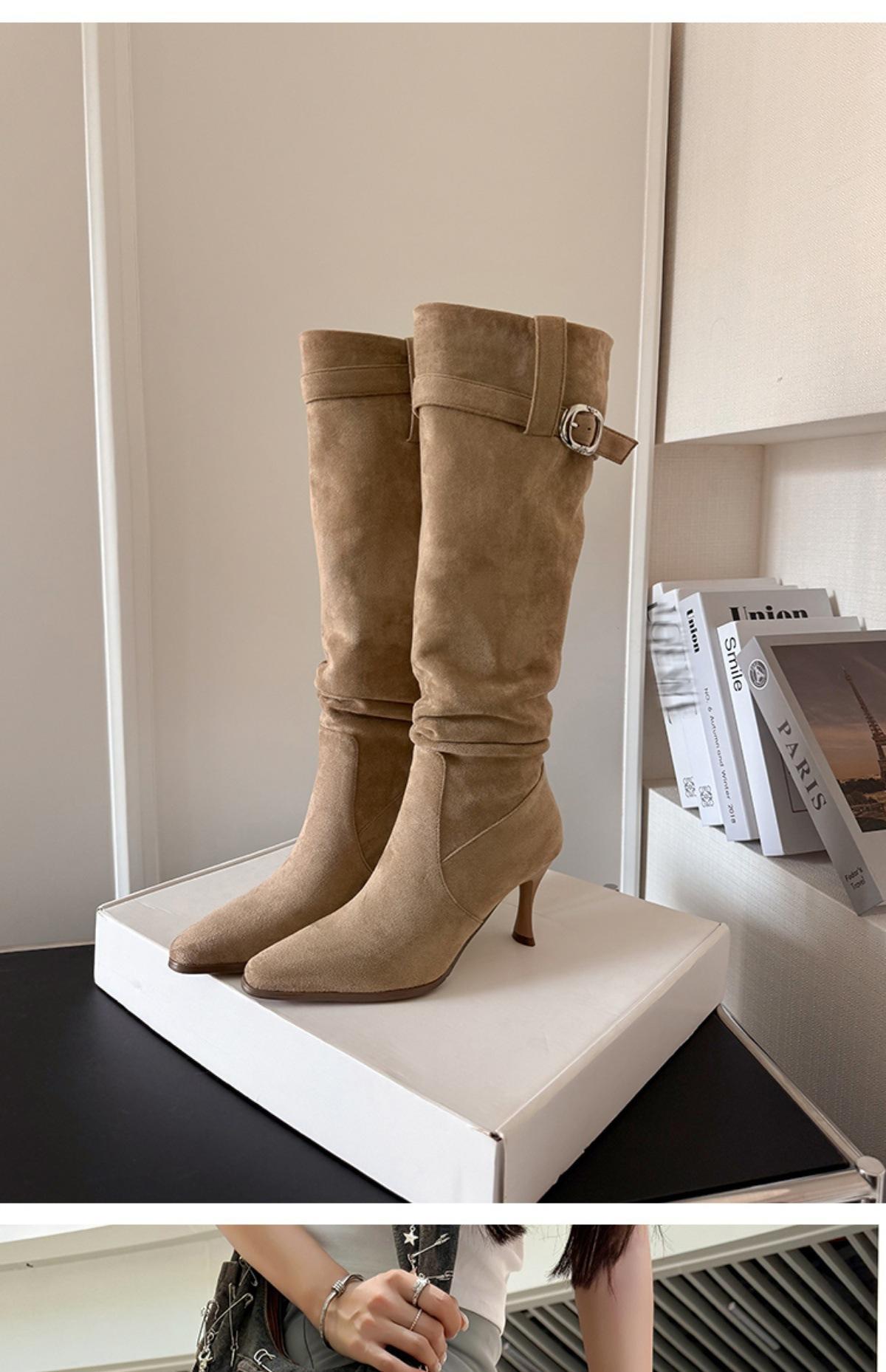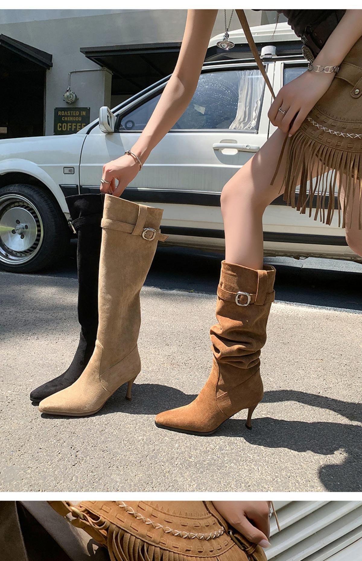 Botas Apiladas Fruncidas de Punta Europea y Americana para Mujer 2025 Otoño/Invierno Nuevo Estilo Tacón de Aguja Botas Altas hasta la Rodilla Temperamento Adelgazantes Botas Altas Mujer
