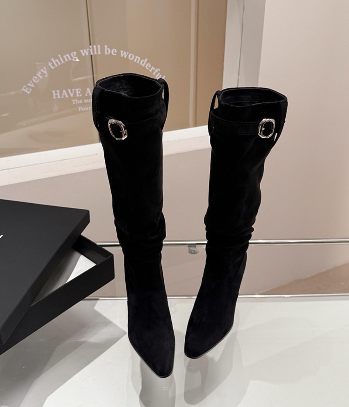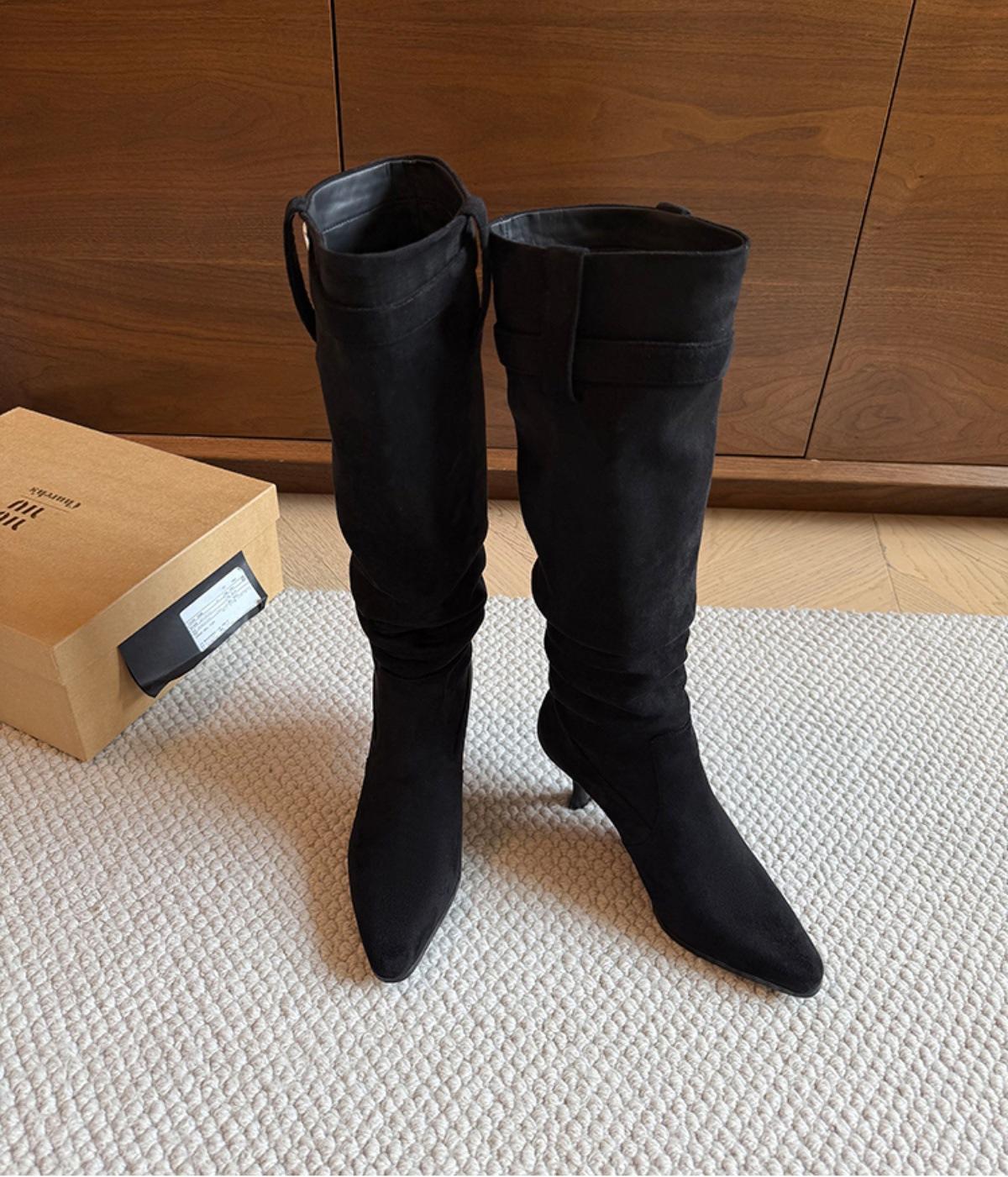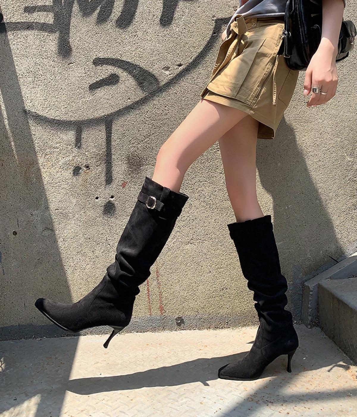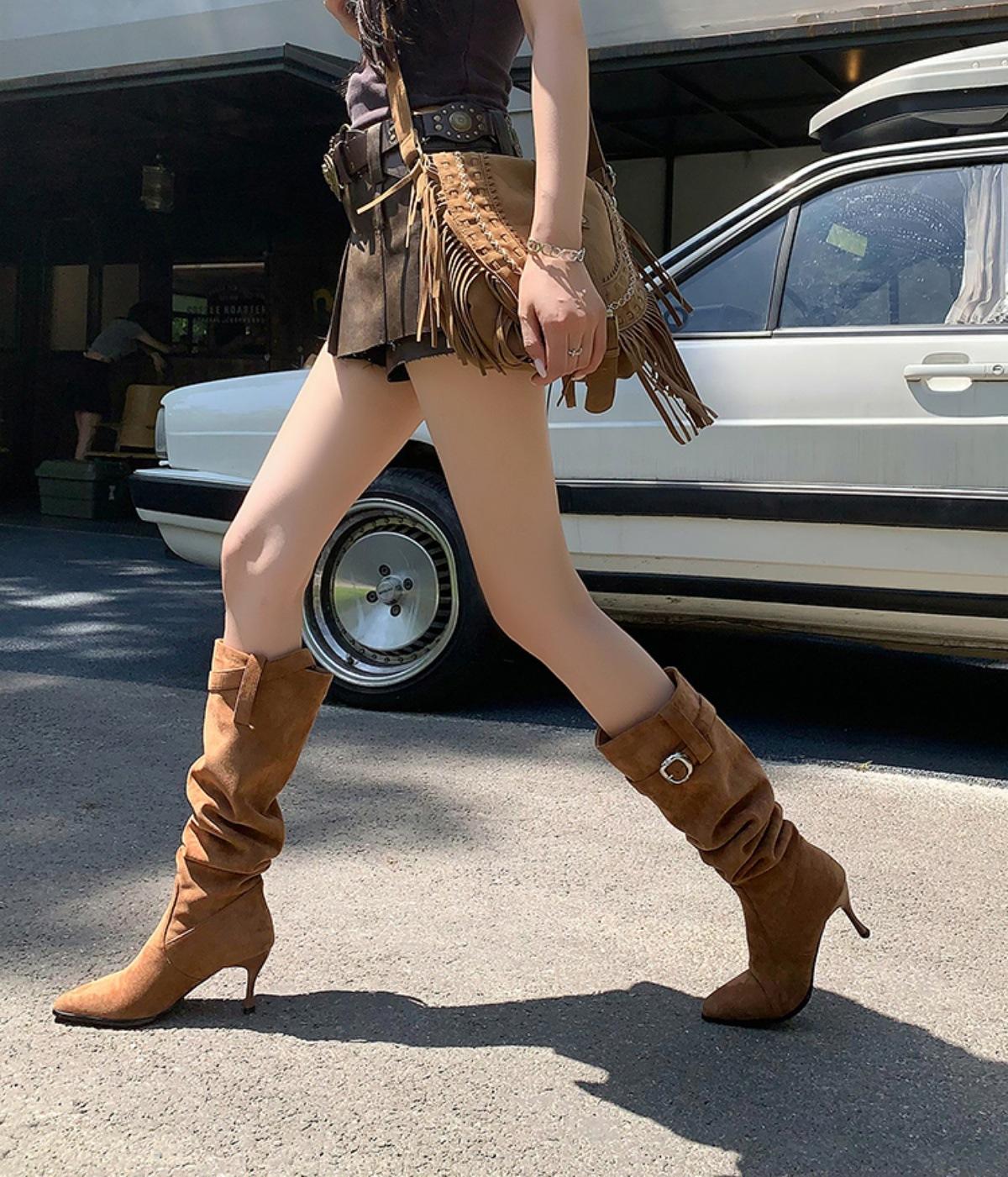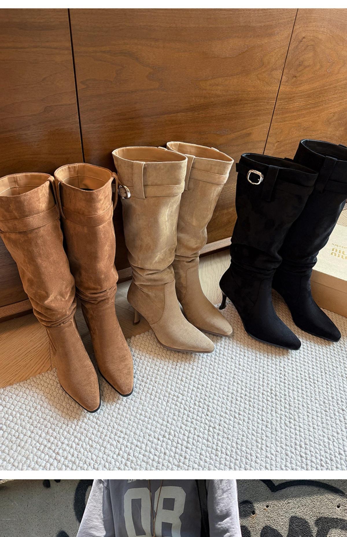 Botas Apiladas Fruncidas de Punta Europea y Americana para Mujer 2025 Otoño/Invierno Nuevo Estilo Tacón de Aguja Botas Altas hasta la Rodilla Temperamento Adelgazantes Botas Altas Mujer