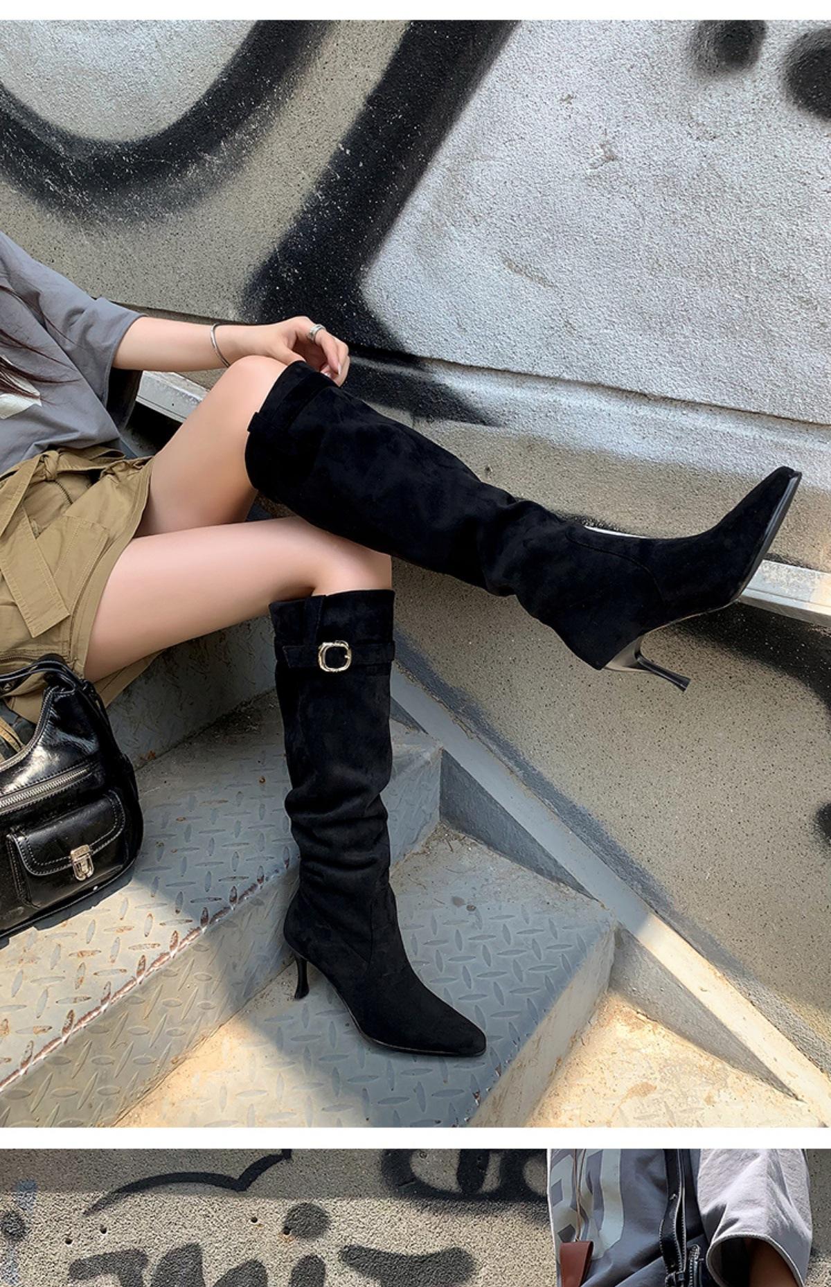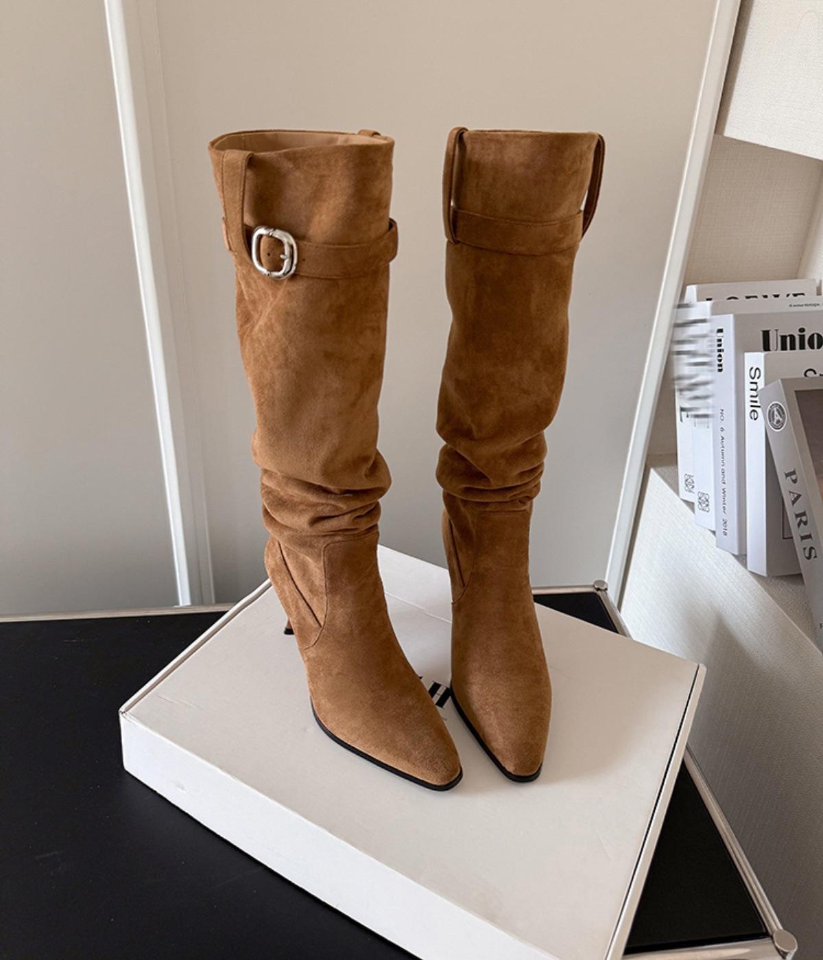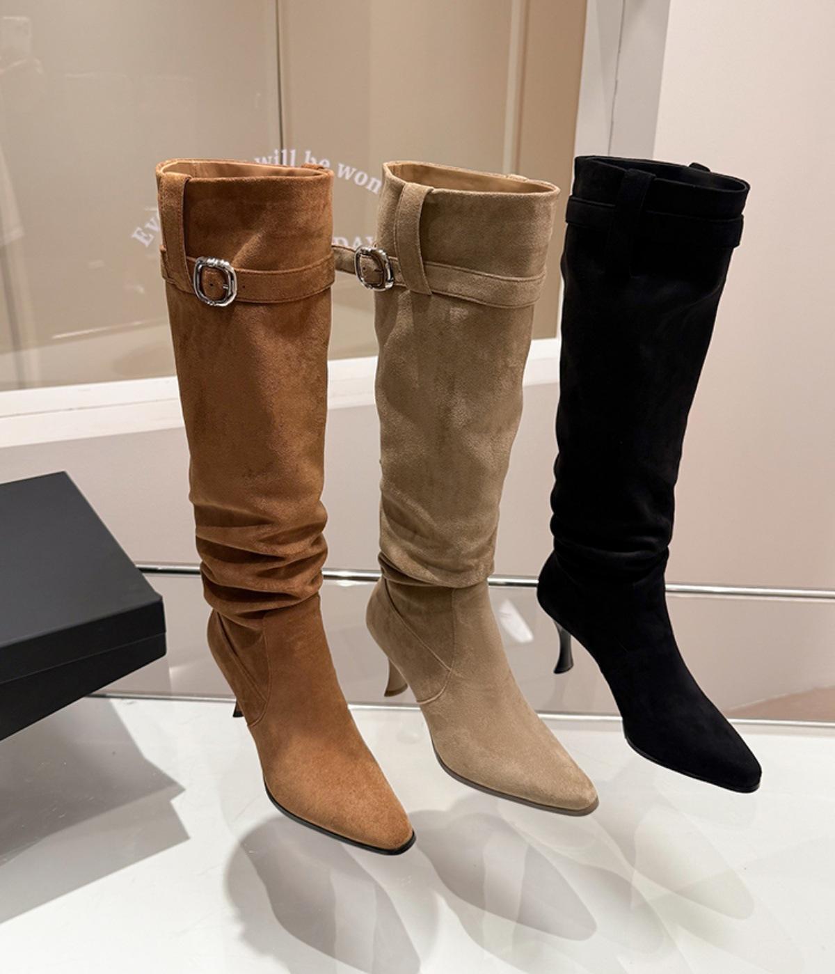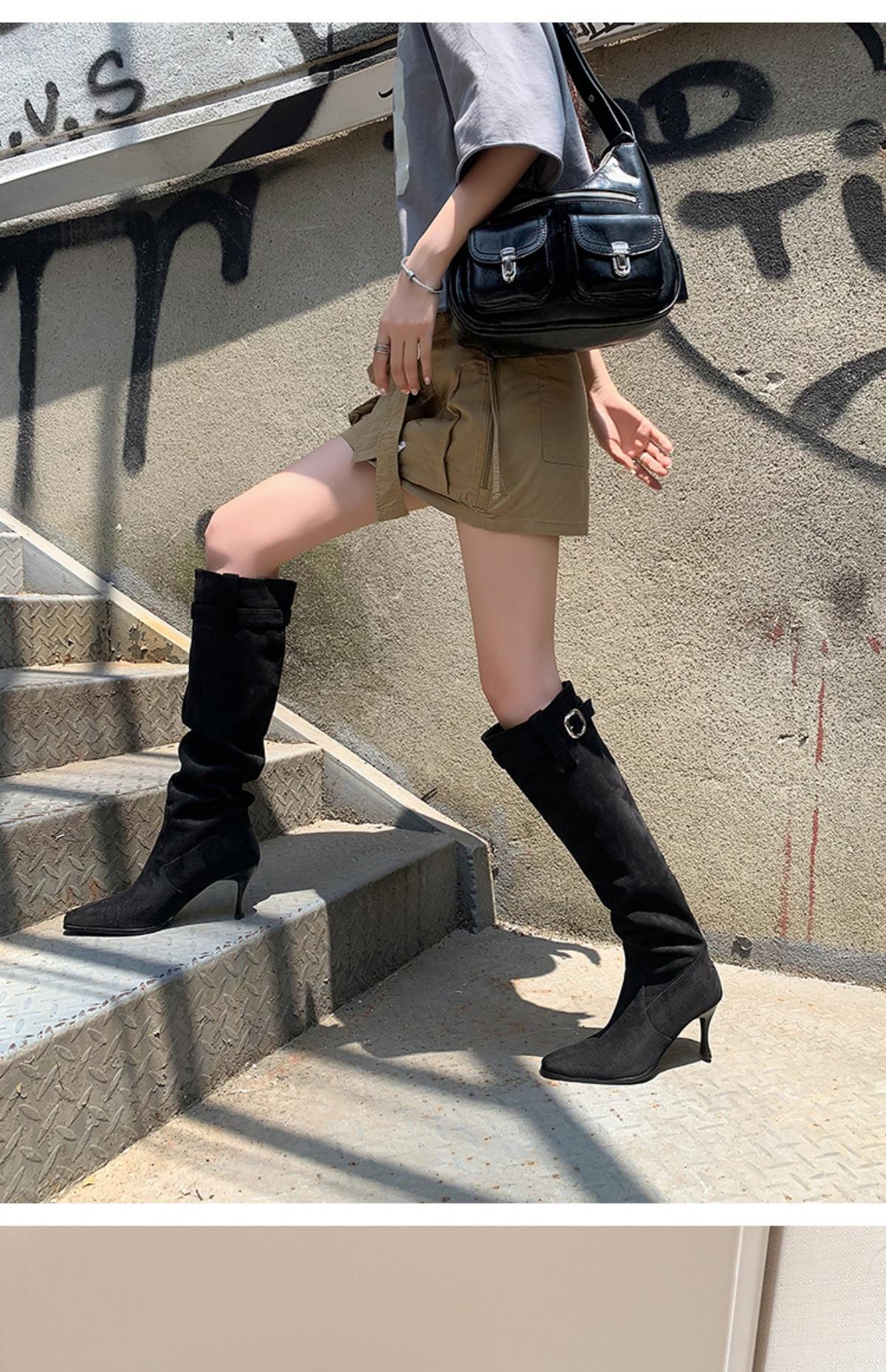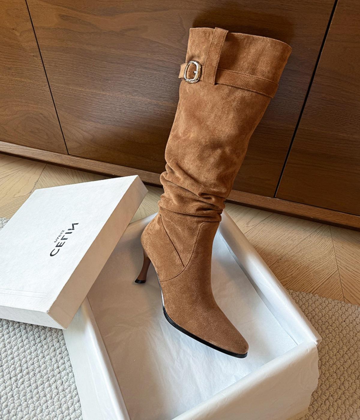 Botas Apiladas Fruncidas de Punta Europea y Americana para Mujer 2025 Otoño/Invierno Nuevo Estilo Tacón de Aguja Botas Altas hasta la Rodilla Temperamento Adelgazantes Botas Altas Mujer