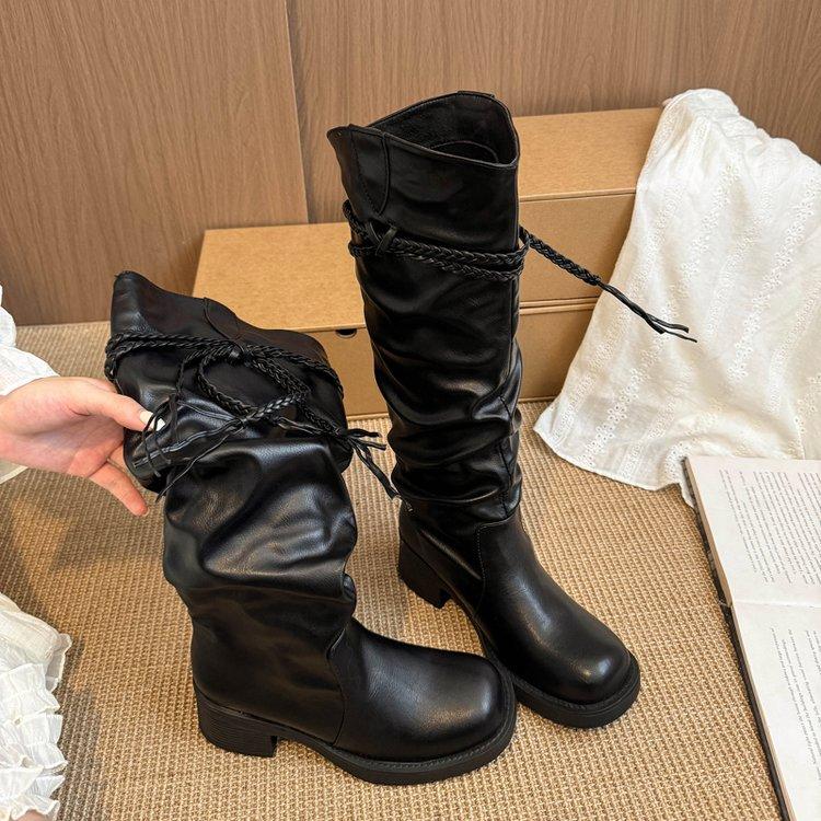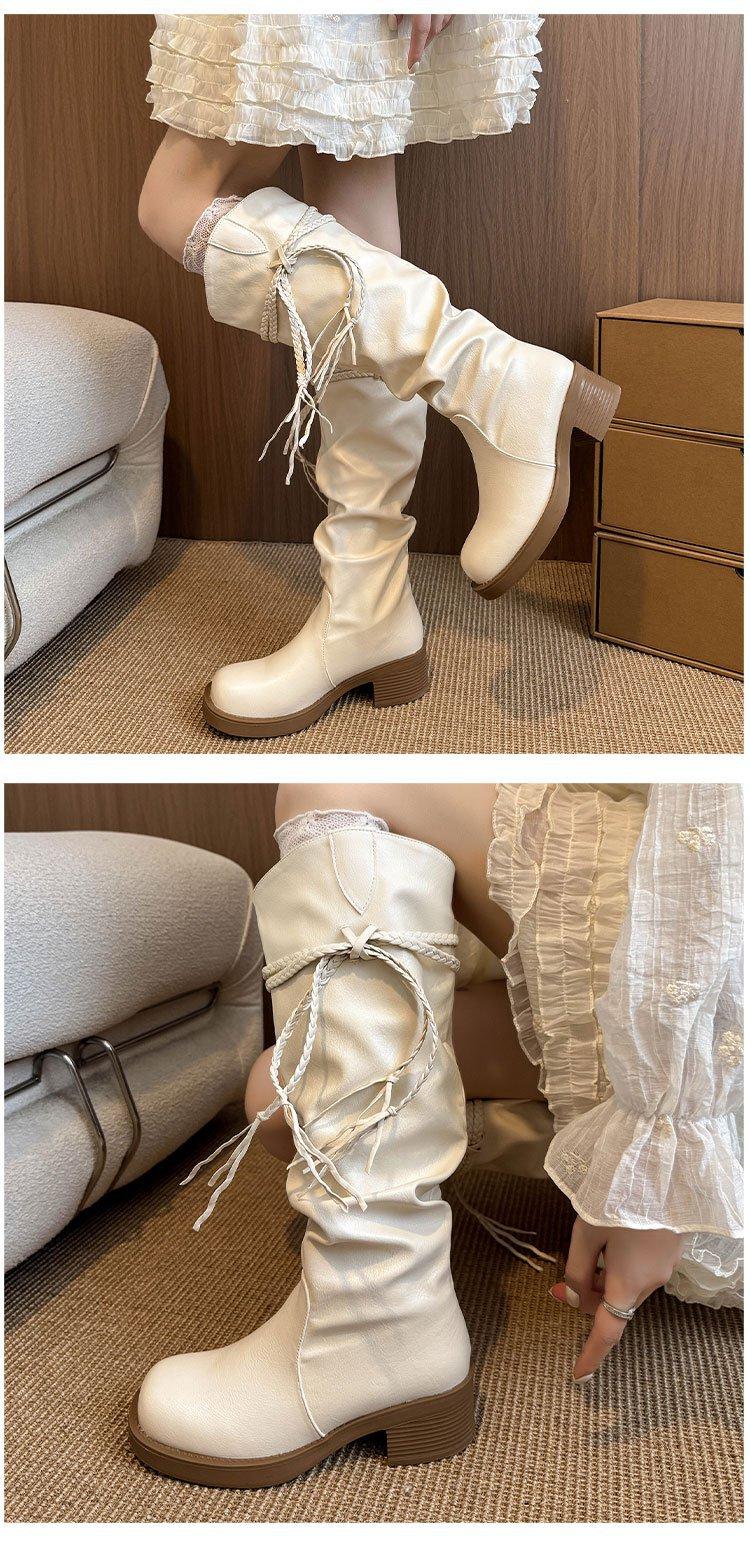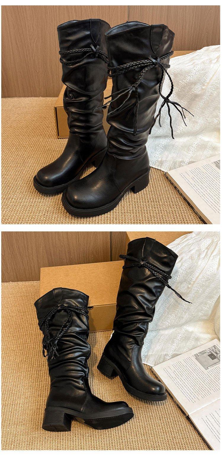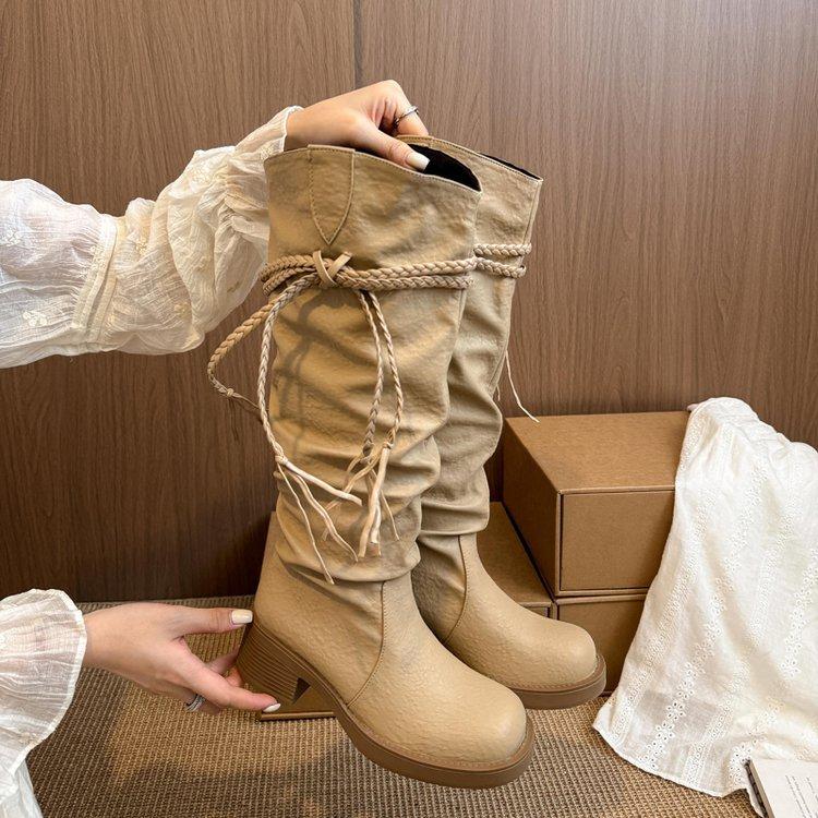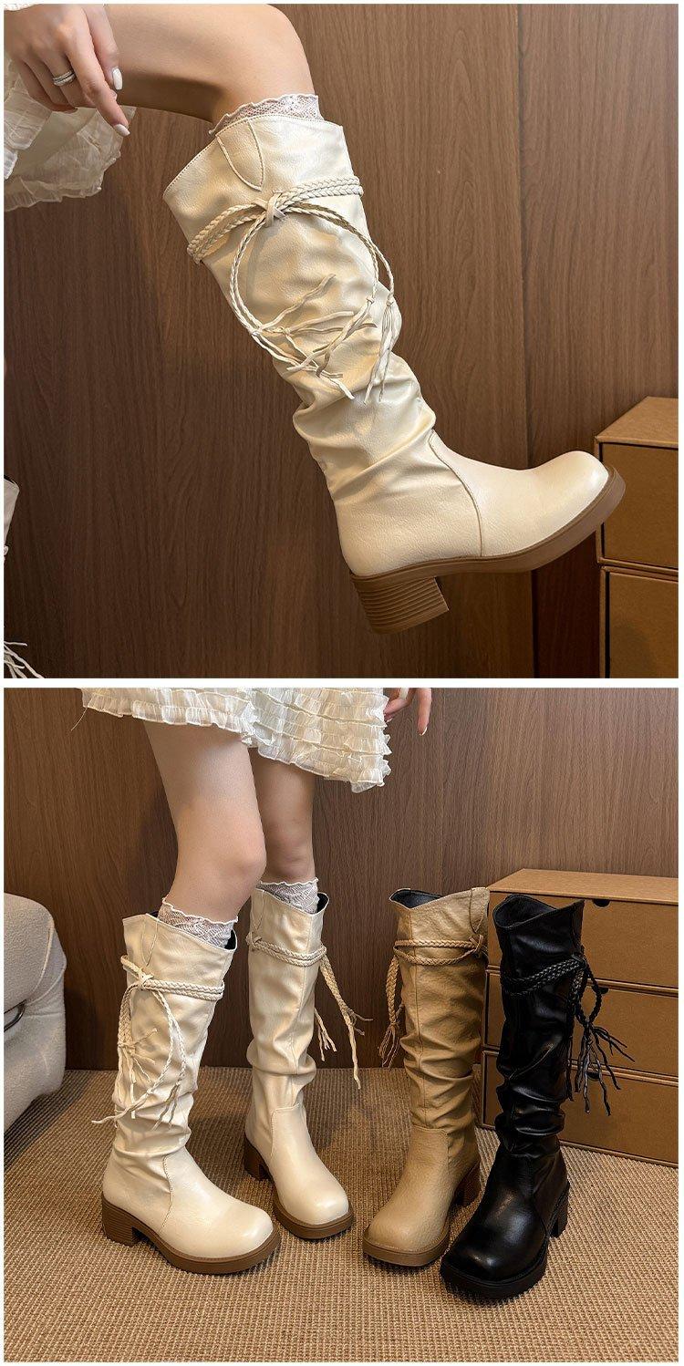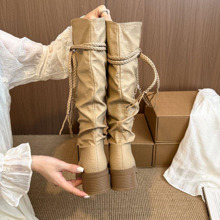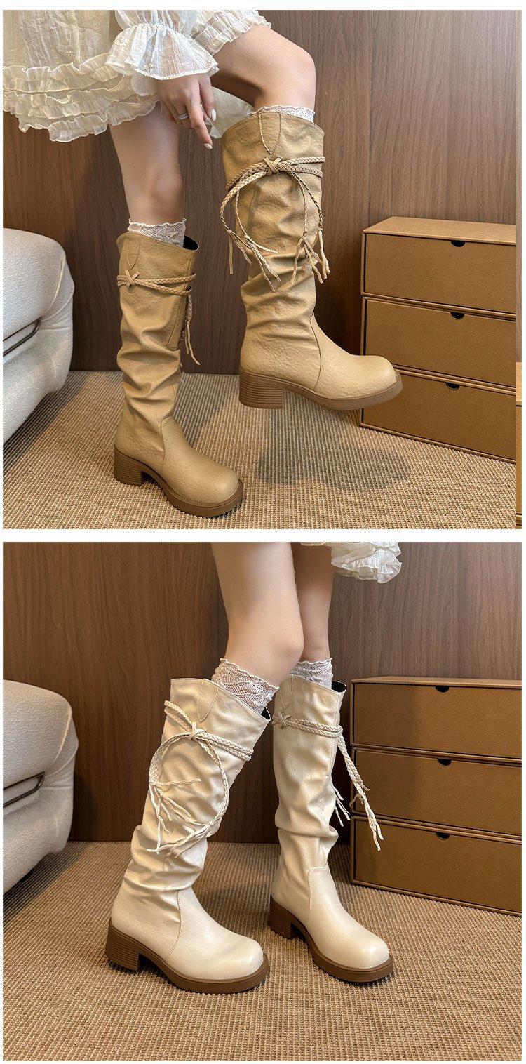 Botas de Caballero con Borlas Retro de Otoño 2025 Tacón Grueso por Encima de la Rodilla Botas Largas Adelgazantes Apiladas Punta Afilada Estilo Retro para Mujer