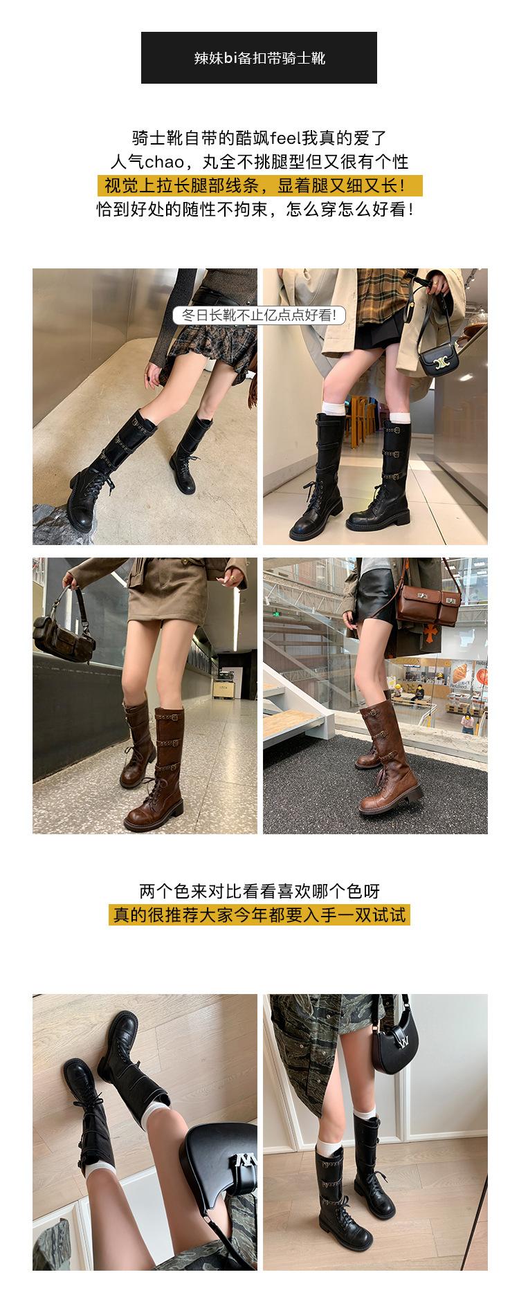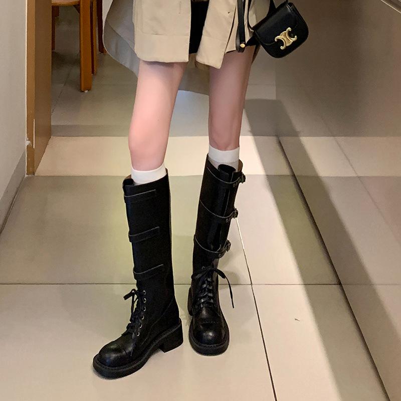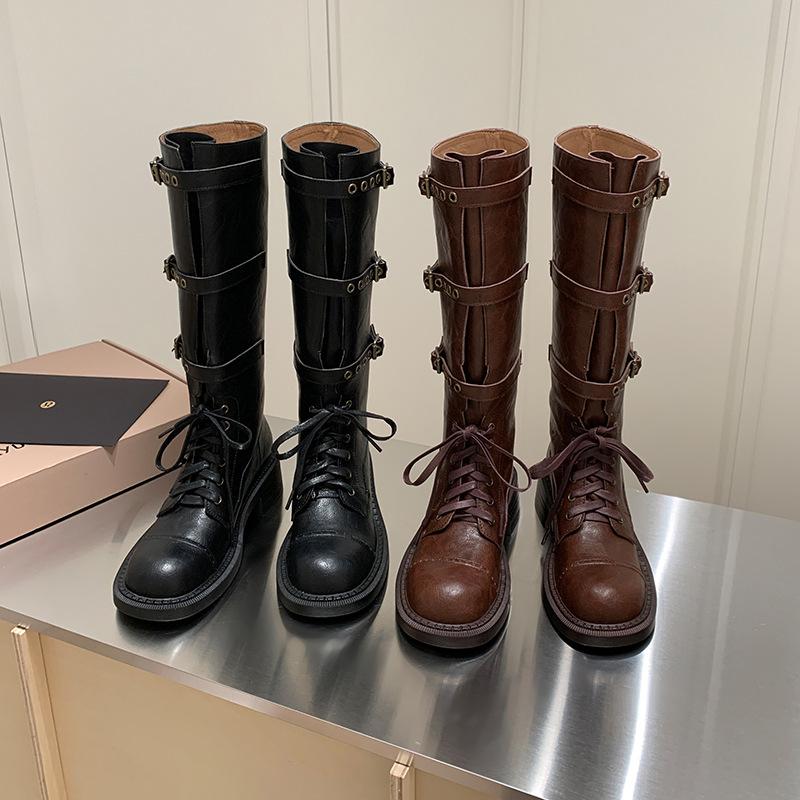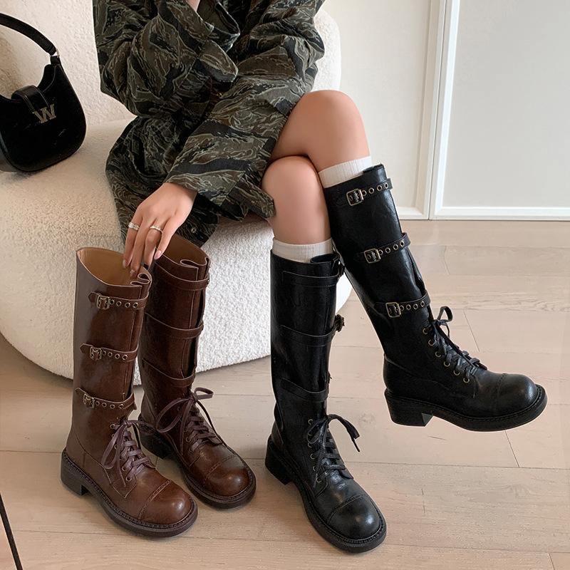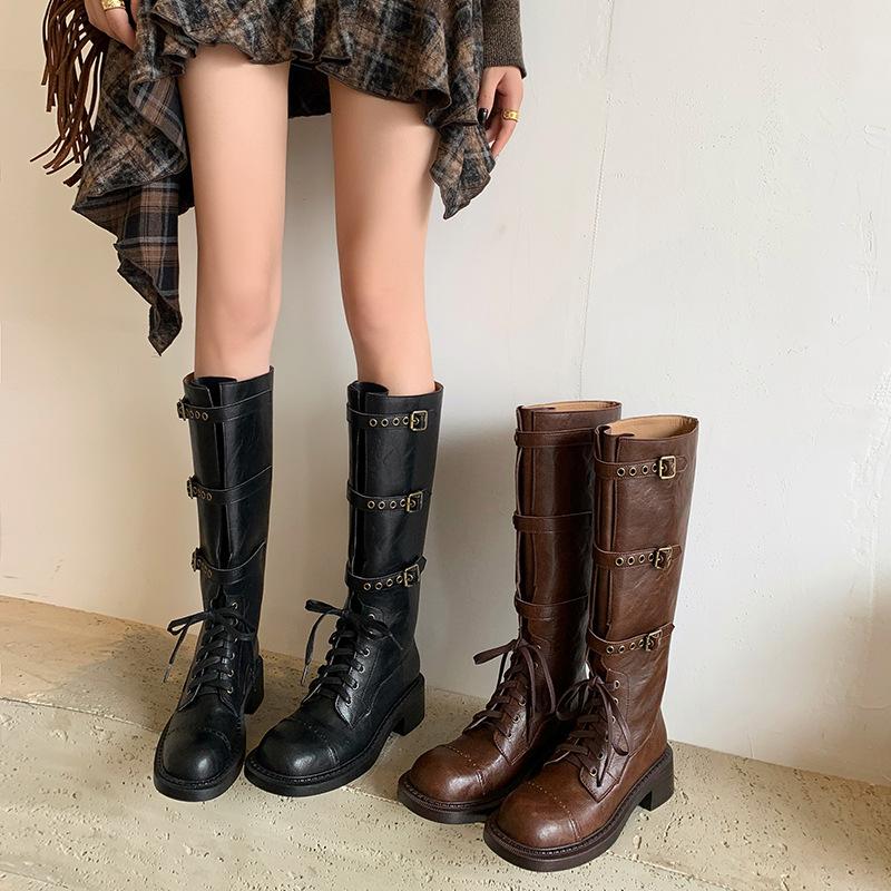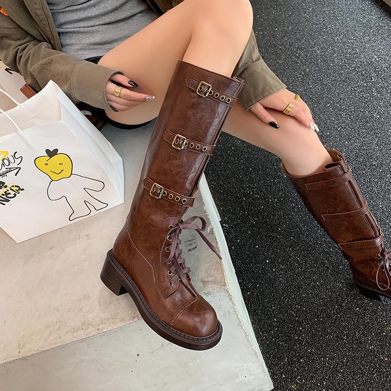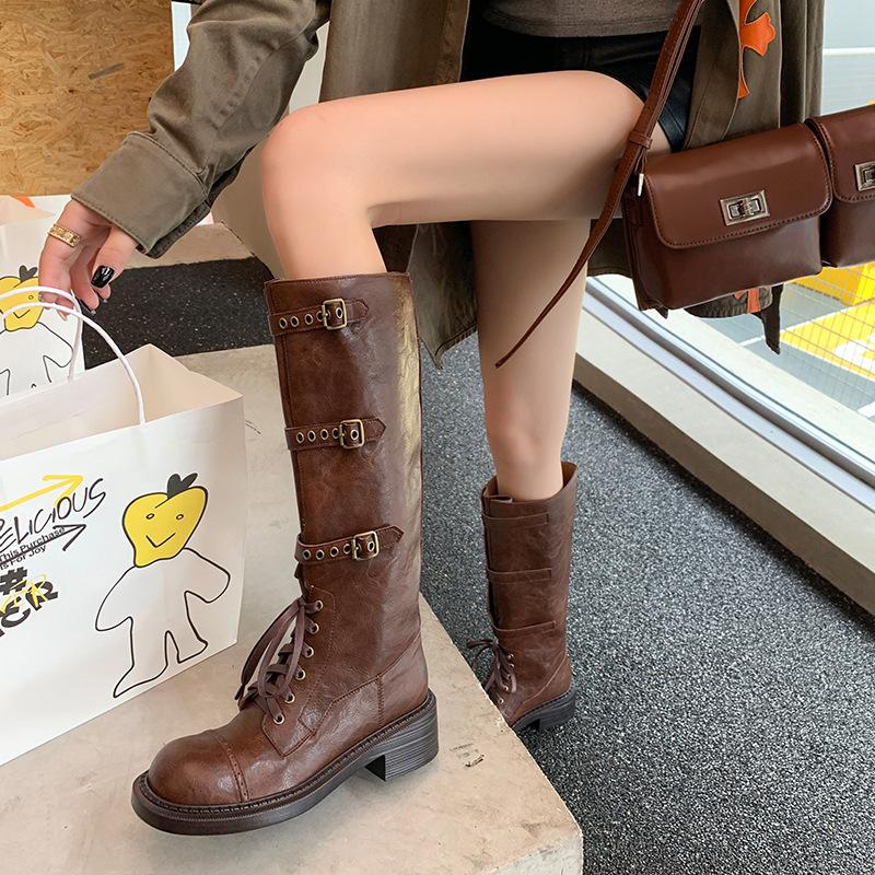 2025 Nuevas Botas de Otoño e Invierno de Punta Redonda con Hebilla de Cinturón para Mujer Botas de Moda de Tacón Grueso Botas de Caballero Botas Altas de Motociclista