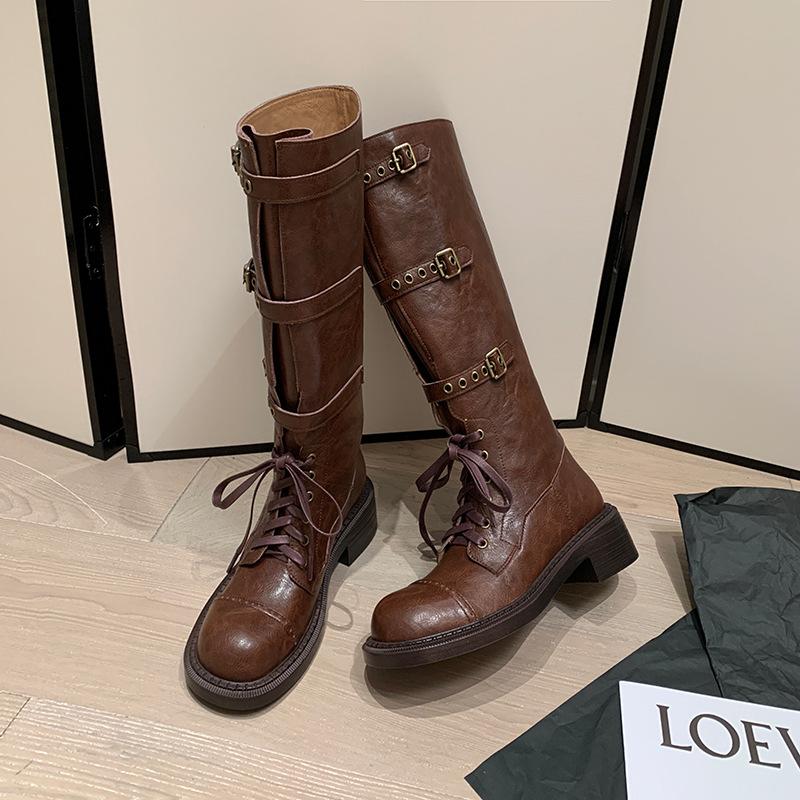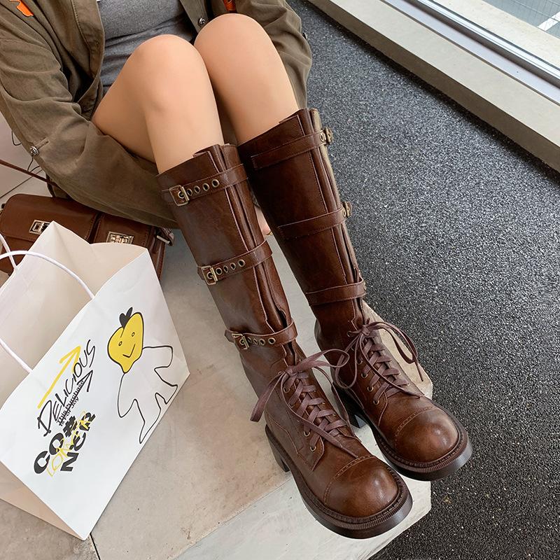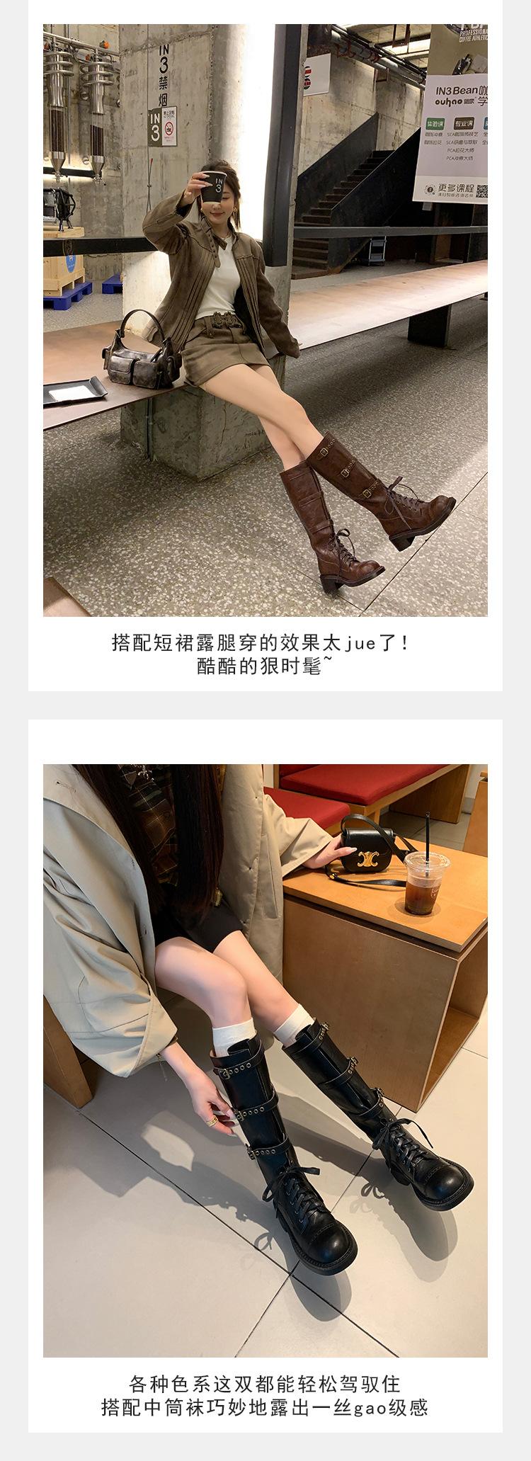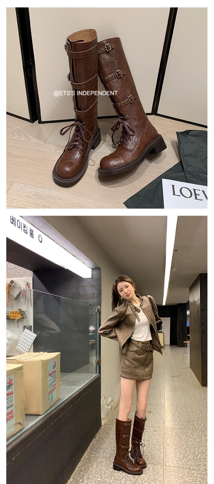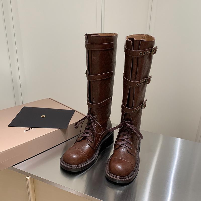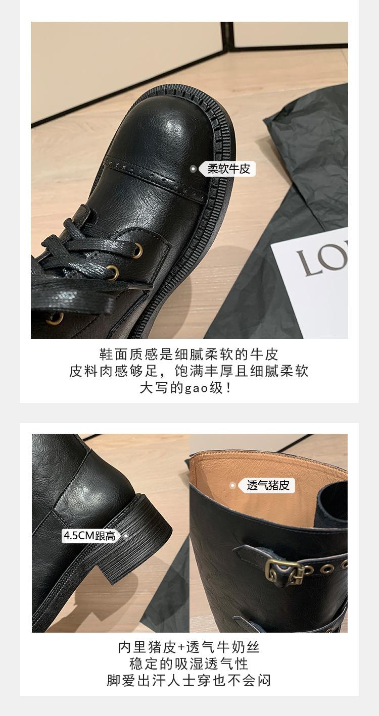 2025 Nuevas Botas de Otoño e Invierno de Punta Redonda con Hebilla de Cinturón para Mujer Botas de Moda de Tacón Grueso Botas de Caballero Botas Altas de Motociclista