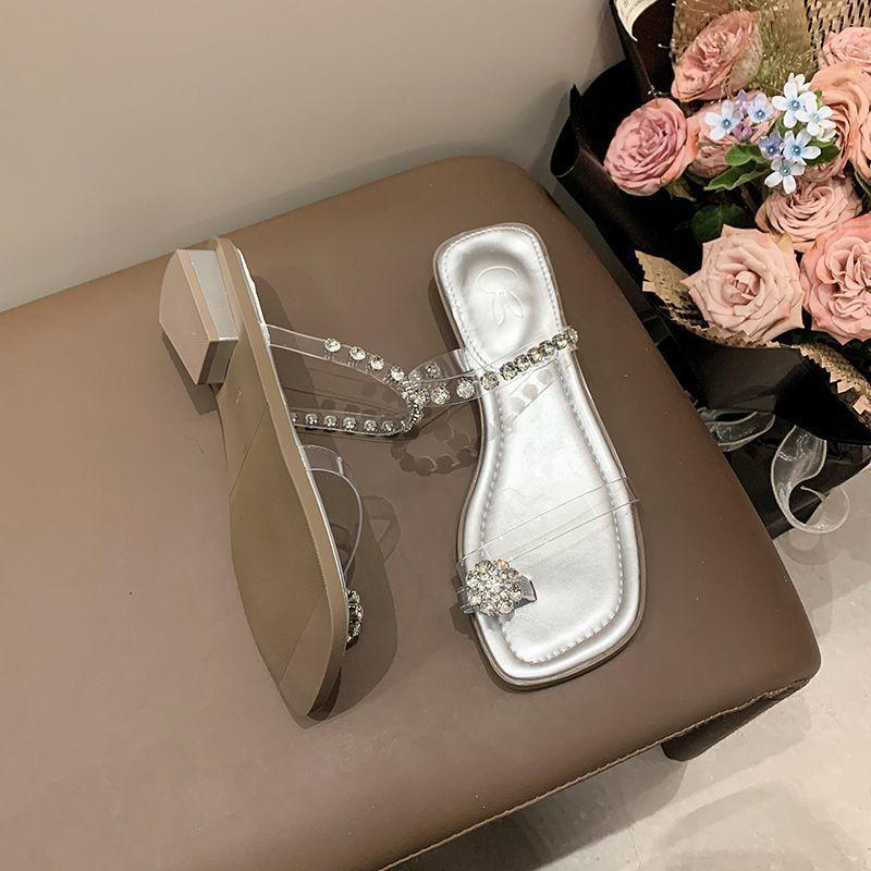 Verano 2025 Nuevo Nicho Tacón Bajo Pedrería Anillo para el Dedo Pantuflas Mujer Verano Moda Playa Estilo Vacaciones Sandalias Mujer