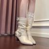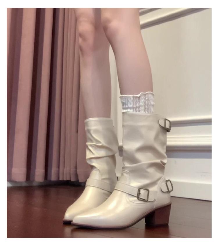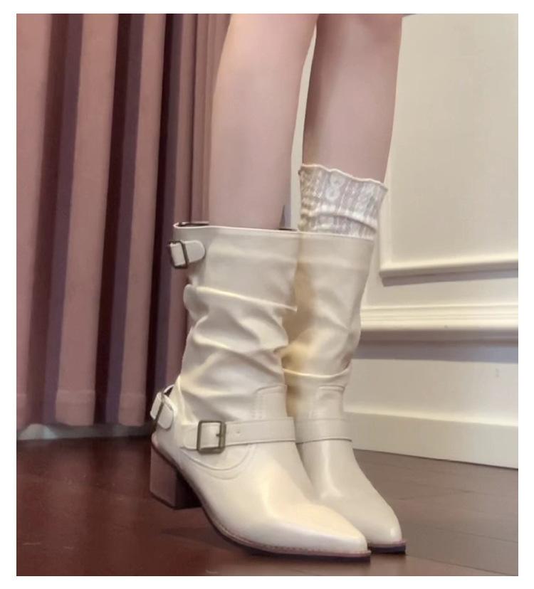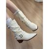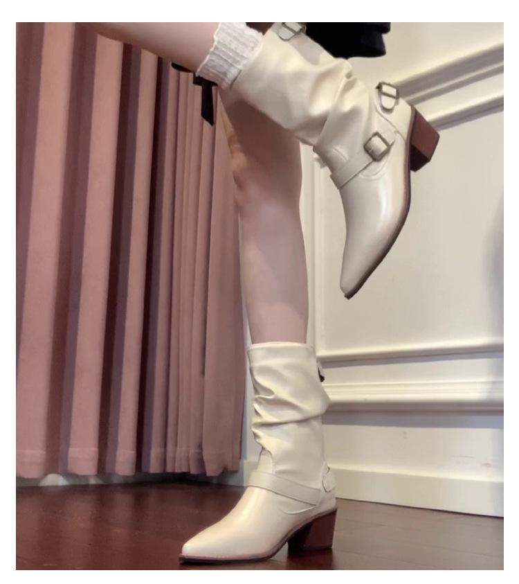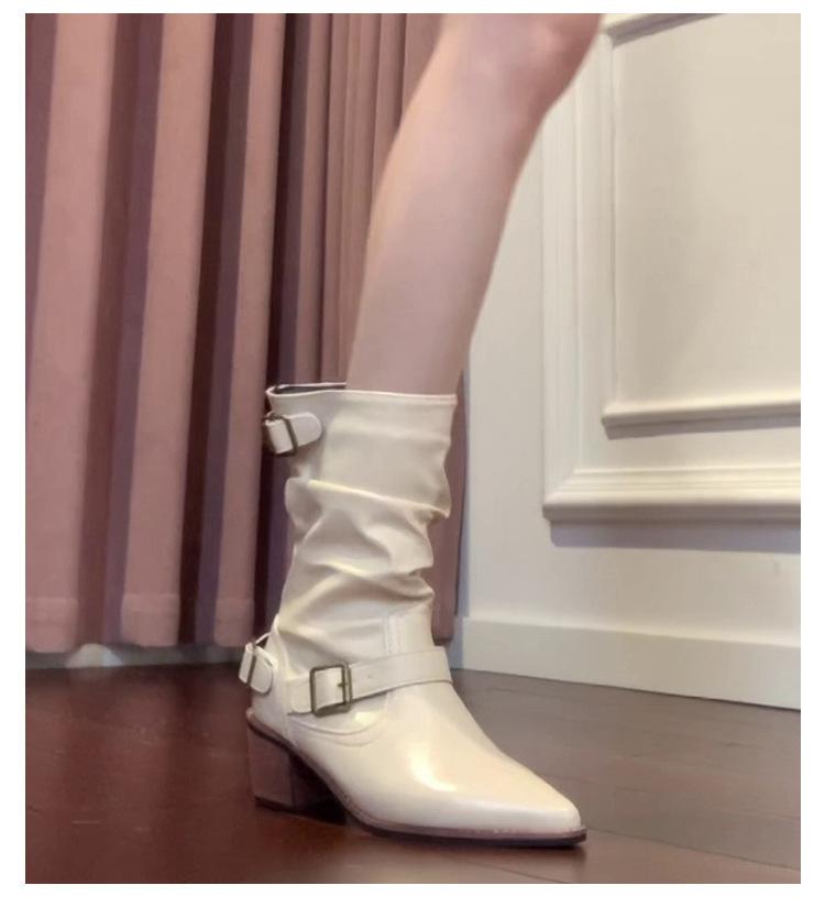 Punta Puntiaguda Hebilla de Cinturón Botines al Tobillo de Tacón Grueso Blanco para Mujer Adelgazantes Temperamento Francés Botas de Caballero Botas de Vaquero Occidental