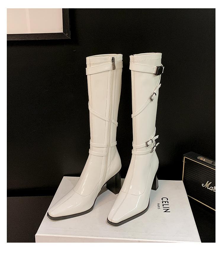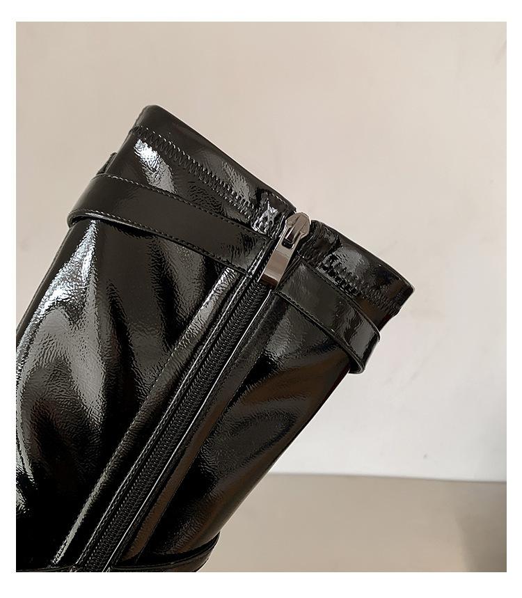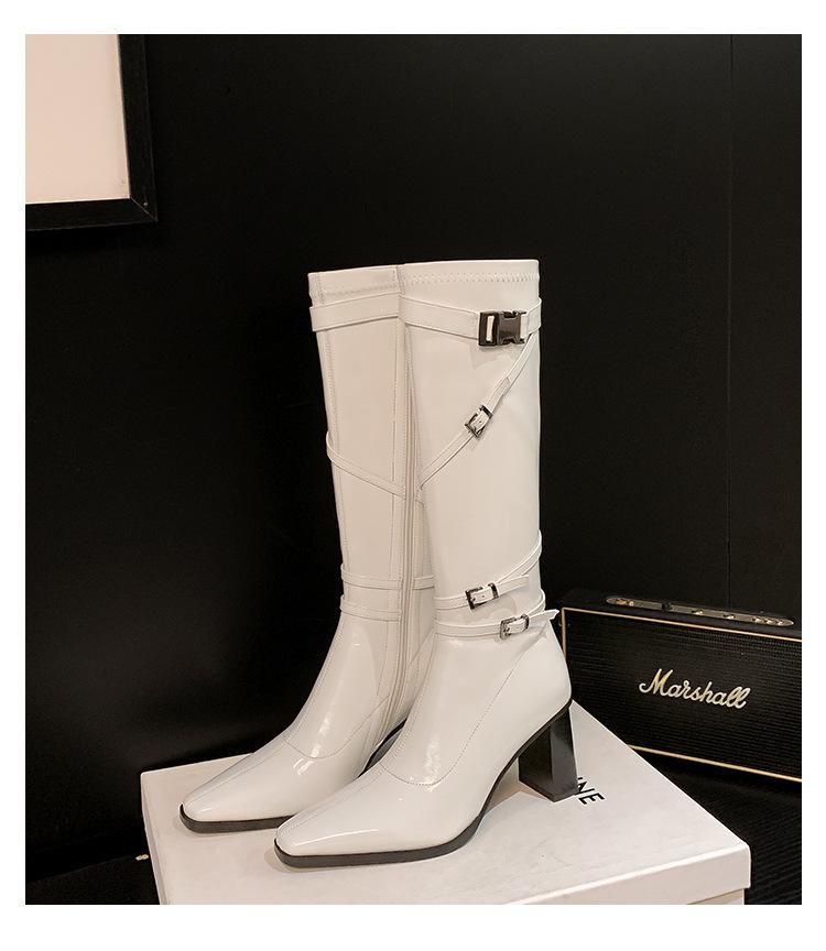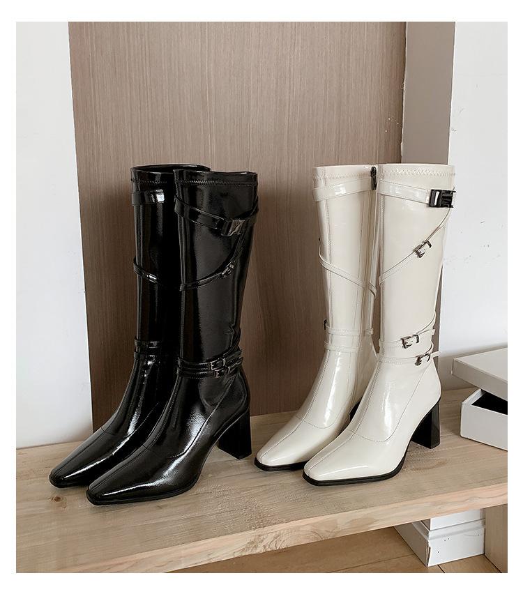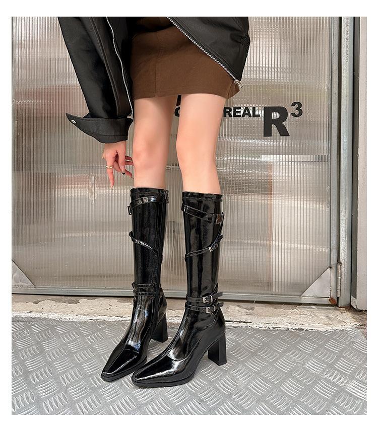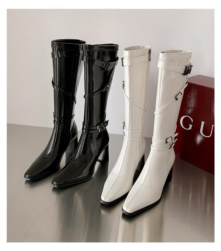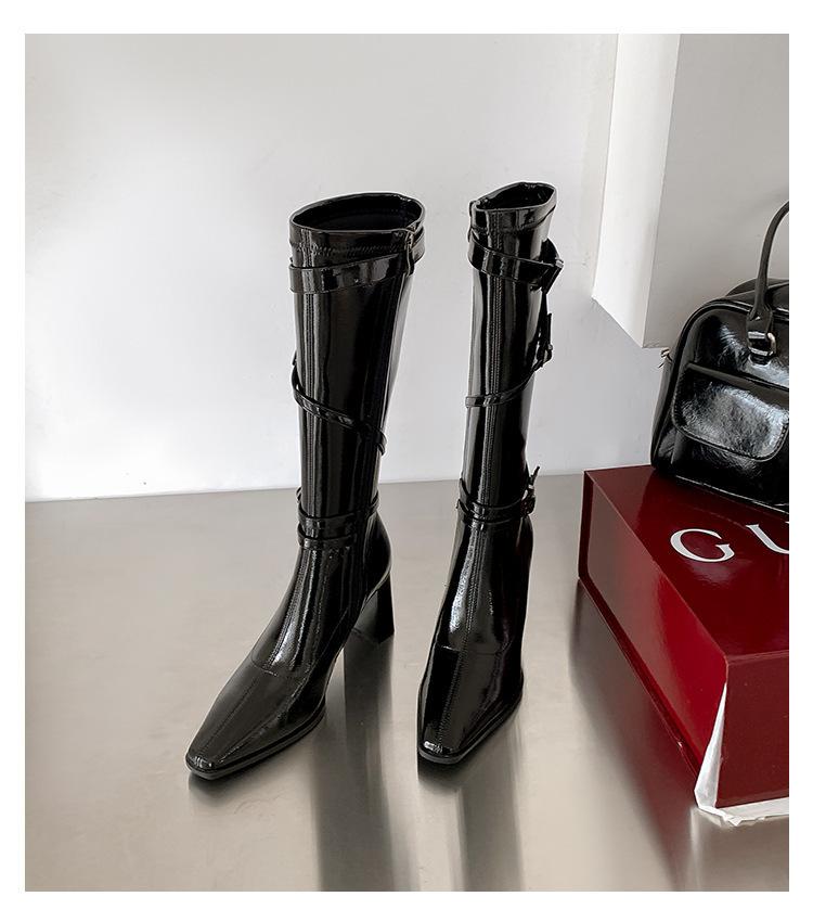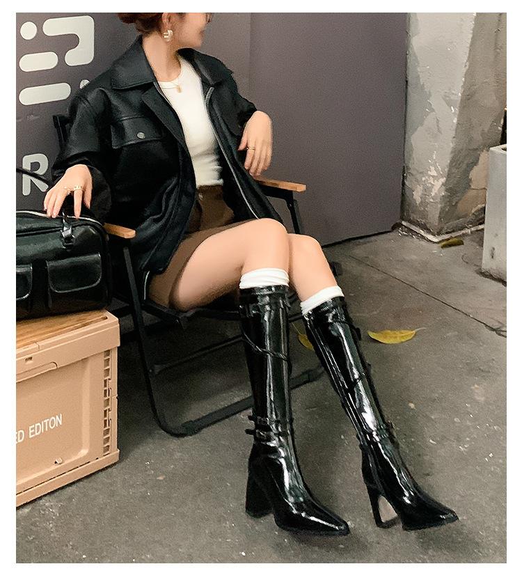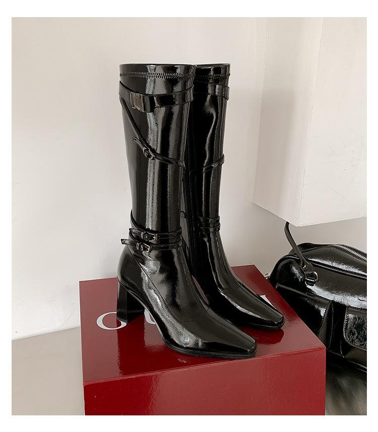Botas de Tacón Alto hasta el Muslo para Mujer Europeas y Americanas de Charol Tacón Grueso Punta Cuadrada Hebilla Botas de Caballero por Encima de la Rodilla Botas de Moda