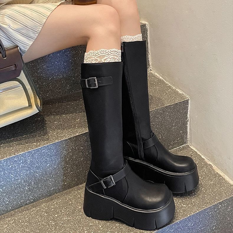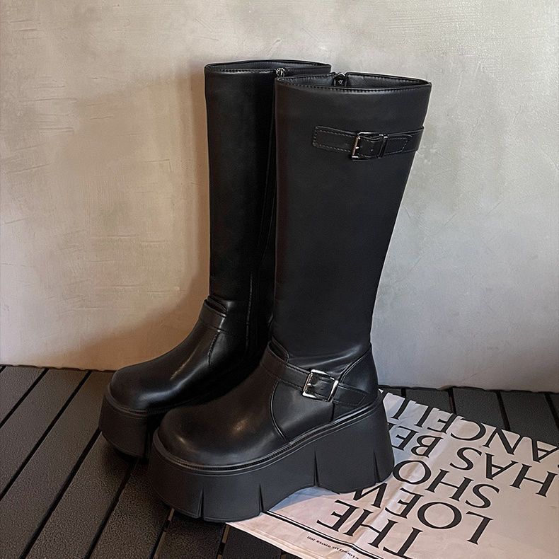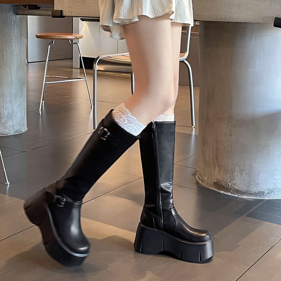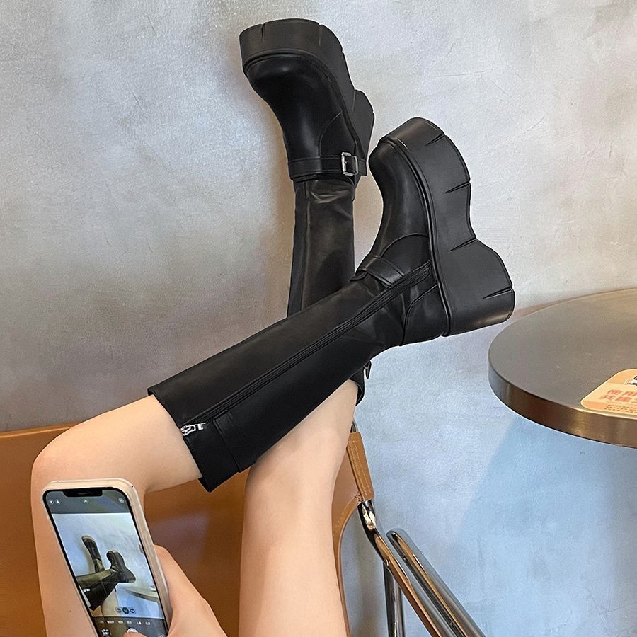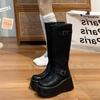 Botas Largas Negras Versátiles de Estilo Británico por Encima de la Rodilla con Suela Gruesa para Mujer 2024 Nuevo Otoño Aumento de Altura Adelgazantes Botas de Caballero