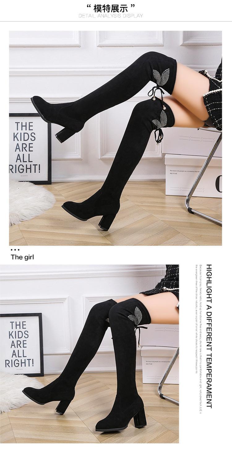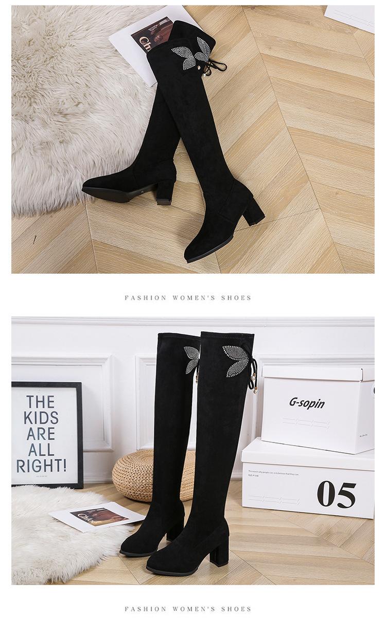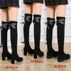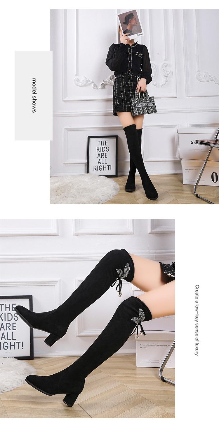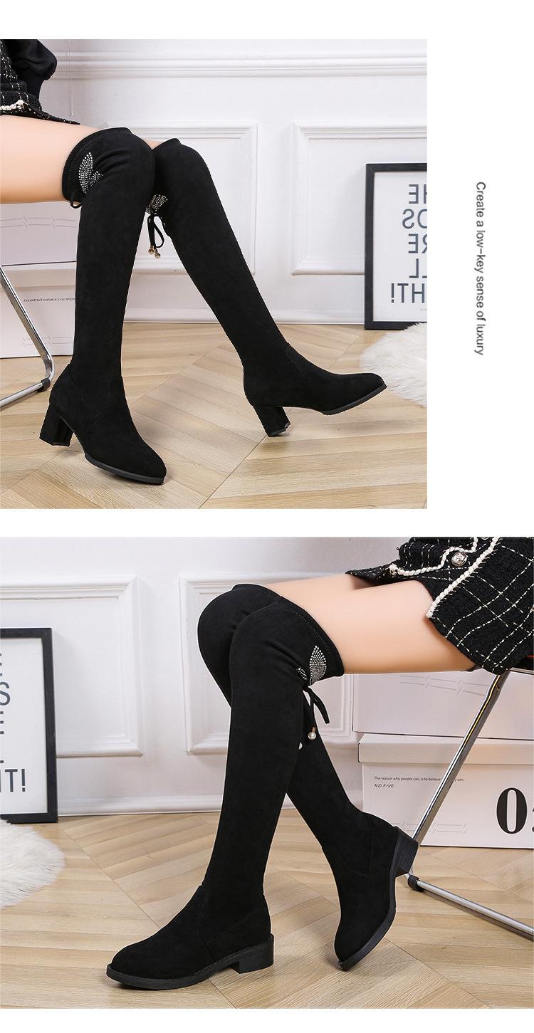 Botas por encima de la rodilla para mujer otoño e invierno 2023 Nuevas botas de tacón grueso con lazo de pedrería de tacón alto adelgazantes elásticas