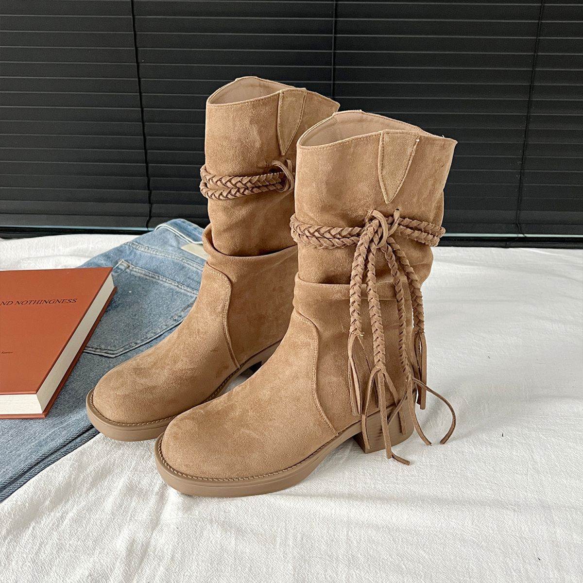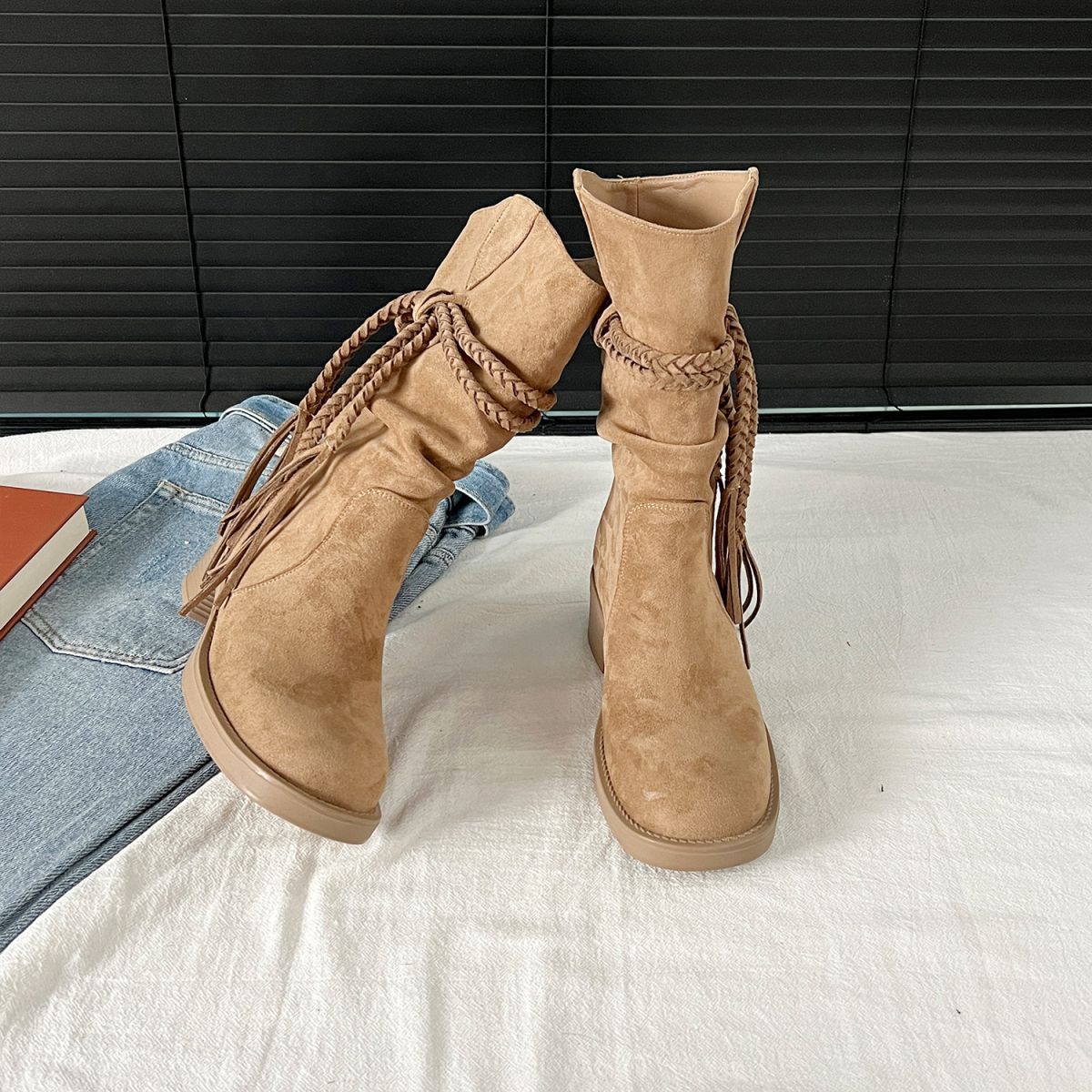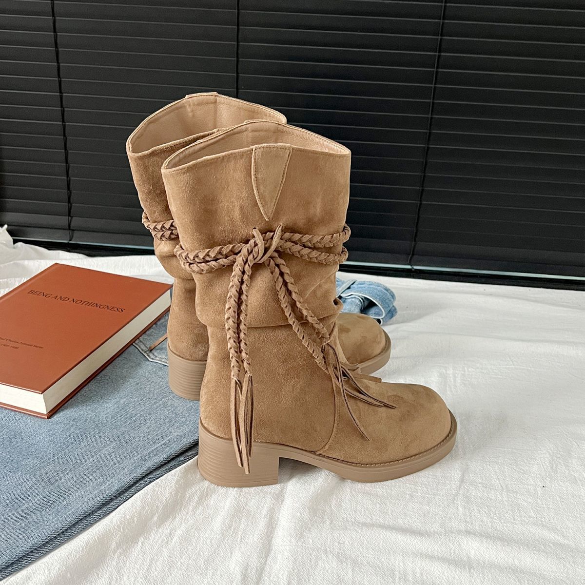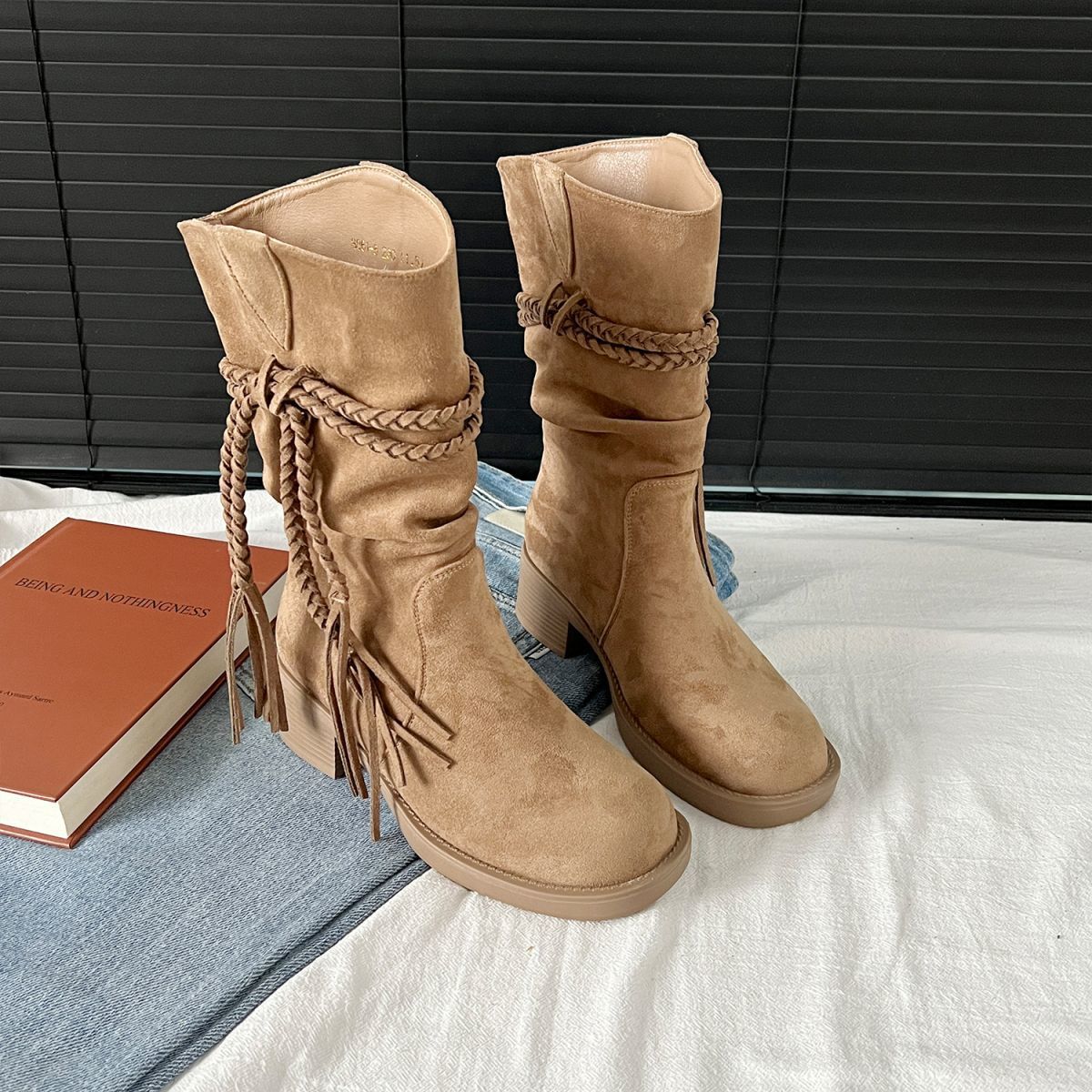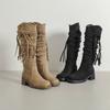 Otoño 2025 Nuevo Estilo Retro Yermo Borla Botas de Caballero Tacón Grueso Sobre la Rodilla Botas Largas Adelgazantes Apiladas Mujeres