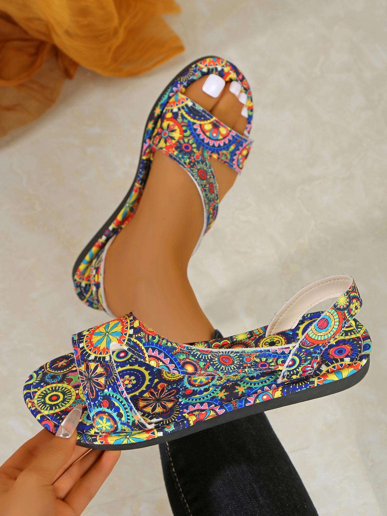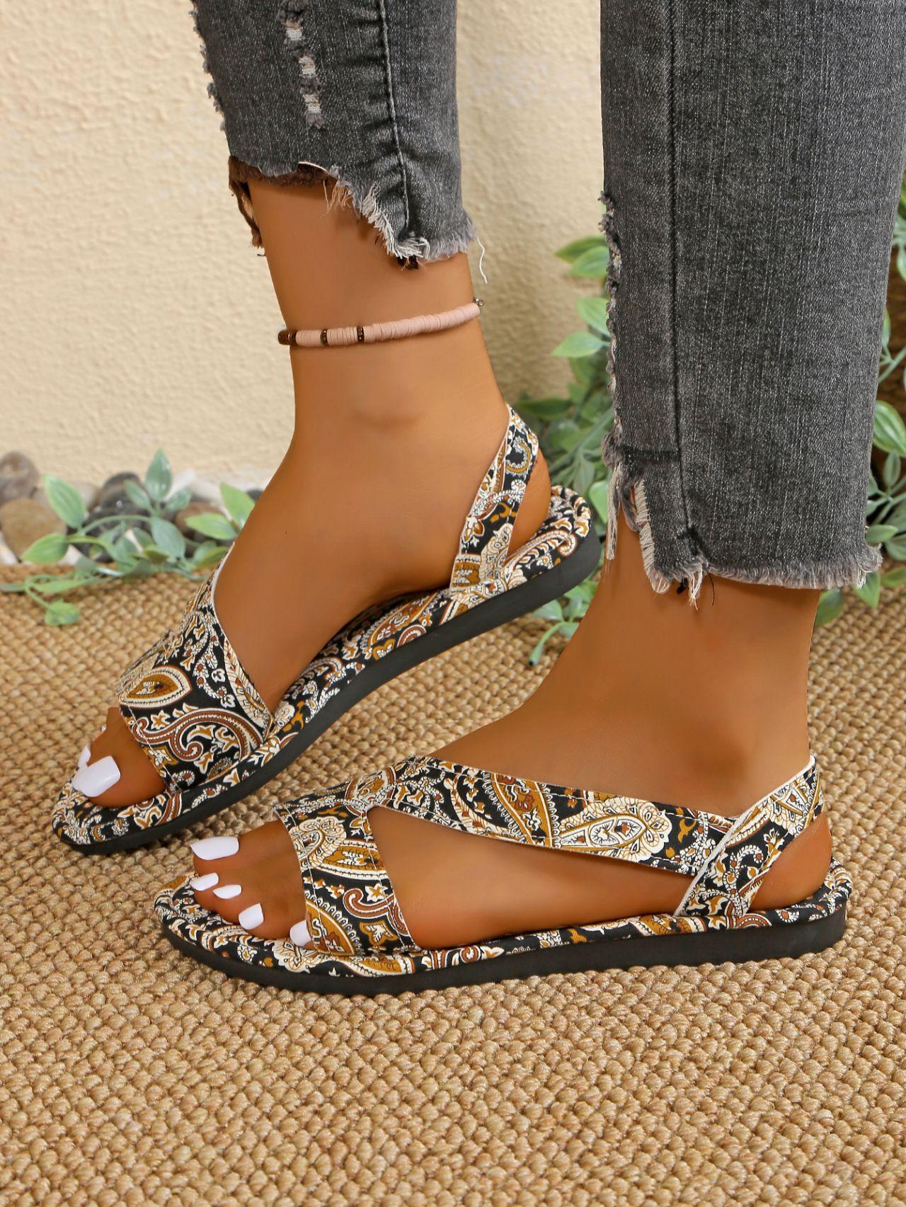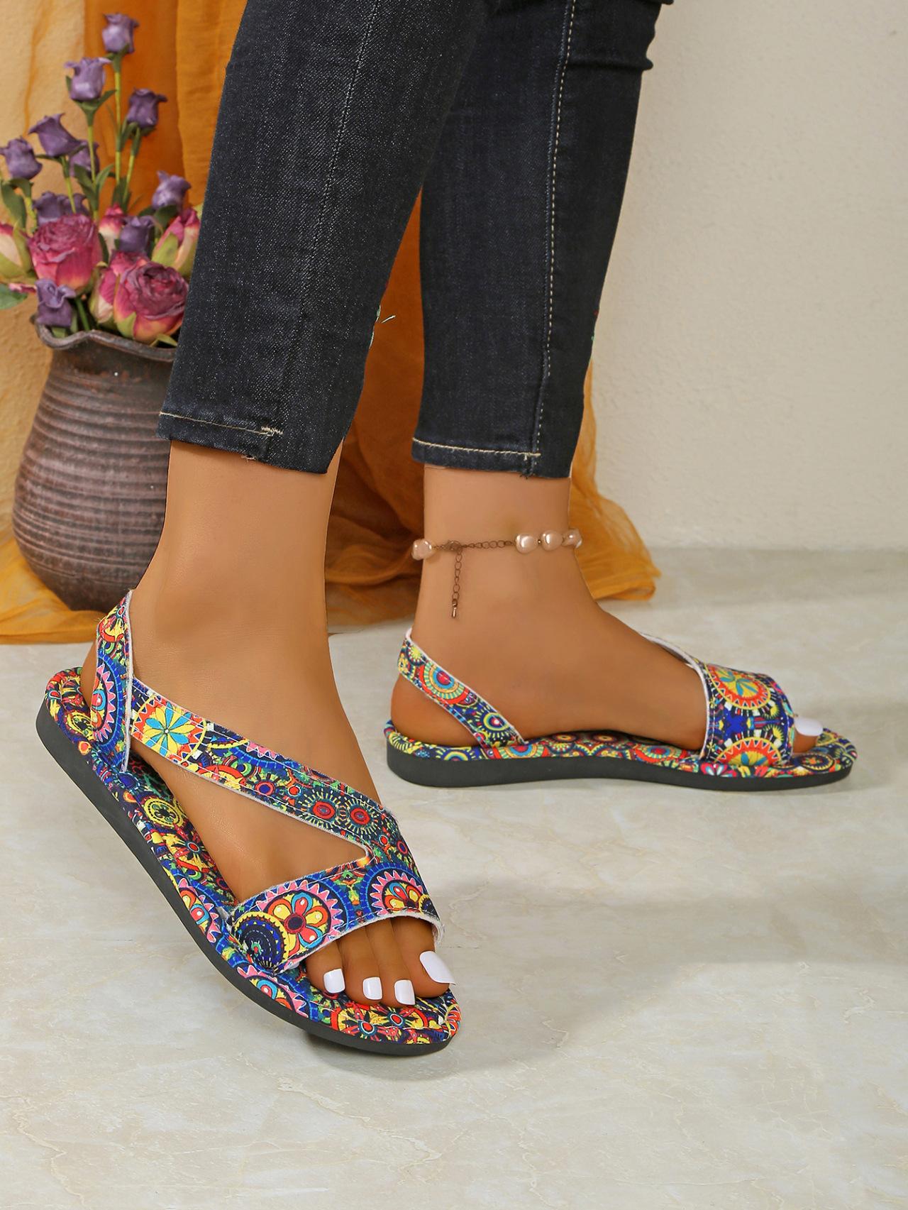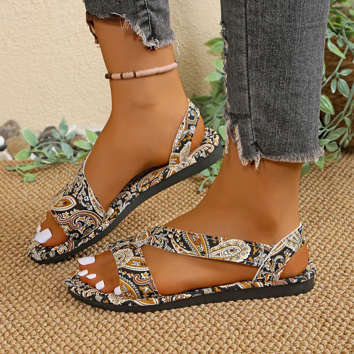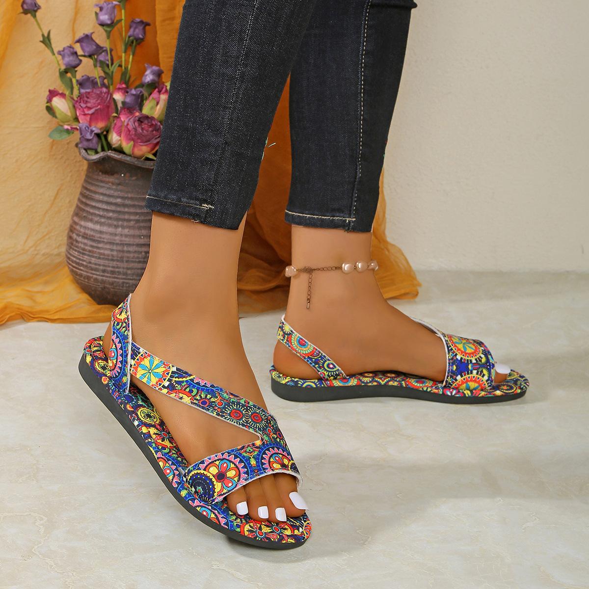 Zapatillas de Talla Grande para Mujer de Comercio Exterior 2025 Verano Nuevo Suela Plana Estampadas de Dedo Estilo Étnico Bohemio Sandalias Mujer