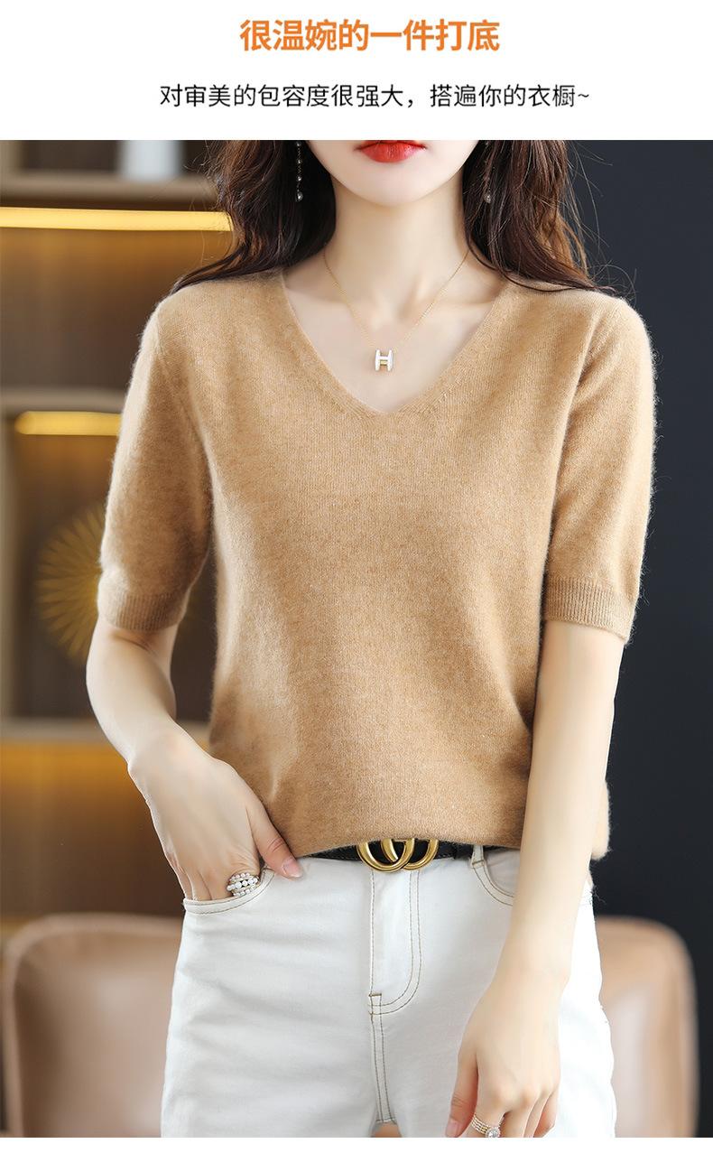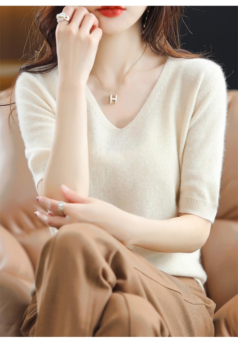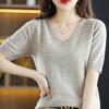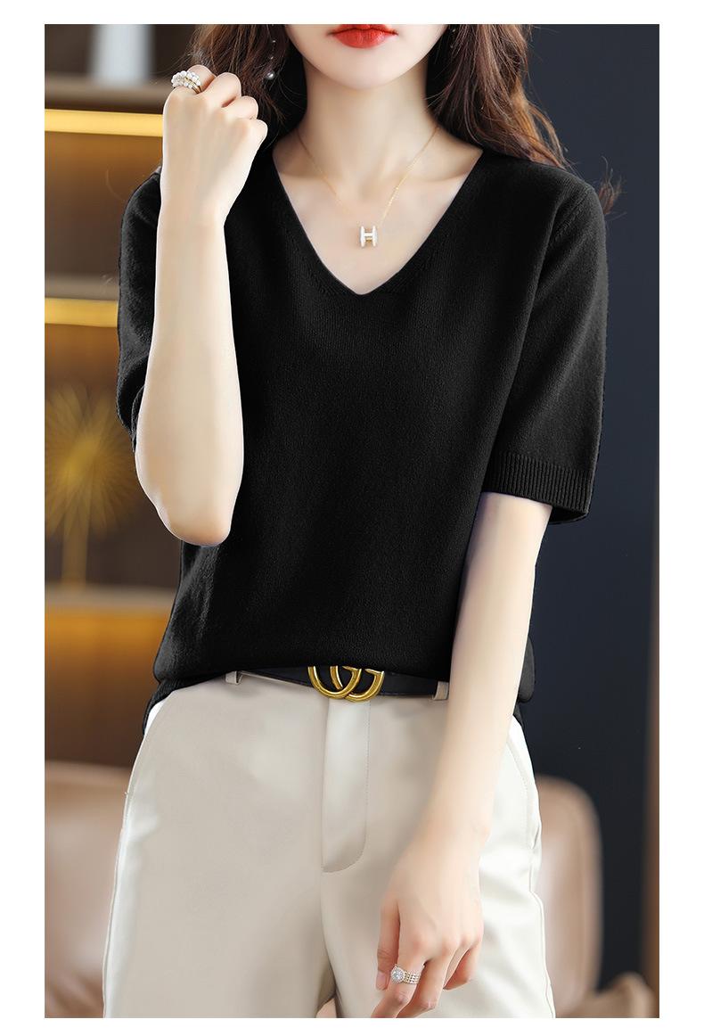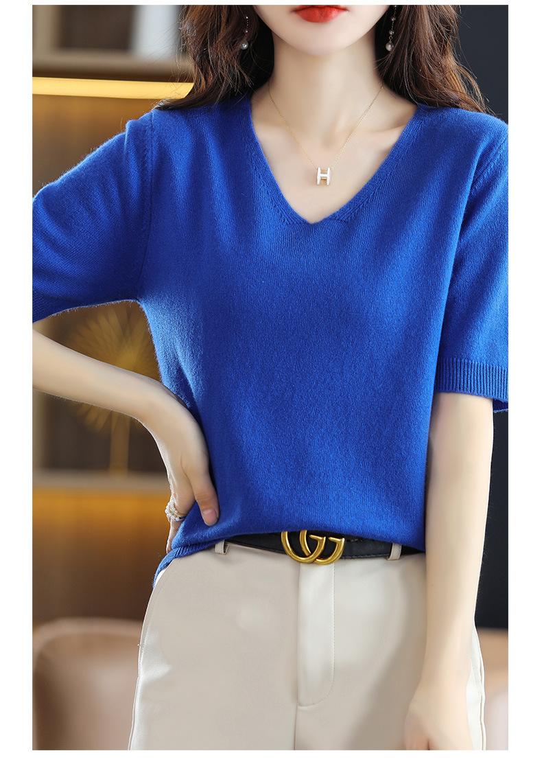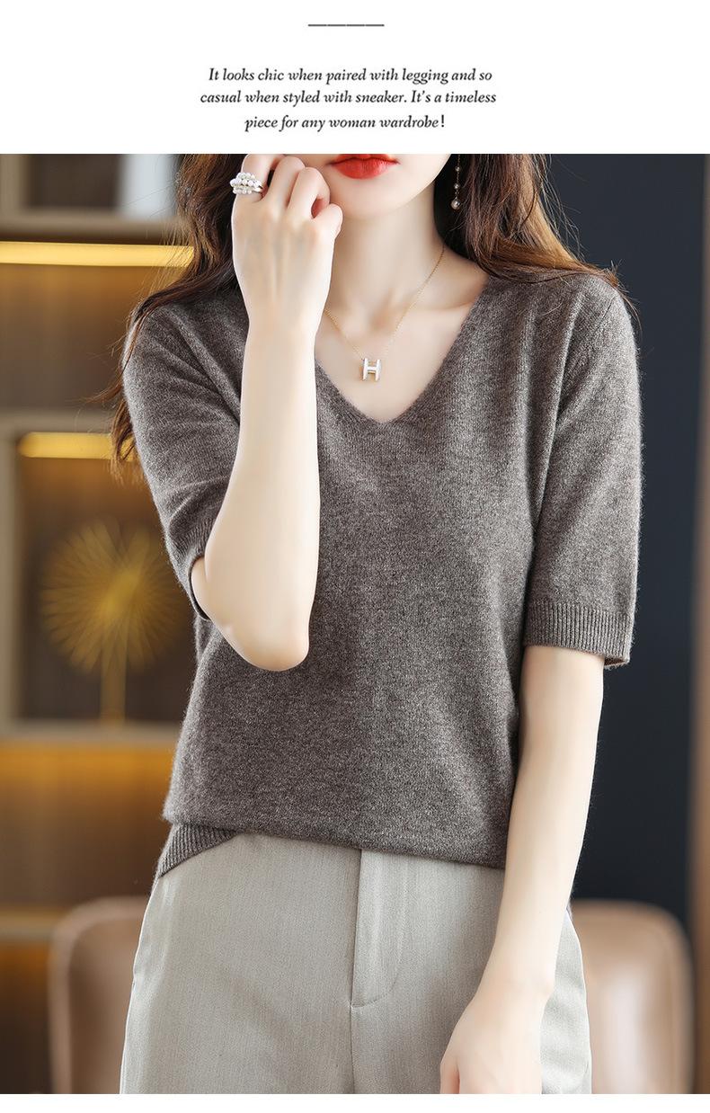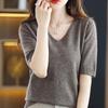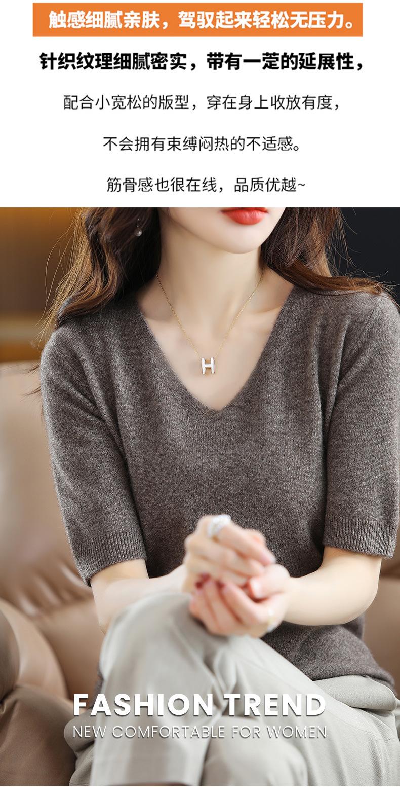 Tejido de punto básico de manga tres cuartos para primavera y otoño transfronterizo para mujer, suéter tipo jersey con cuello en V, holgado, casual, estilo coreano, top de manga corta, cien