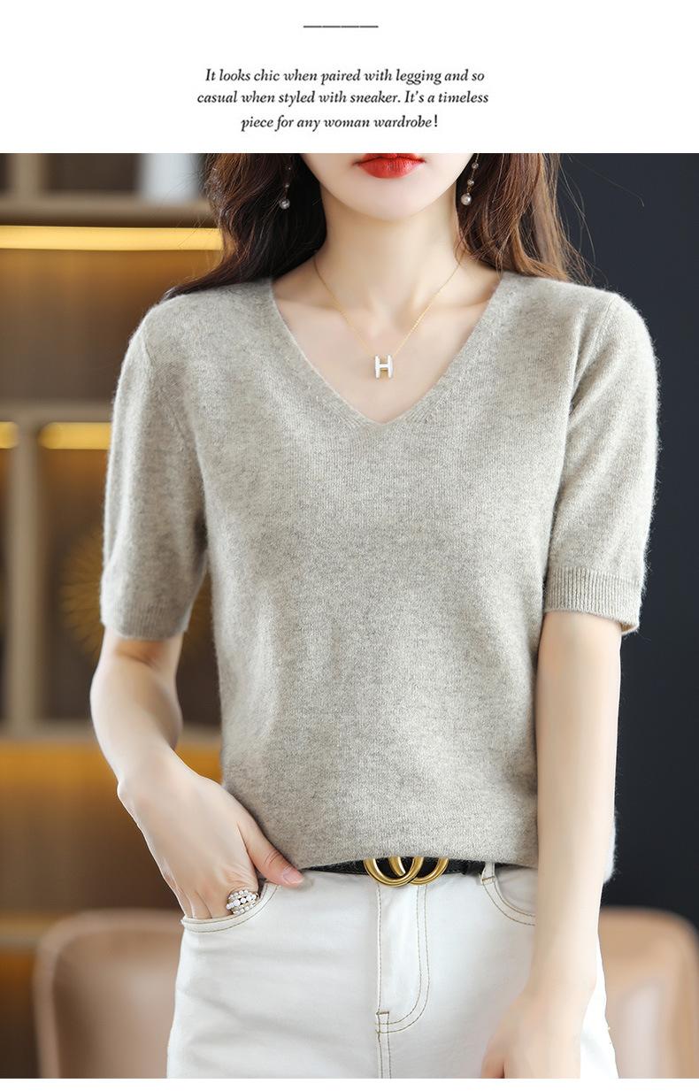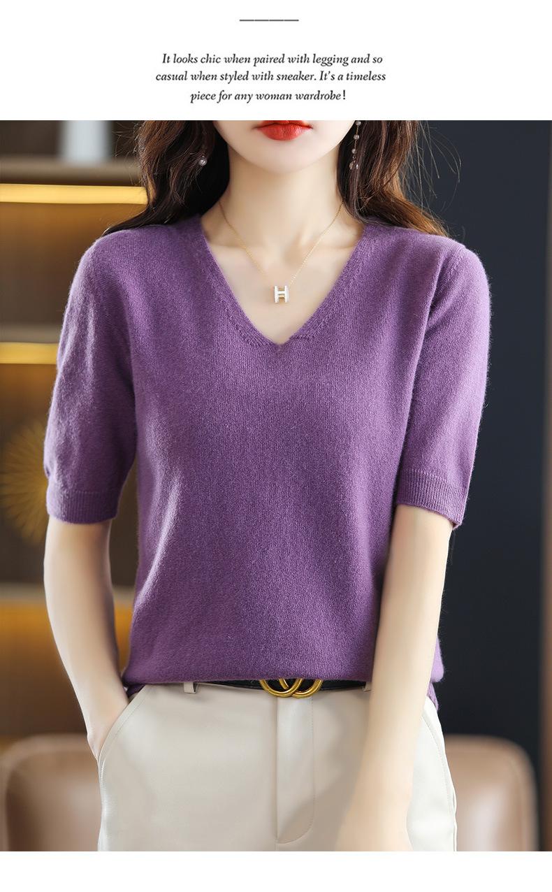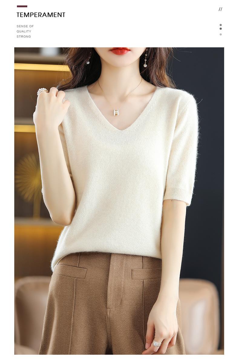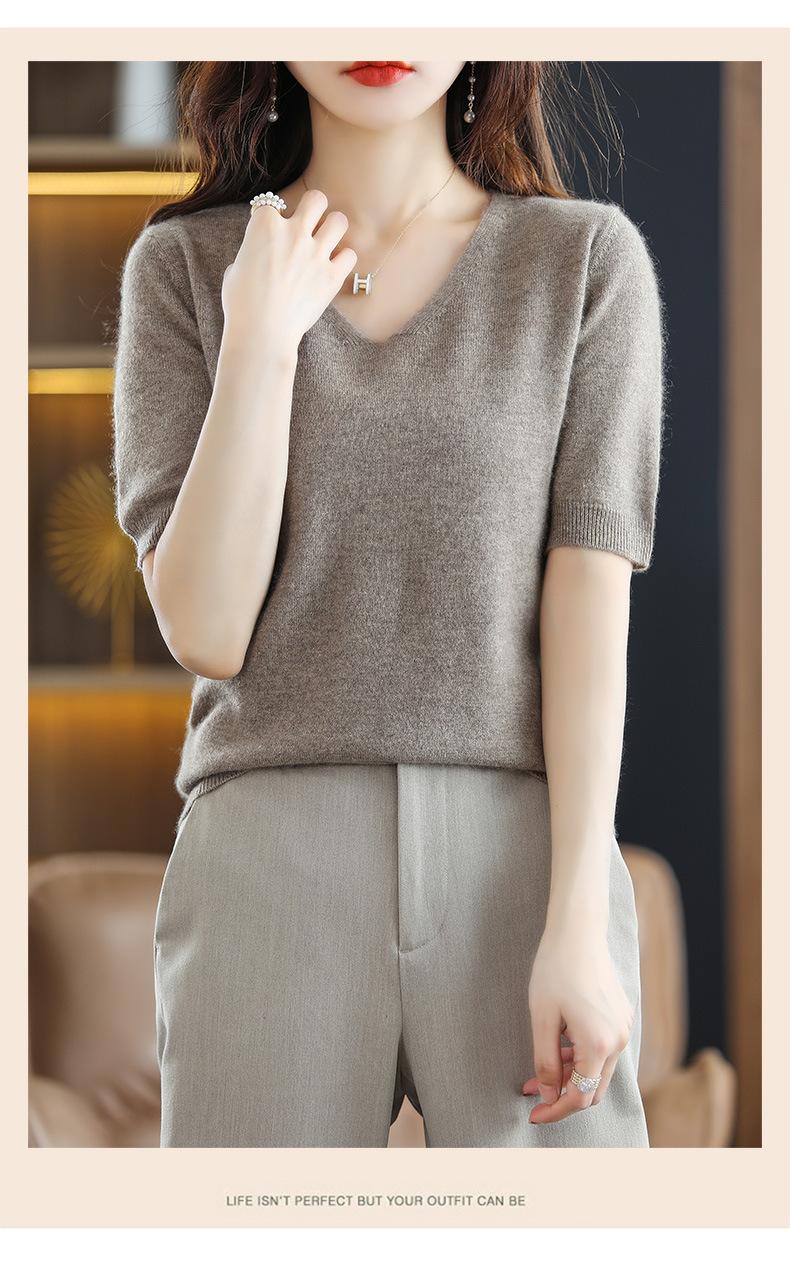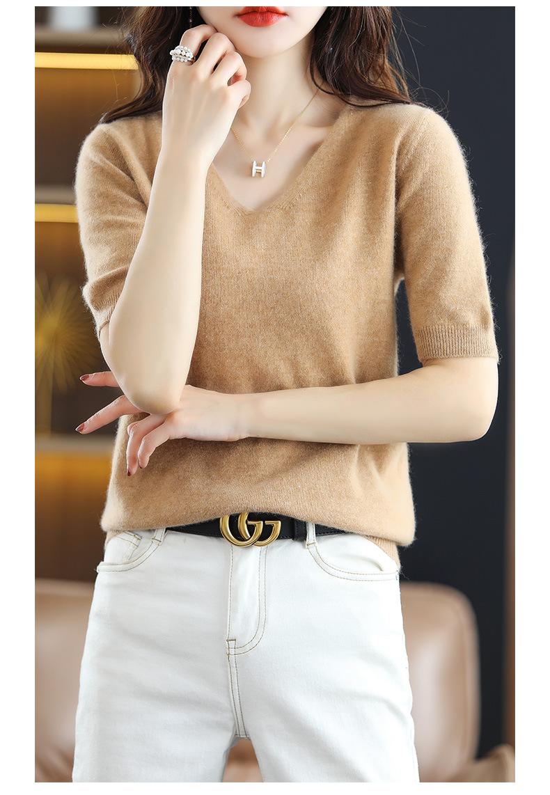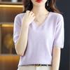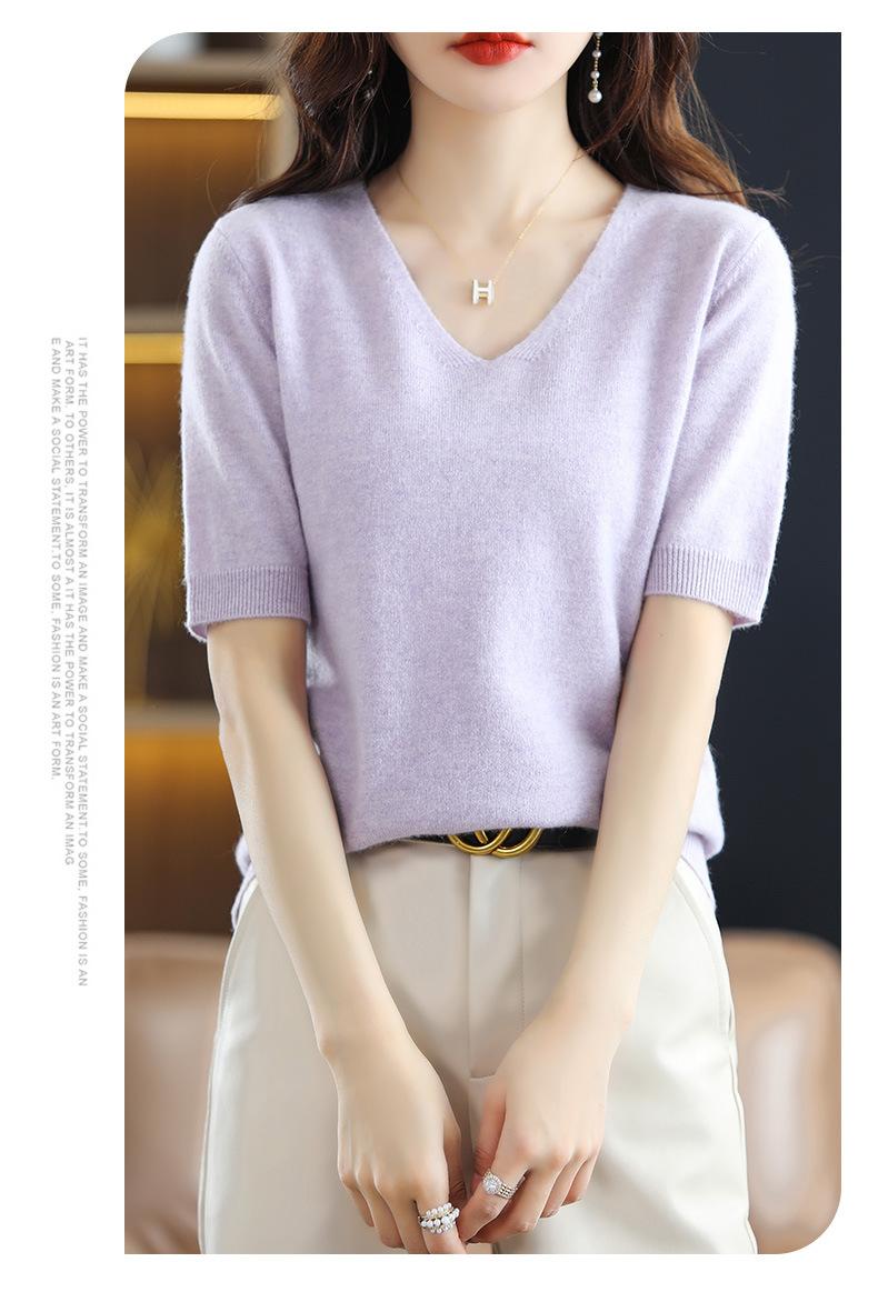 Tejido de punto básico de manga tres cuartos para primavera y otoño transfronterizo para mujer, suéter tipo jersey con cuello en V, holgado, casual, estilo coreano, top de manga corta, cien