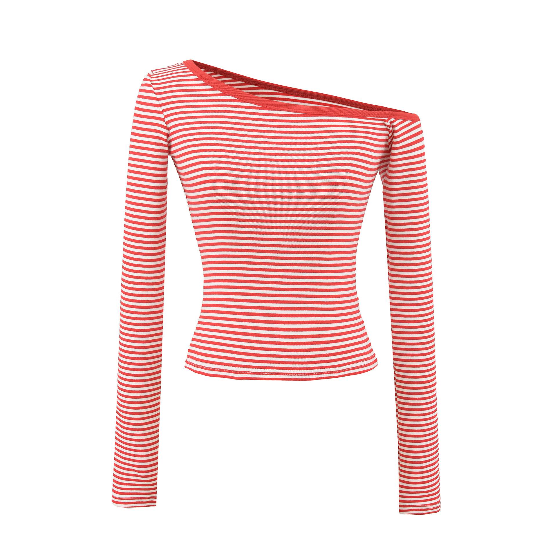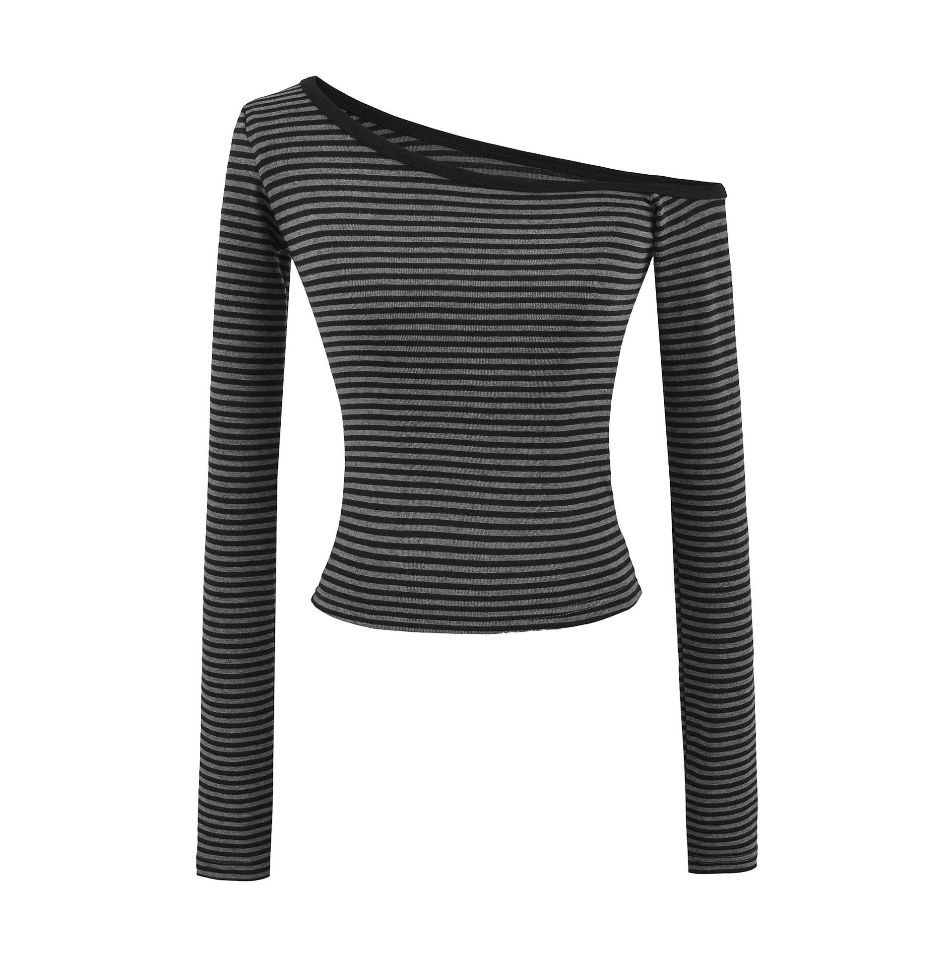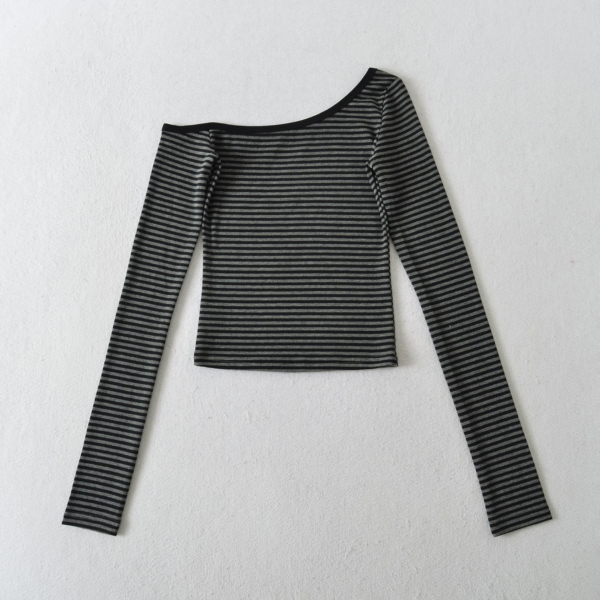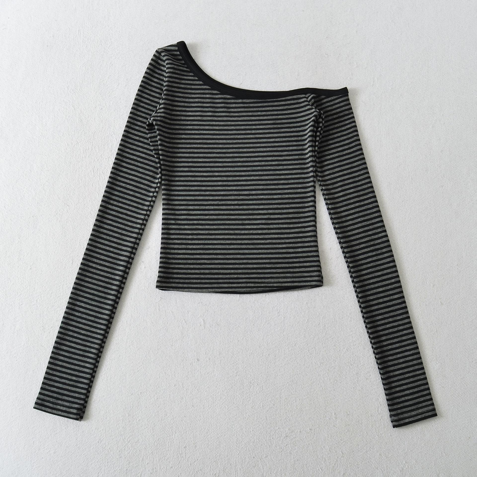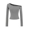 Camiseta Sexy Europea y Americana de Rayas con un Hombro Descubierto y Manga Larga al por Mayor para Mujer, Camiseta Interior de Rayas Ajustada Corta para Chica Hot, Camiseta Básica con Hombros Descubiertos