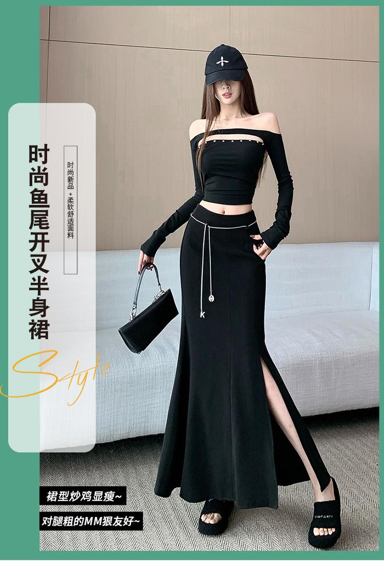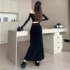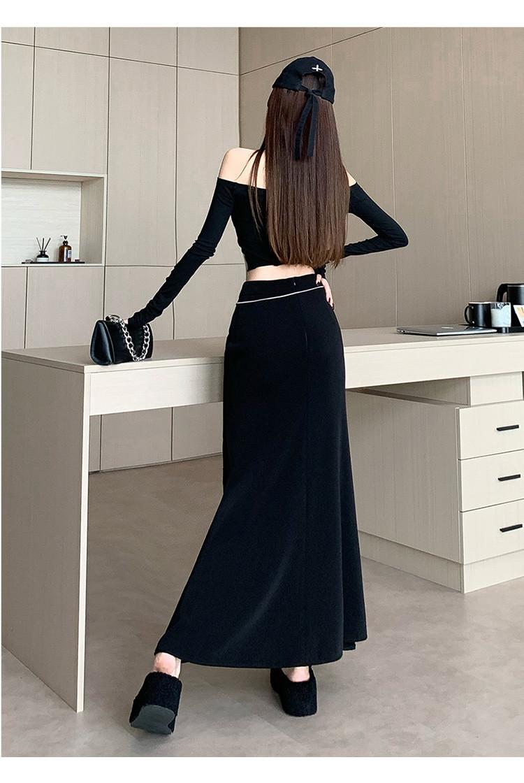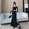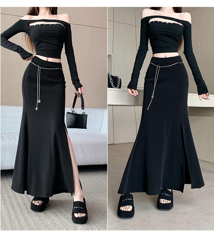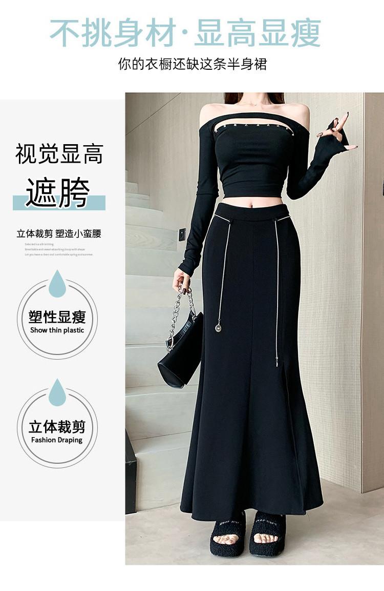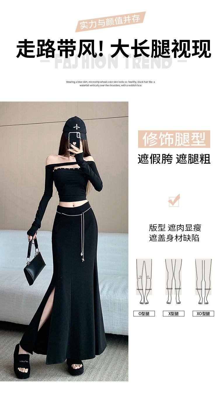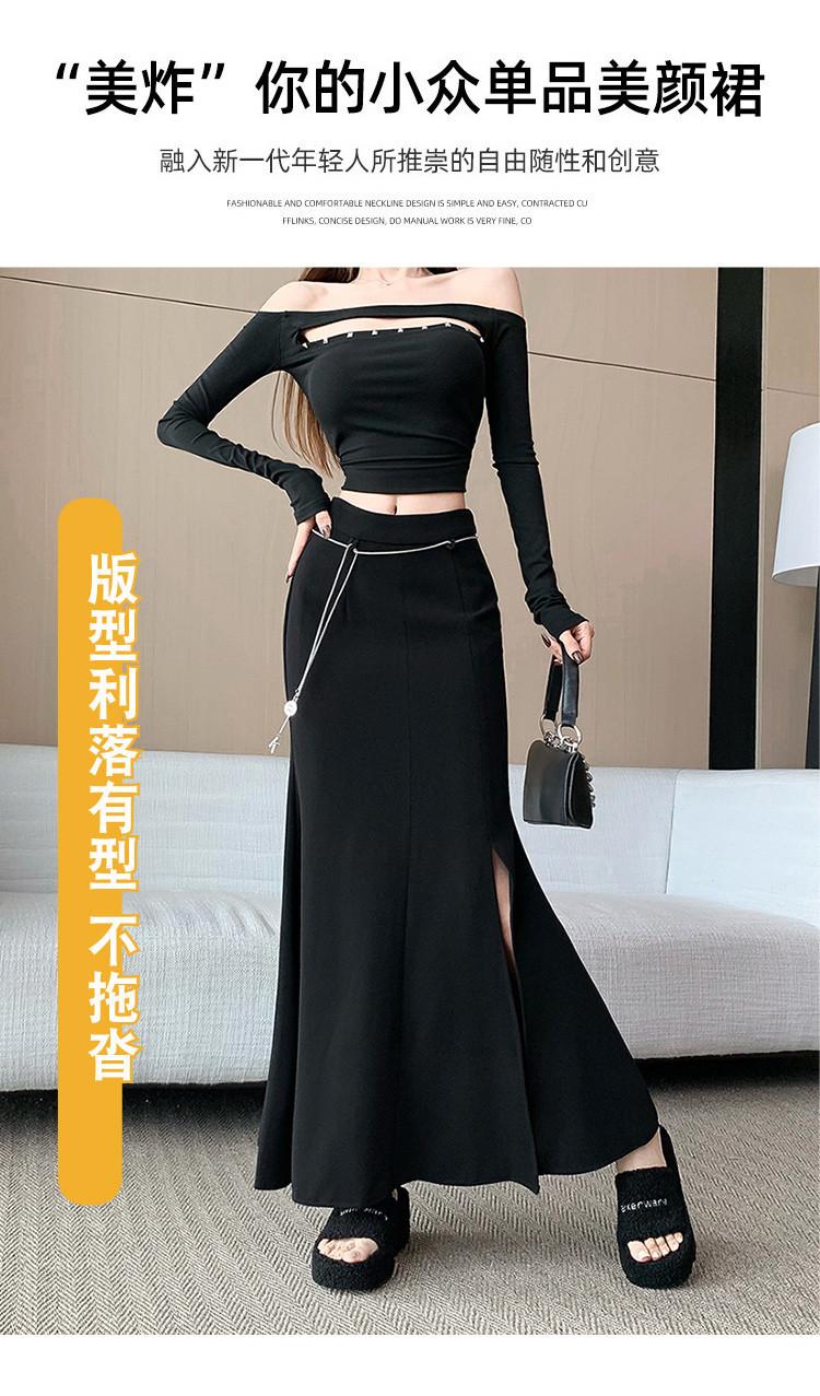 Falda negra de alta gama transfronteriza 2025 otoño nueva moda cadena cintura alta adelgazante larga abertura falda ajustada a la cadera