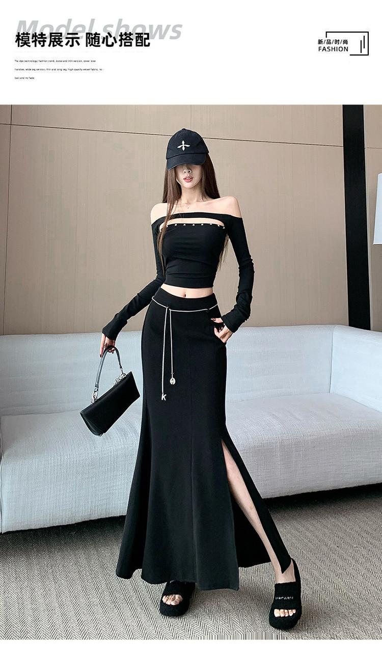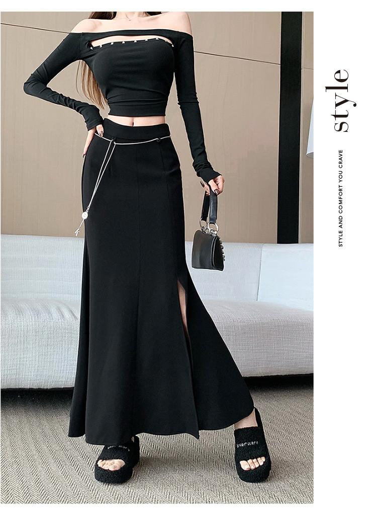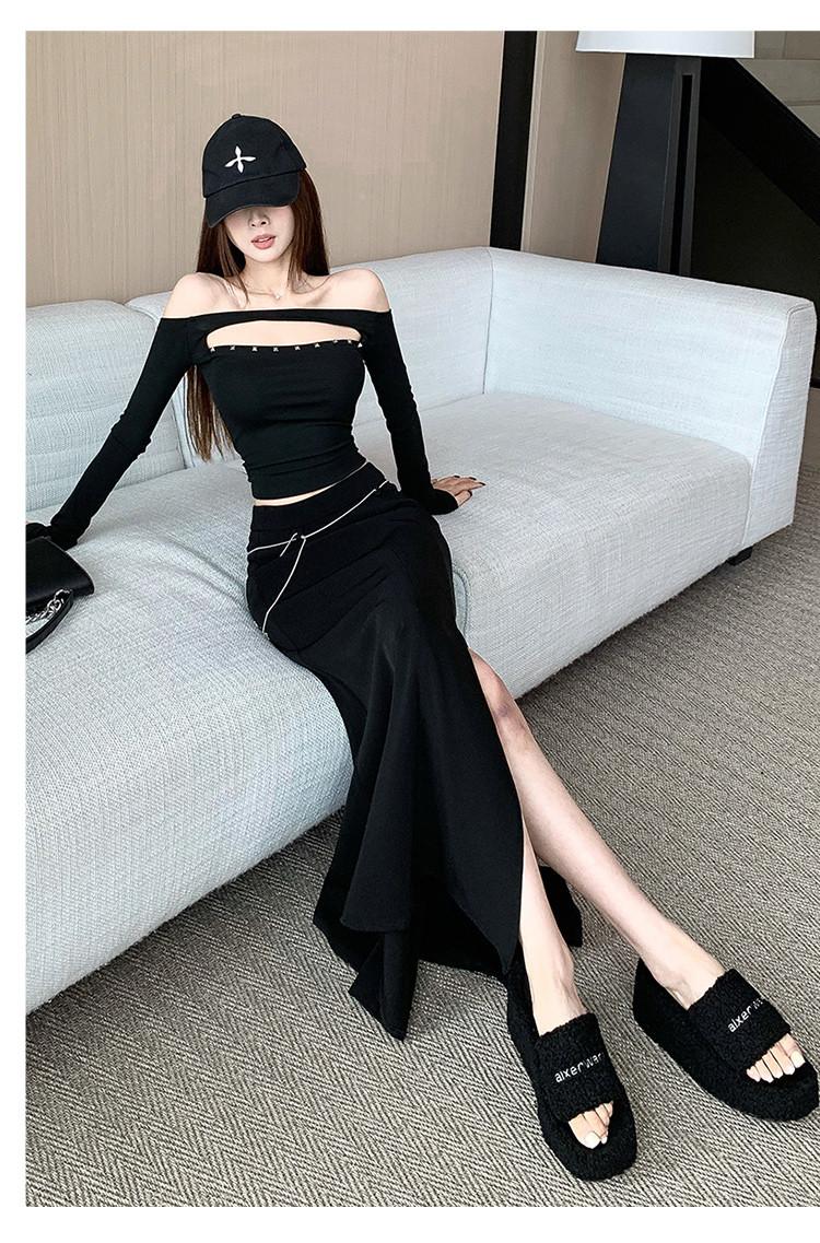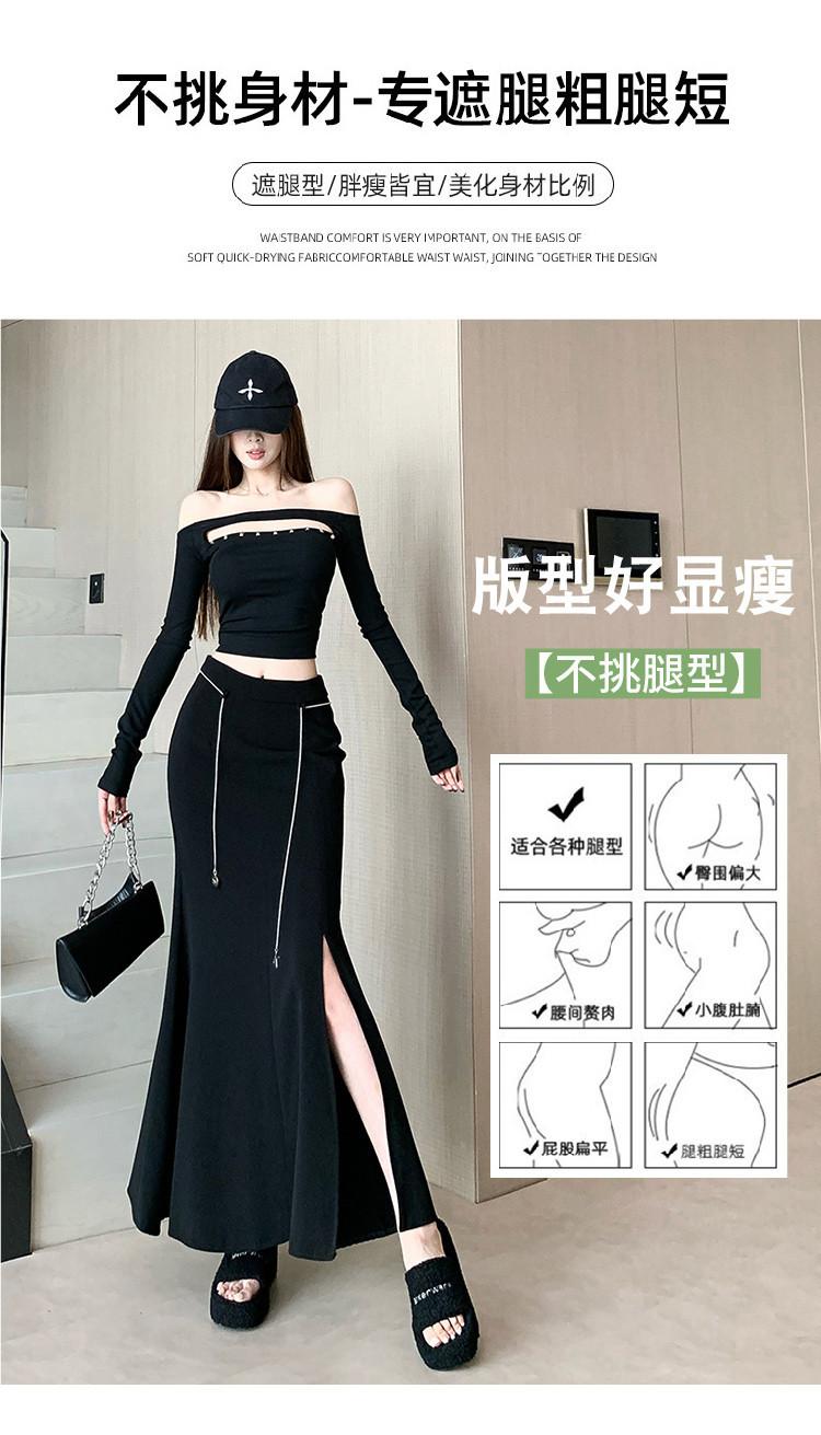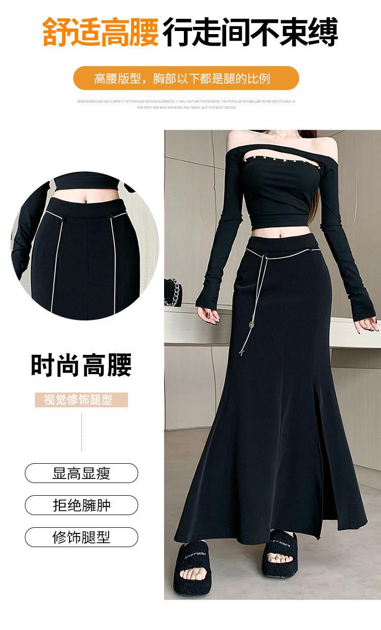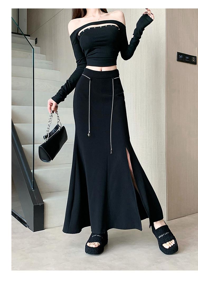 Falda negra de alta gama transfronteriza 2025 otoño nueva moda cadena cintura alta adelgazante larga abertura falda ajustada a la cadera