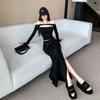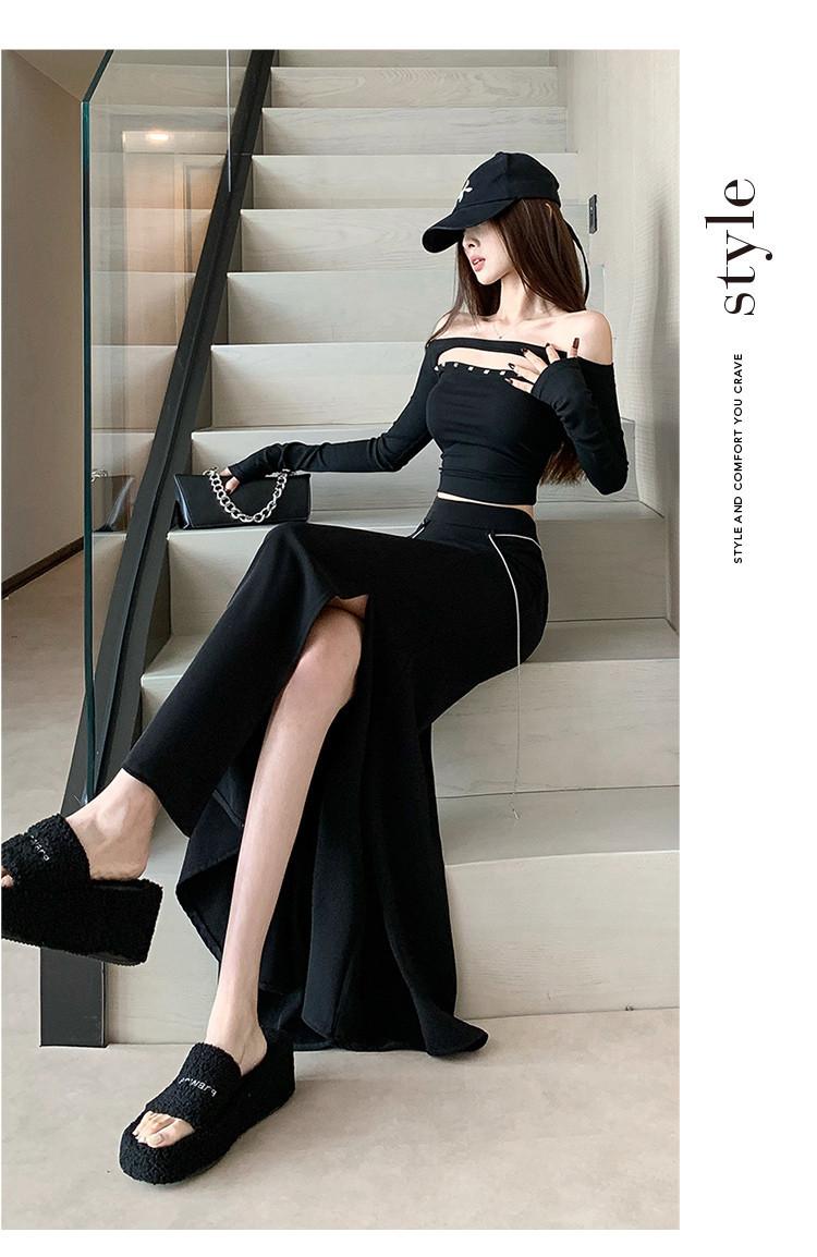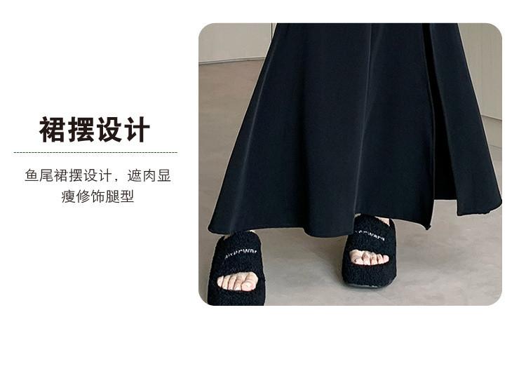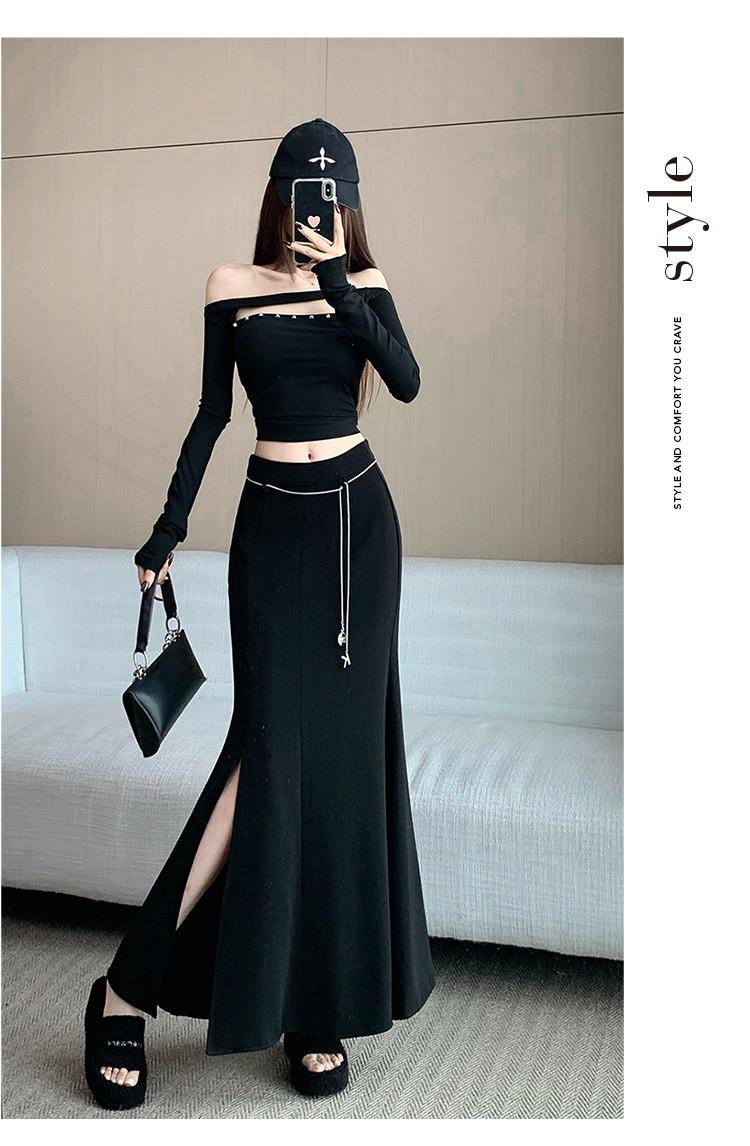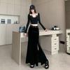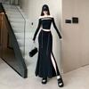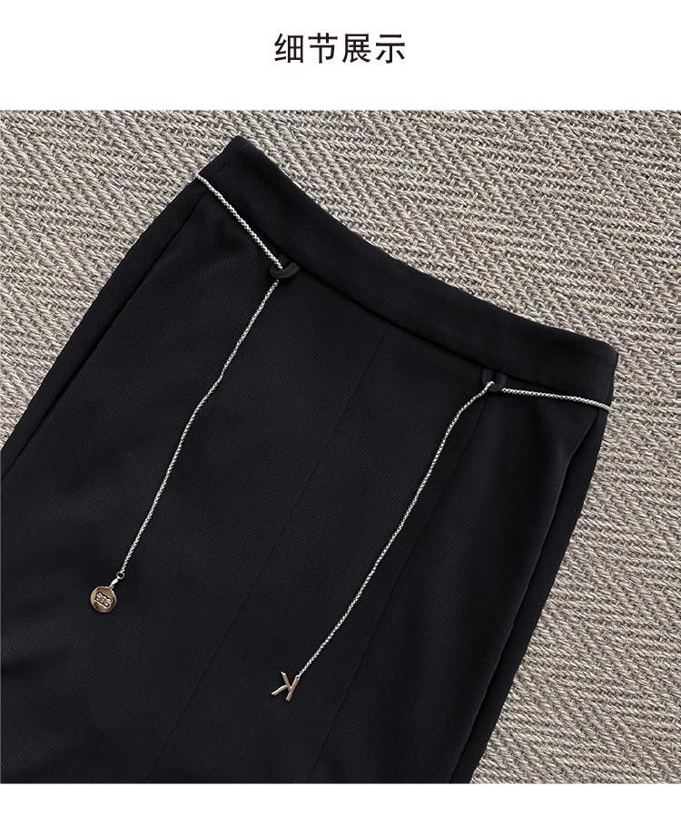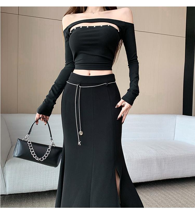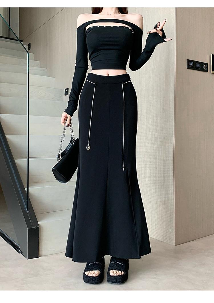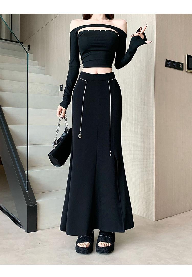 Falda negra de alta gama transfronteriza 2025 otoño nueva moda cadena cintura alta adelgazante larga abertura falda ajustada a la cadera