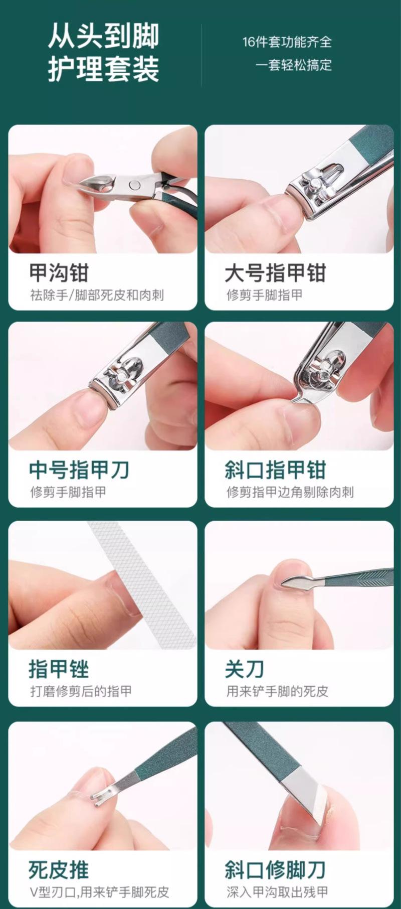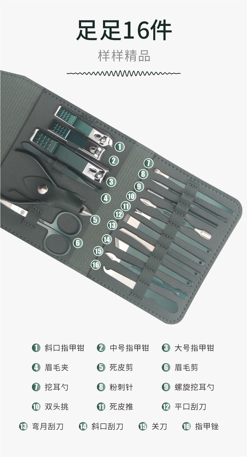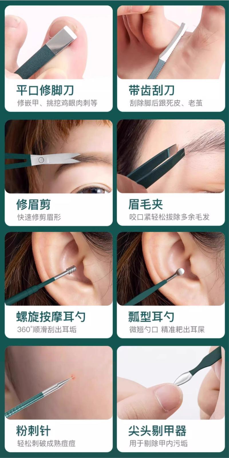Set de Cortauñas Verde Oscuro, Set Completo de Cucharilla para Oídos de Uso Doméstico, Tijeras para Cejas, Herramientas Profesionales para Pedicura, Set de Tijeras para Uñas