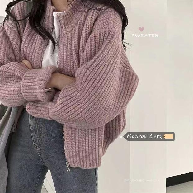 Nuevo Otoño/Invierno Estilo Coreano Viento Perezoso Holgado Ropa Exterior Cárdigan de Punto Suéter de Punto Grueso con Cierre Corto Versátil Casual para Mujer