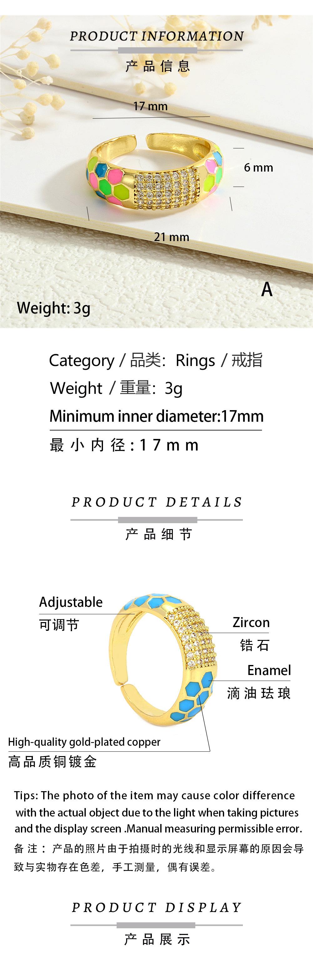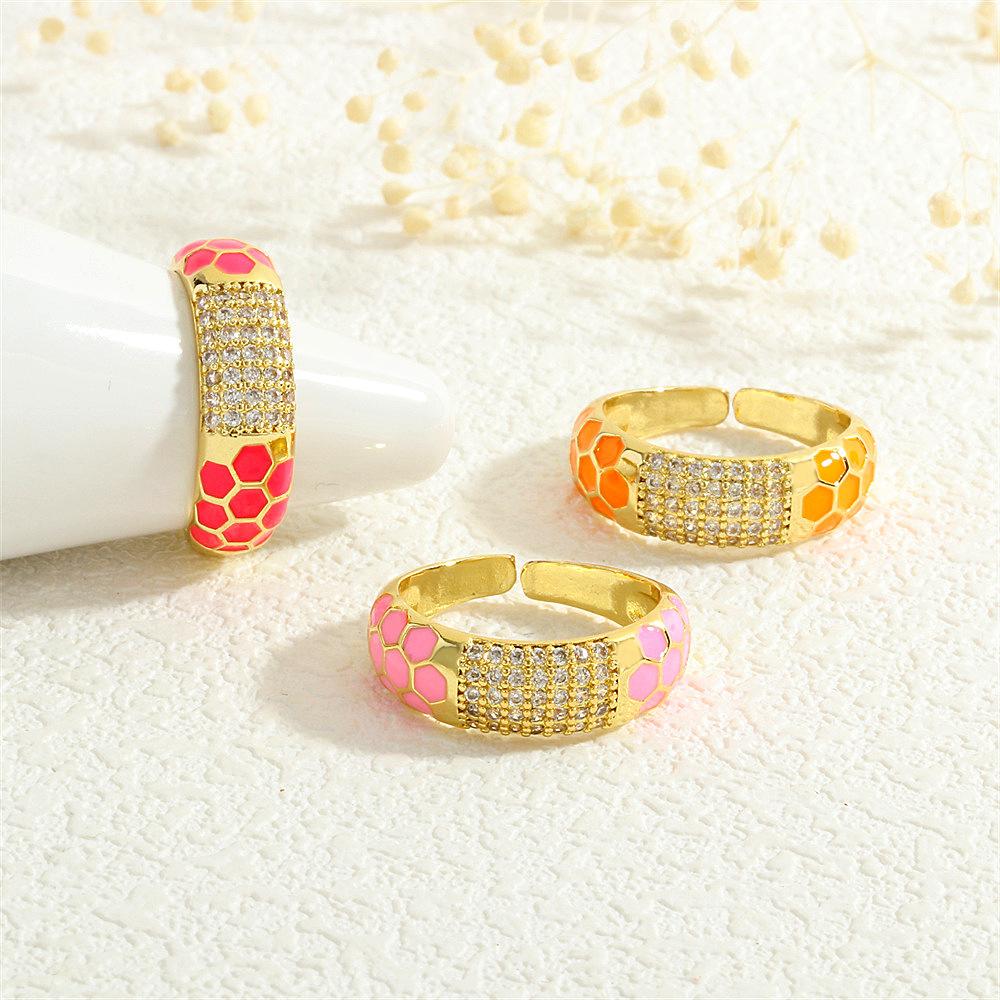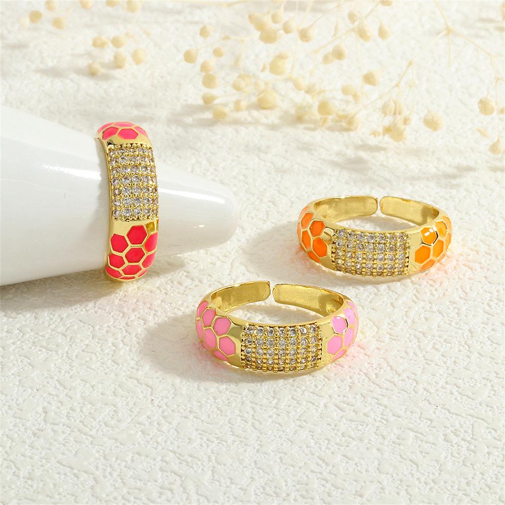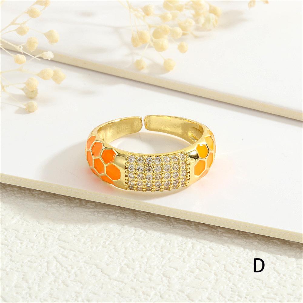 Anillo de Gota de Aceite con Diseño de Panal de Nicho Incrustado de Zircón de Cobre Color Caramelo Personalizado, Apertura Ajustable, Joyería Estilo Ins