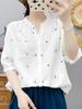 Camisa de Gasa de Algodón de Doble Capa con Cuello en V y Manga Media, Fresca y Literaria, con Estampado Floral, Verano 2025 Nuevo Top Casual de Algodón para Mujer