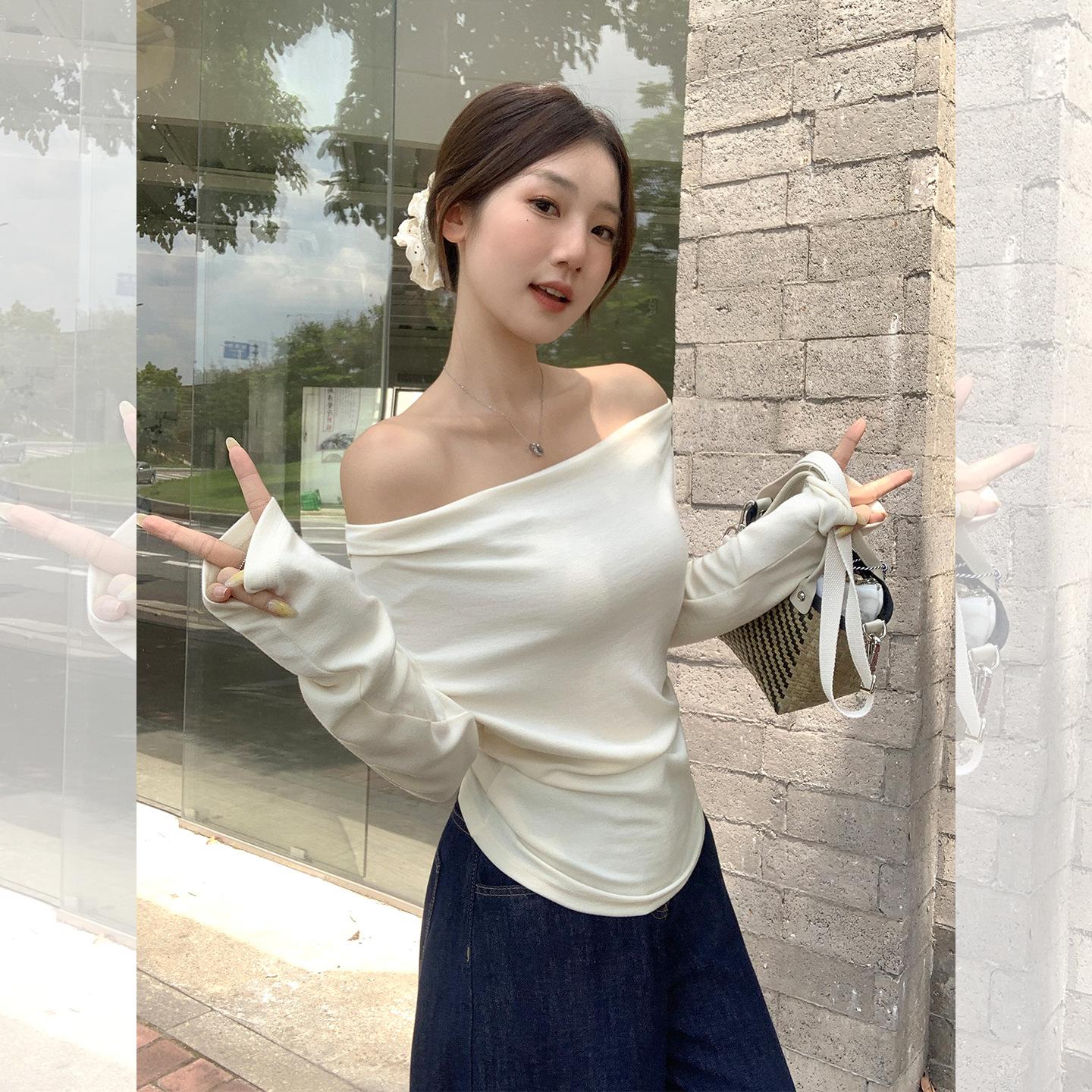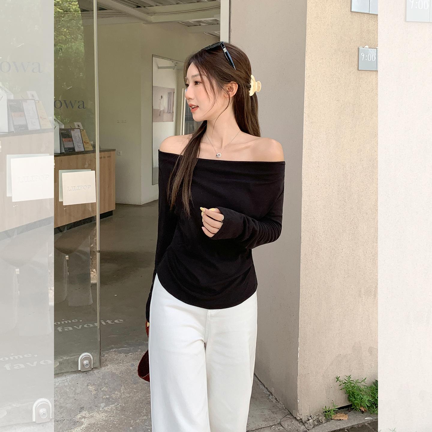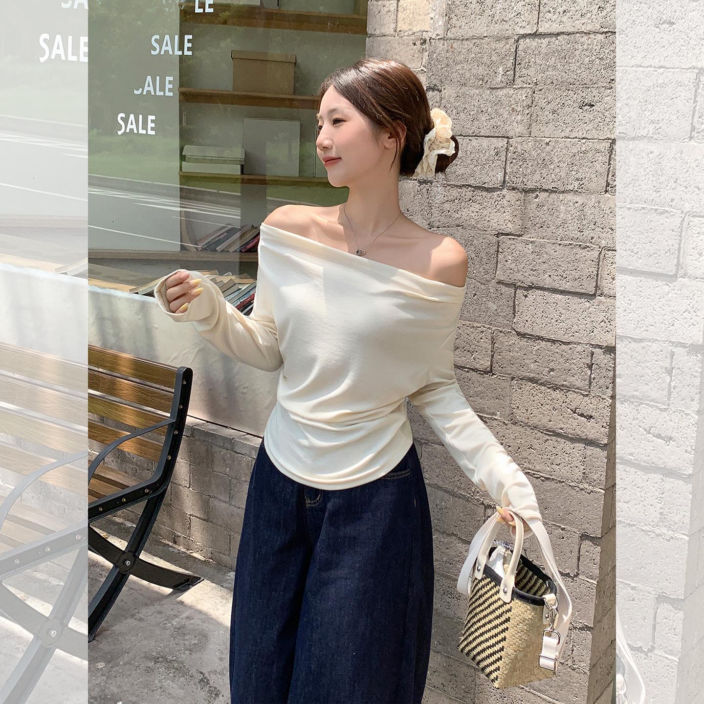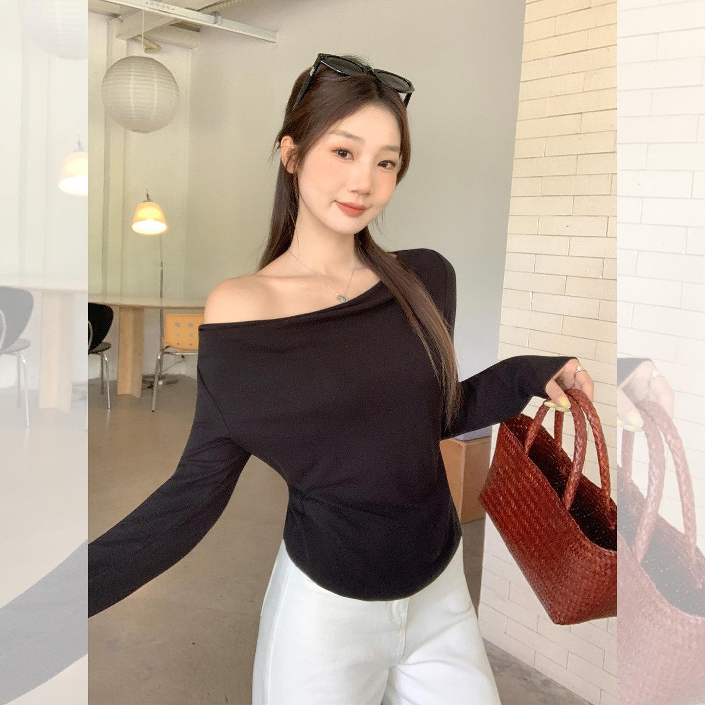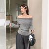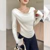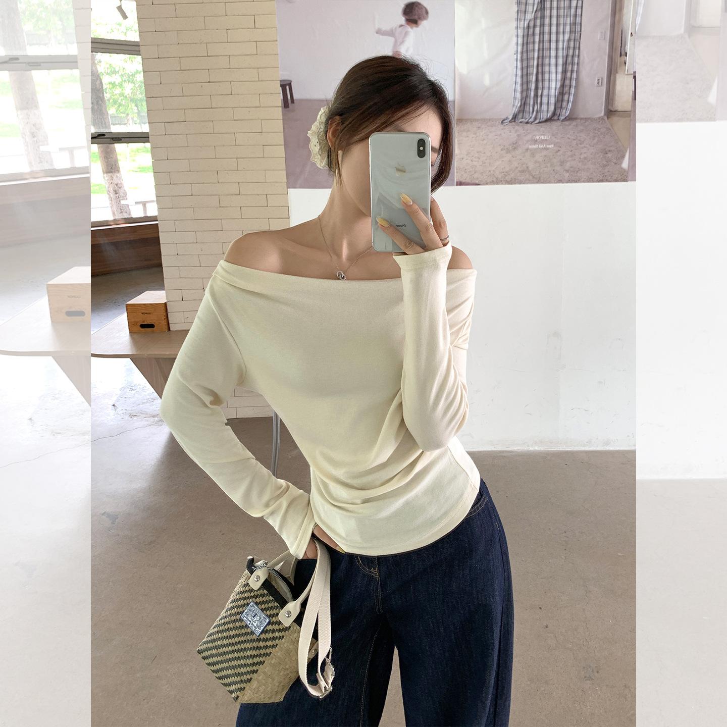 Toma Real 2025 Estilo Coreano Cuello Caído Manga Larga Ropa Interior de Gama Alta para Mujer Hombros Descubiertos Fruncido Ajustado Temperamento Top Pequeño
