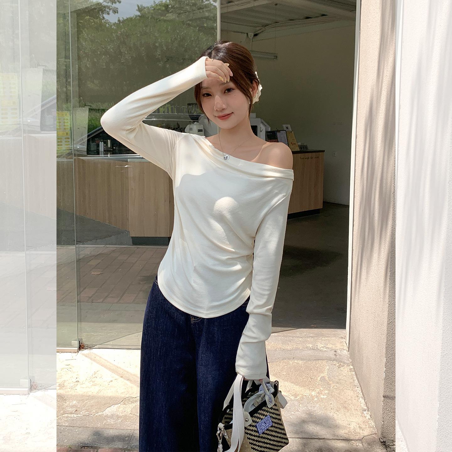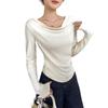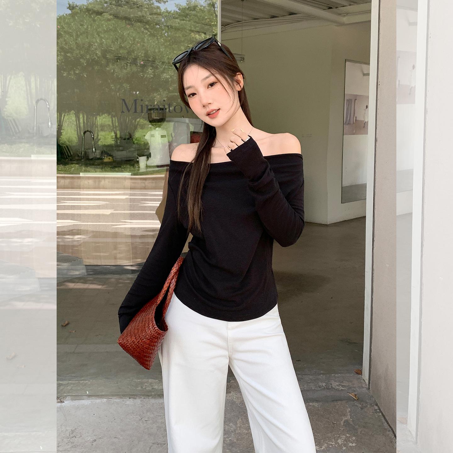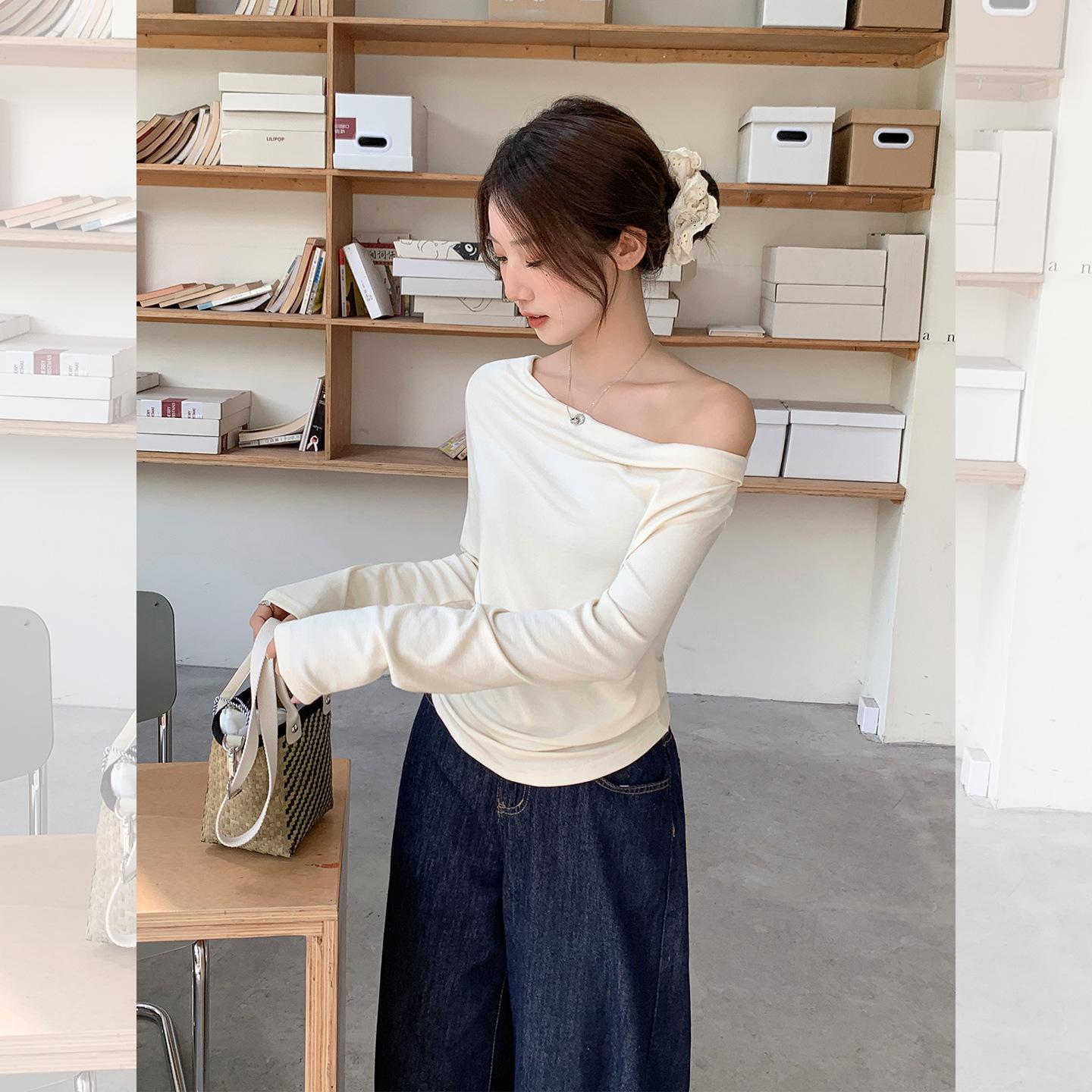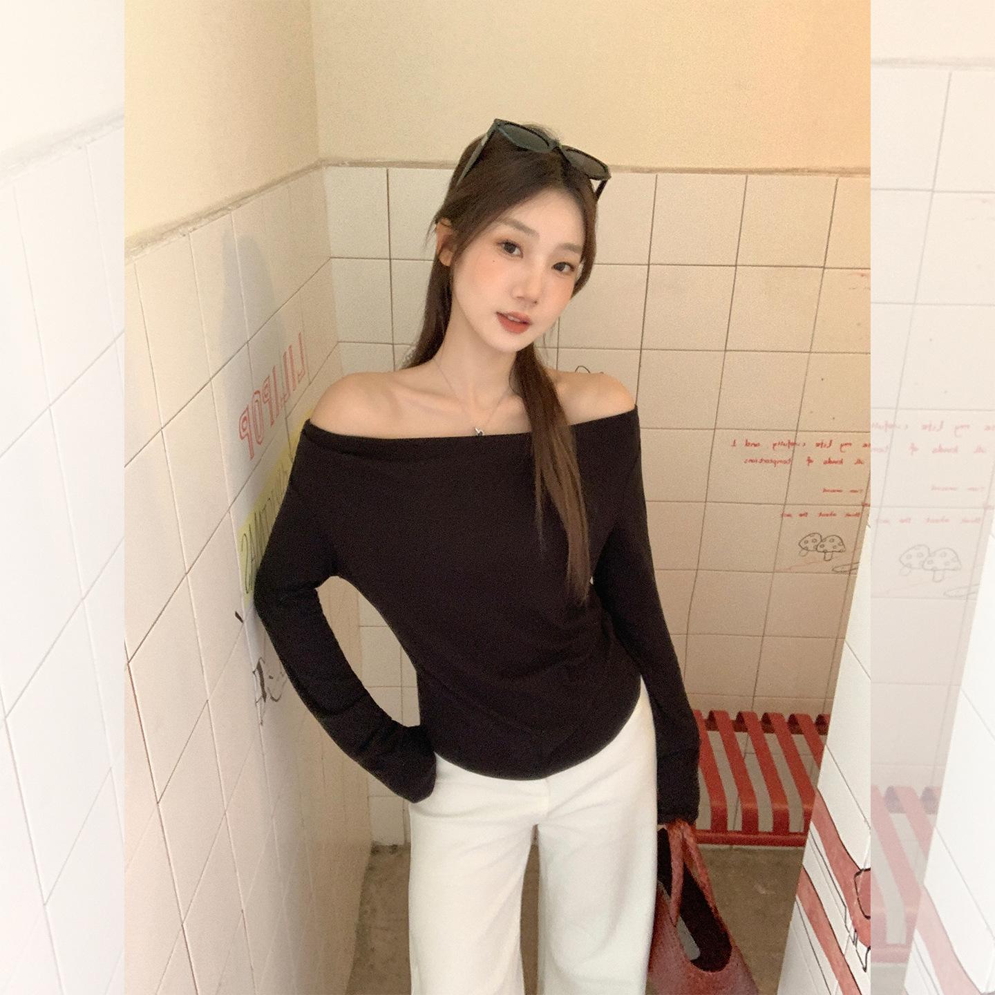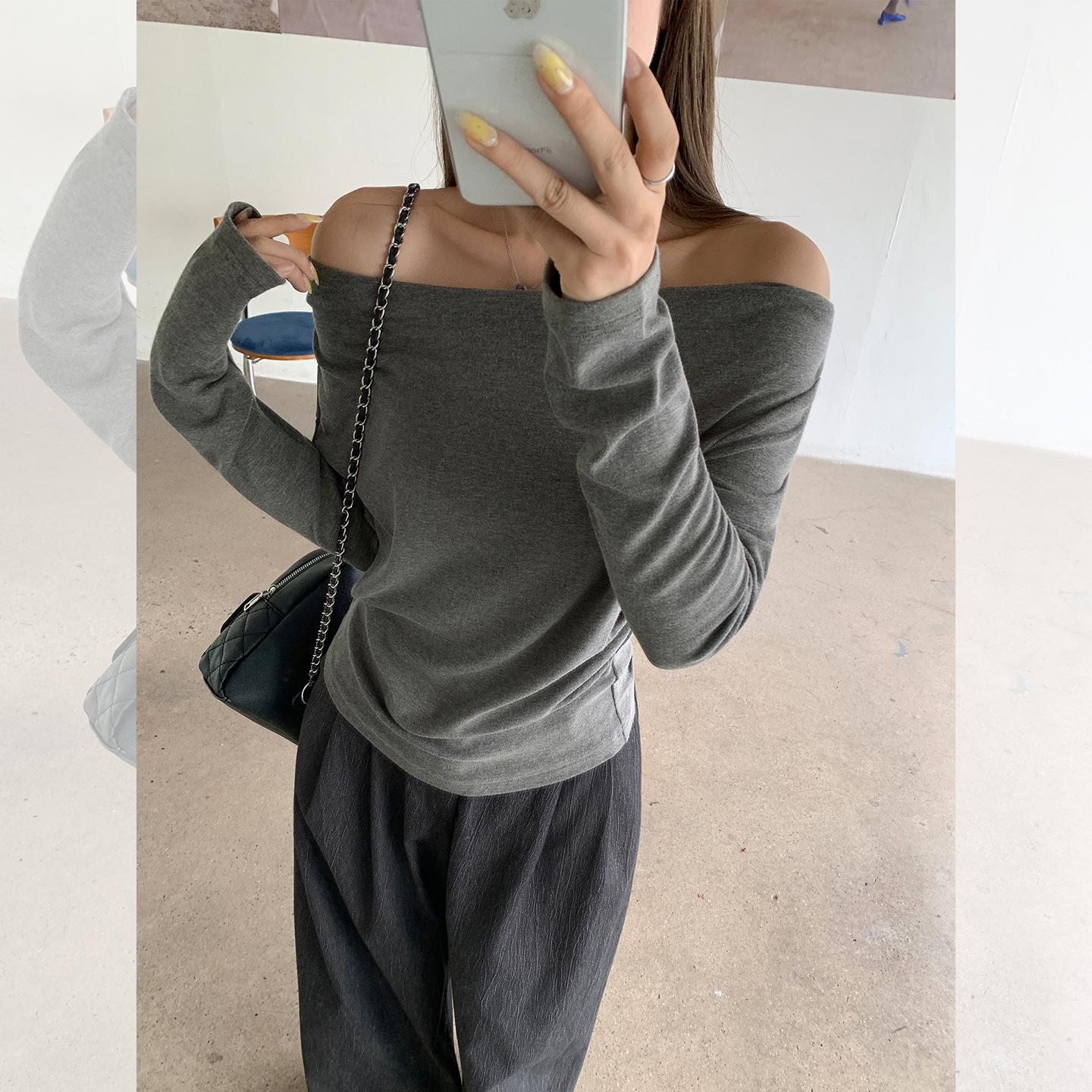 Toma Real 2025 Estilo Coreano Cuello Caído Manga Larga Ropa Interior de Gama Alta para Mujer Hombros Descubiertos Fruncido Ajustado Temperamento Top Pequeño