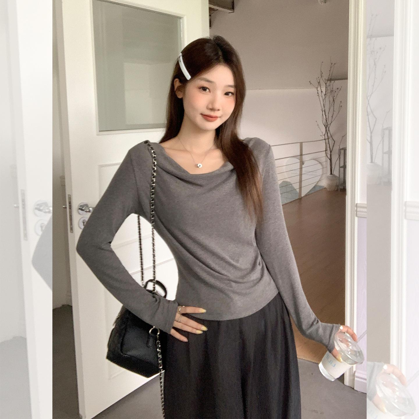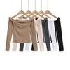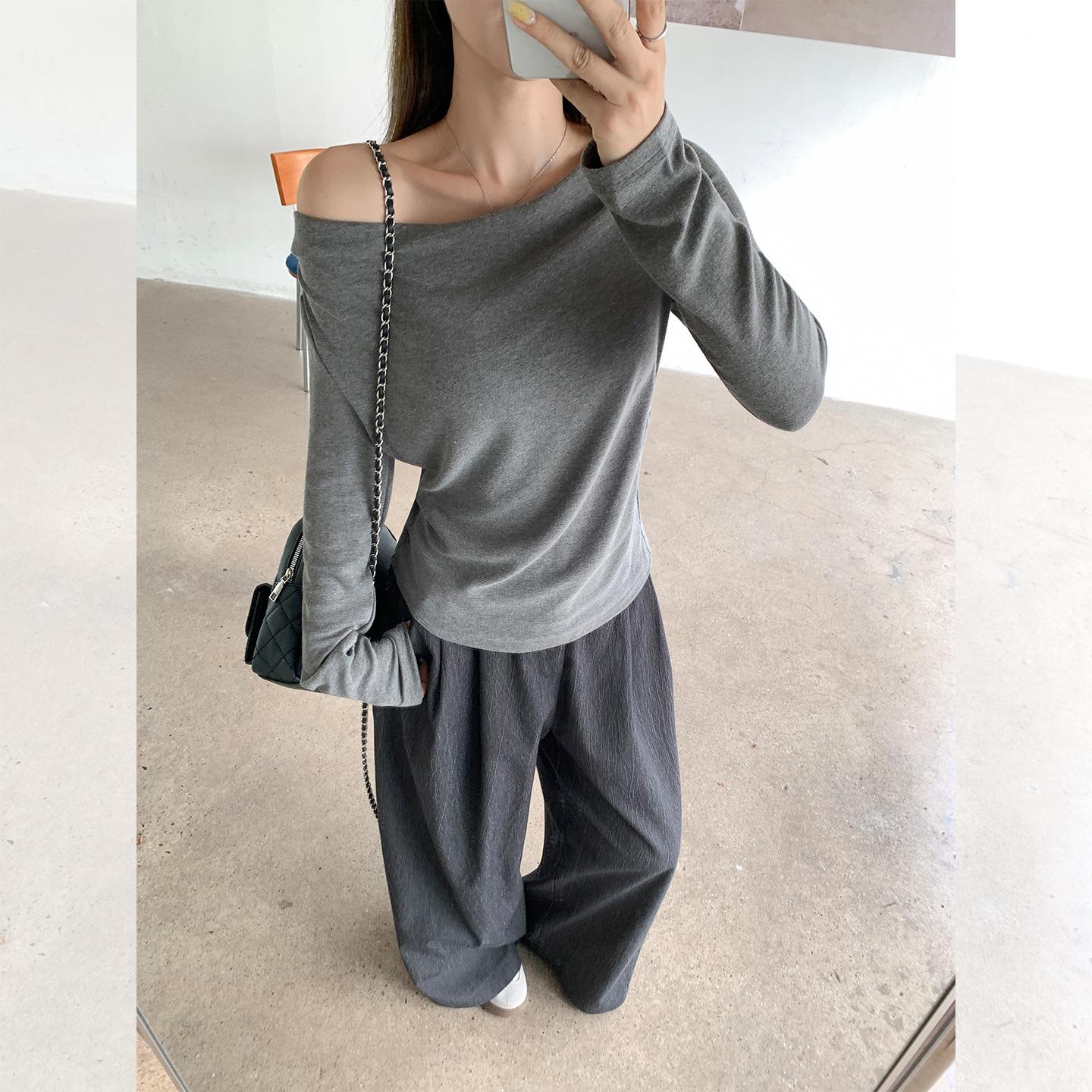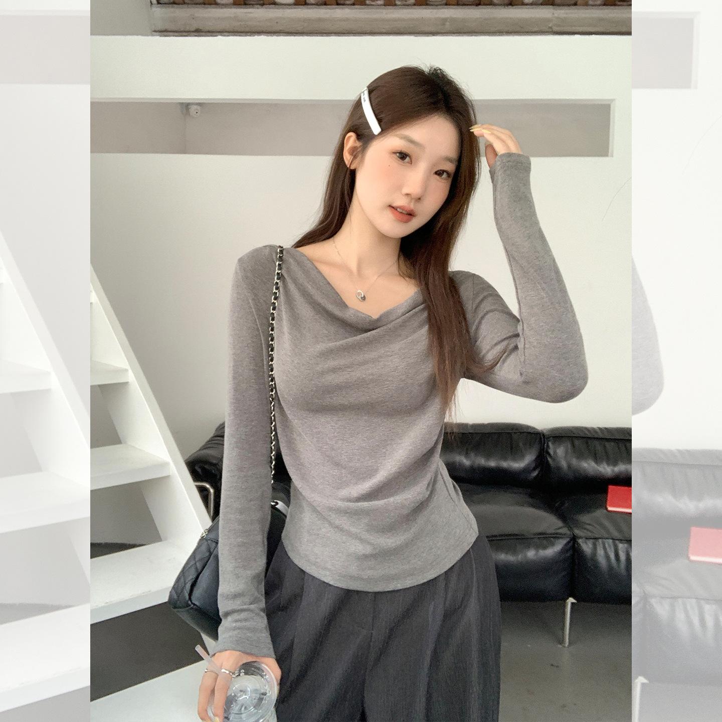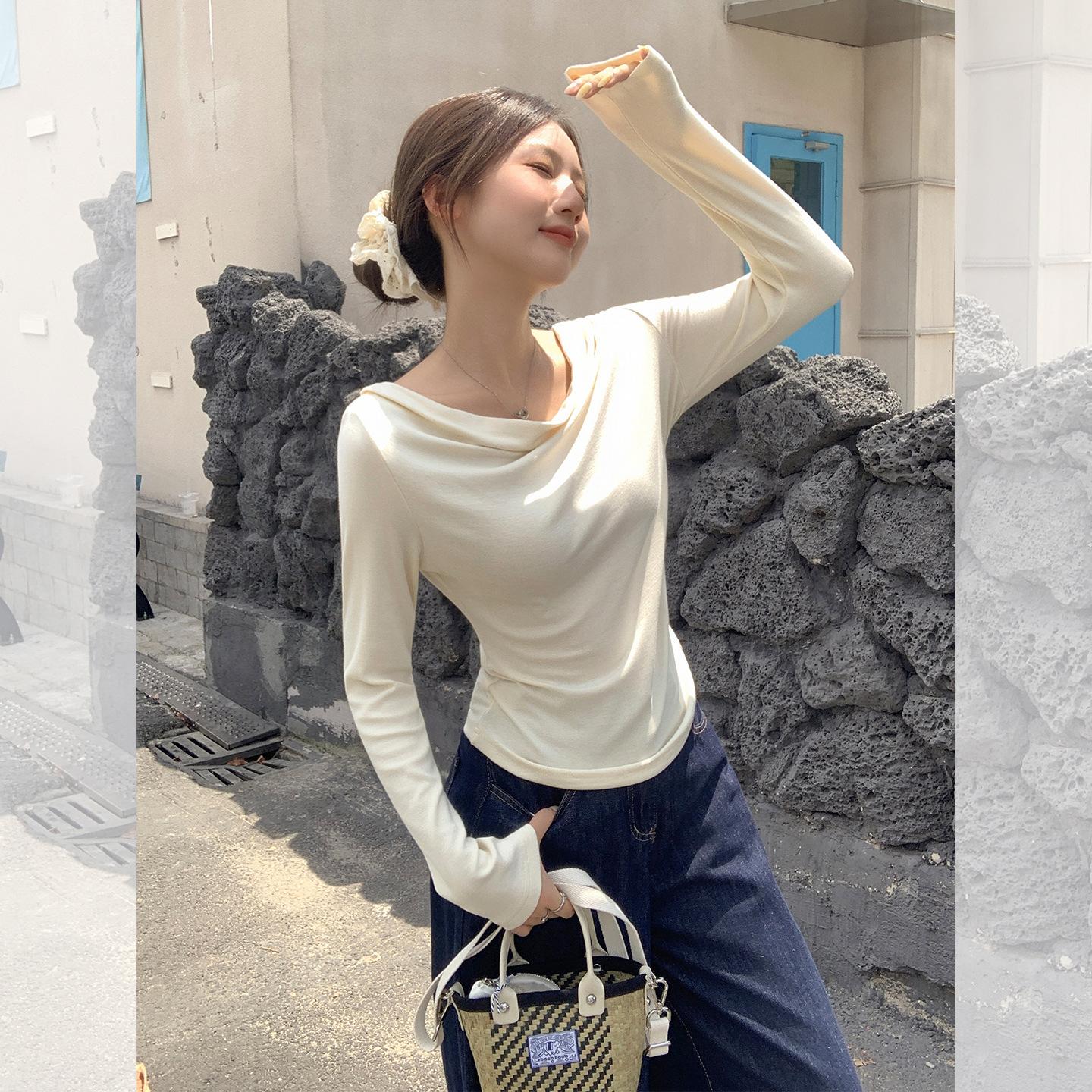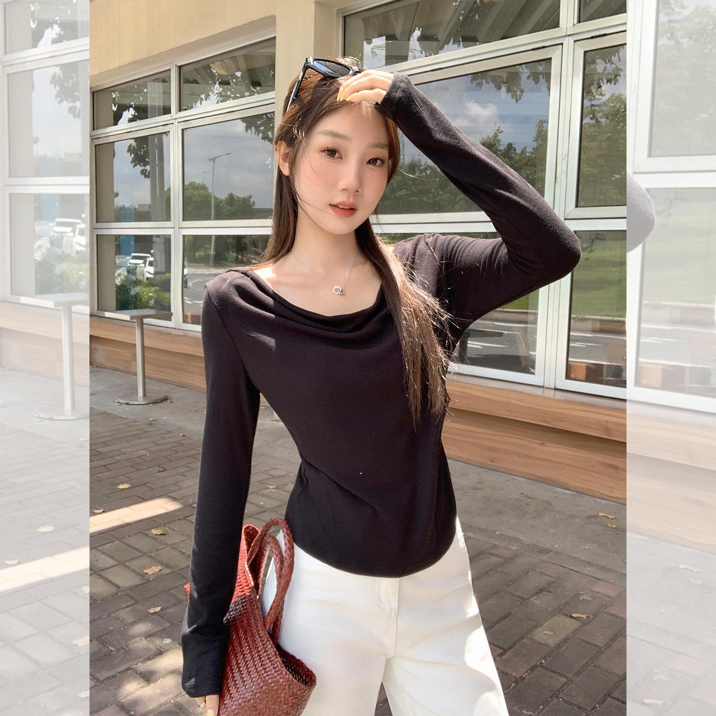 Toma Real 2025 Estilo Coreano Cuello Caído Manga Larga Ropa Interior de Gama Alta para Mujer Hombros Descubiertos Fruncido Ajustado Temperamento Top Pequeño