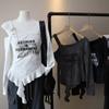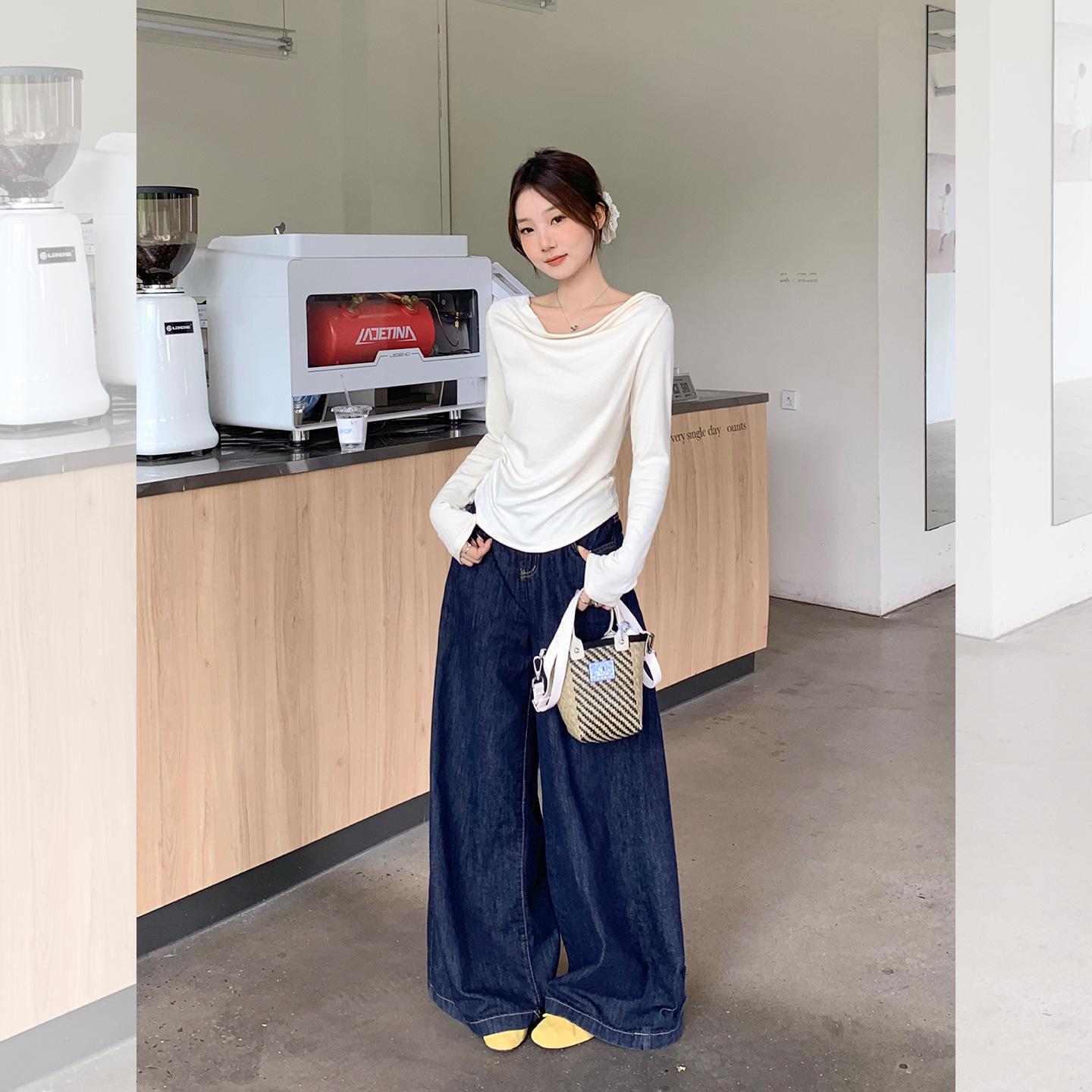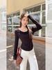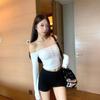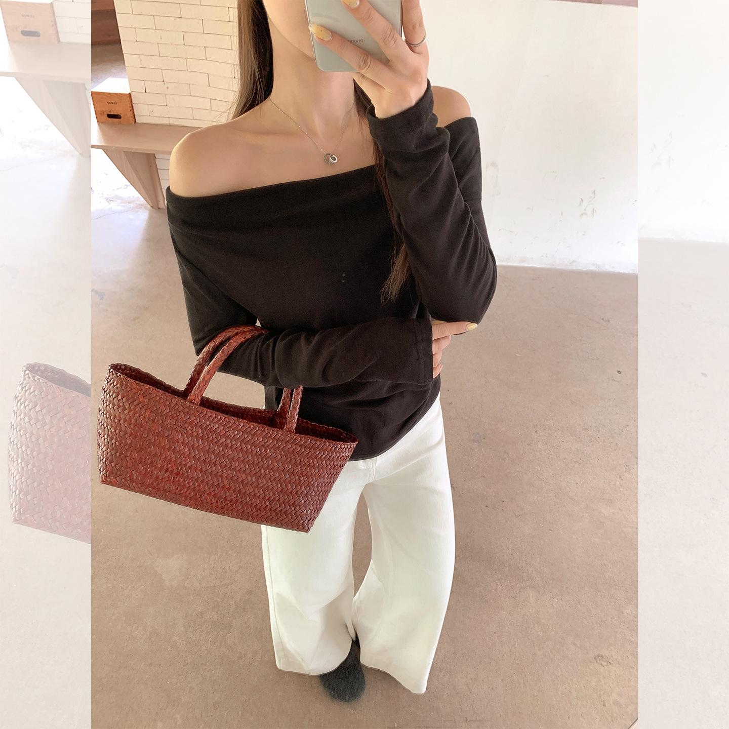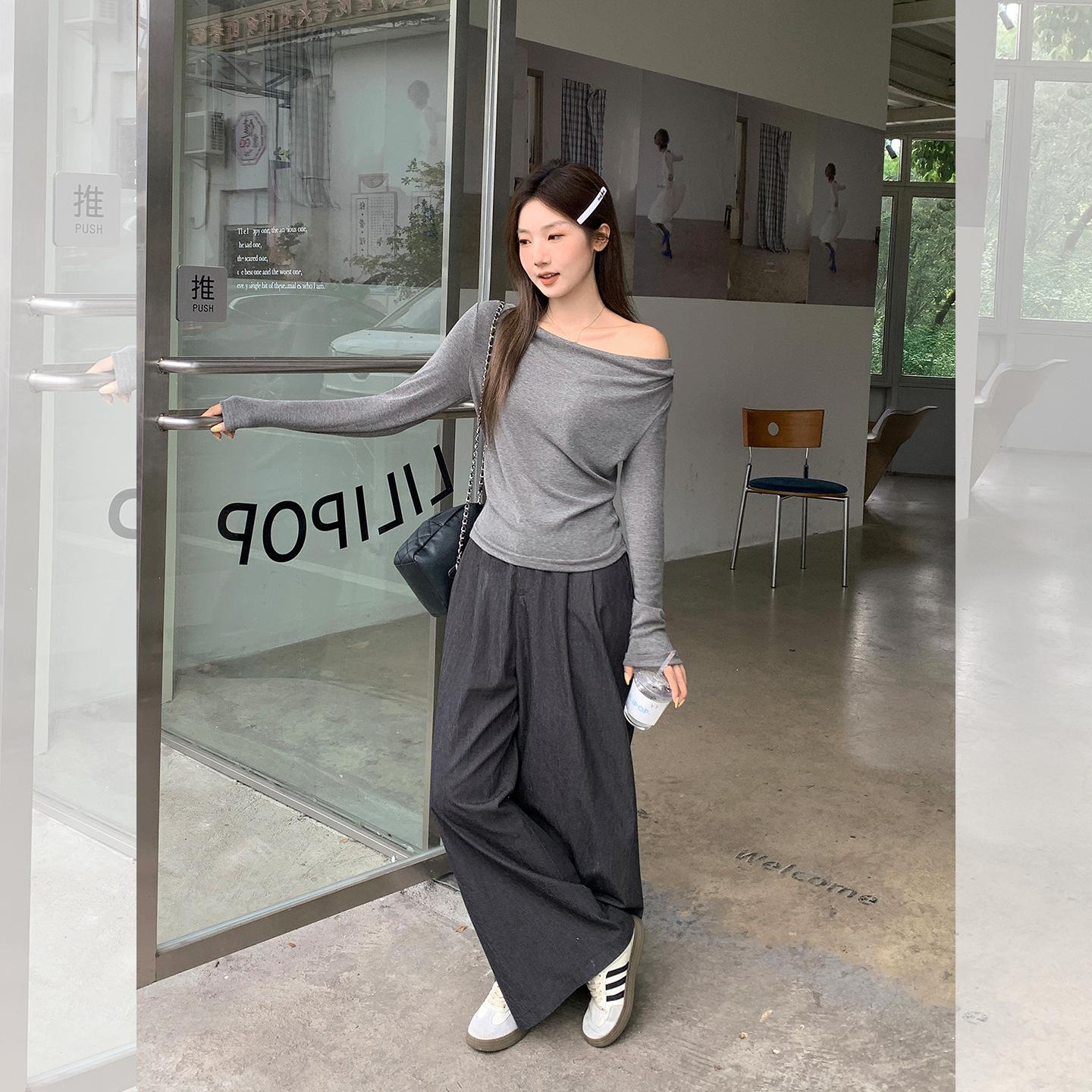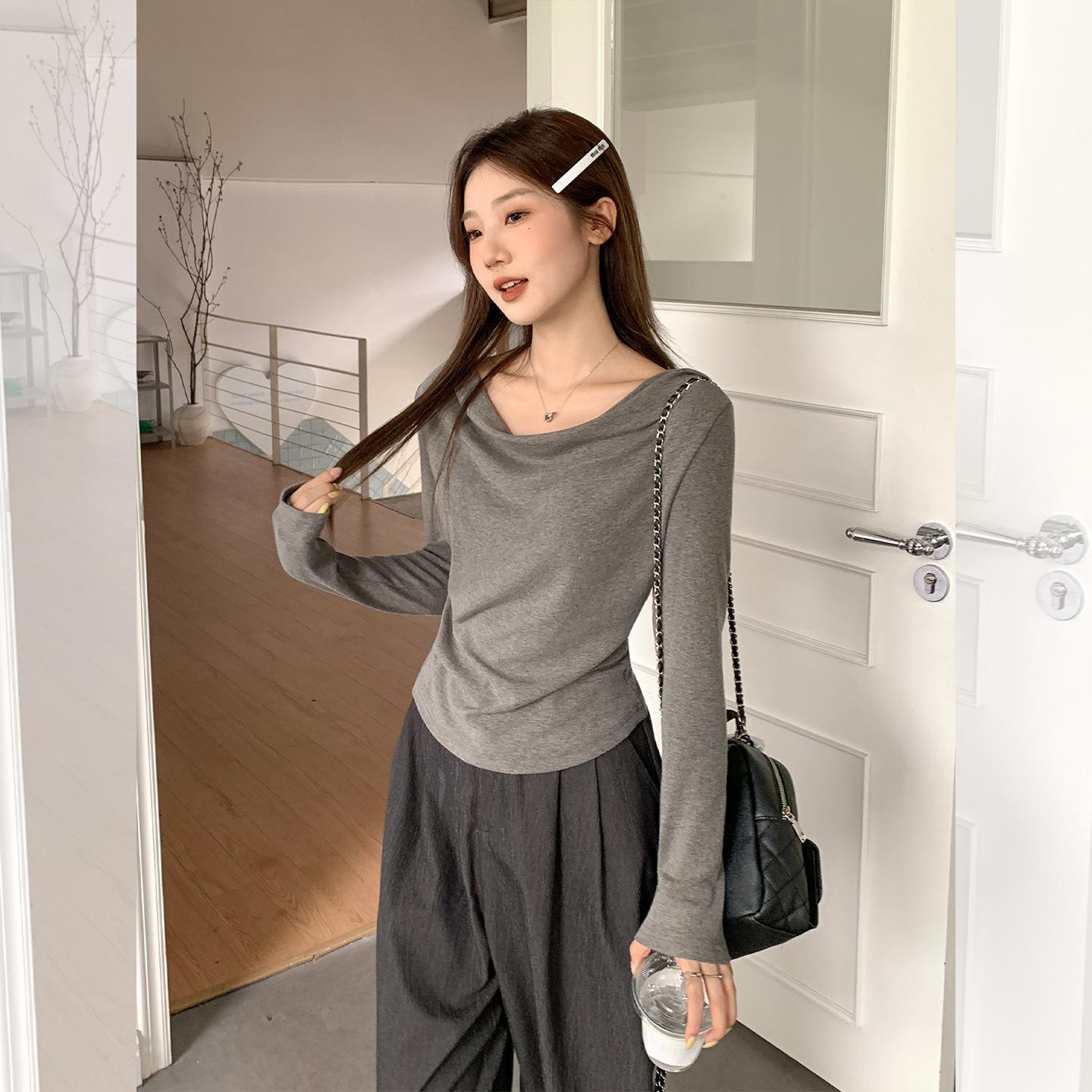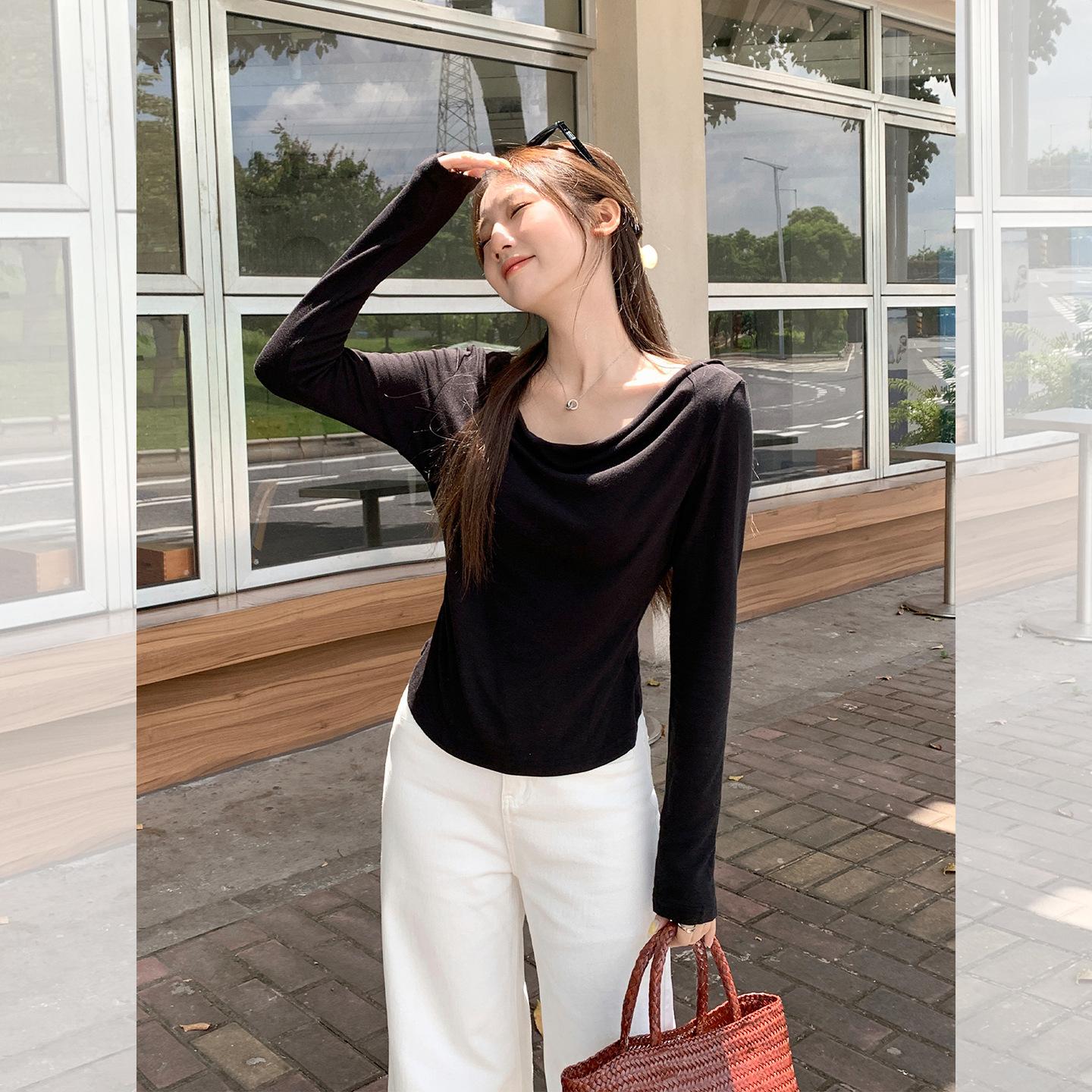 Toma Real 2025 Estilo Coreano Cuello Caído Manga Larga Ropa Interior de Gama Alta para Mujer Hombros Descubiertos Fruncido Ajustado Temperamento Top Pequeño