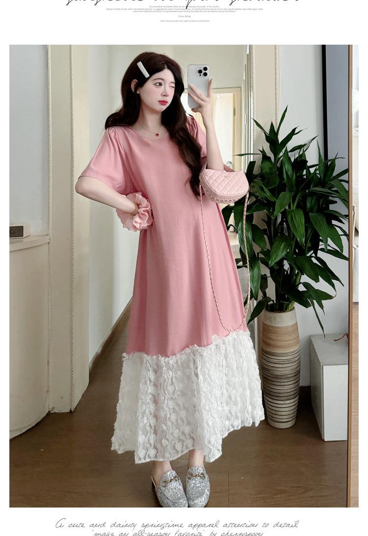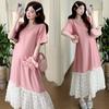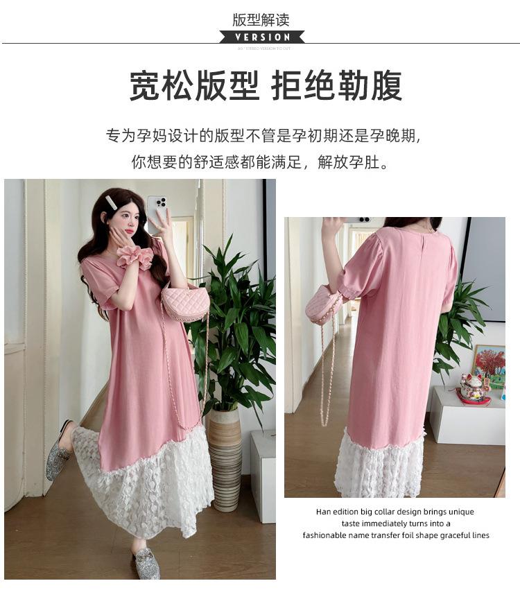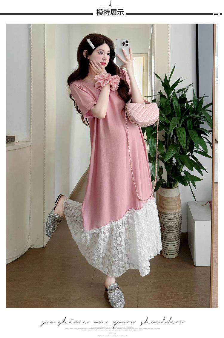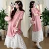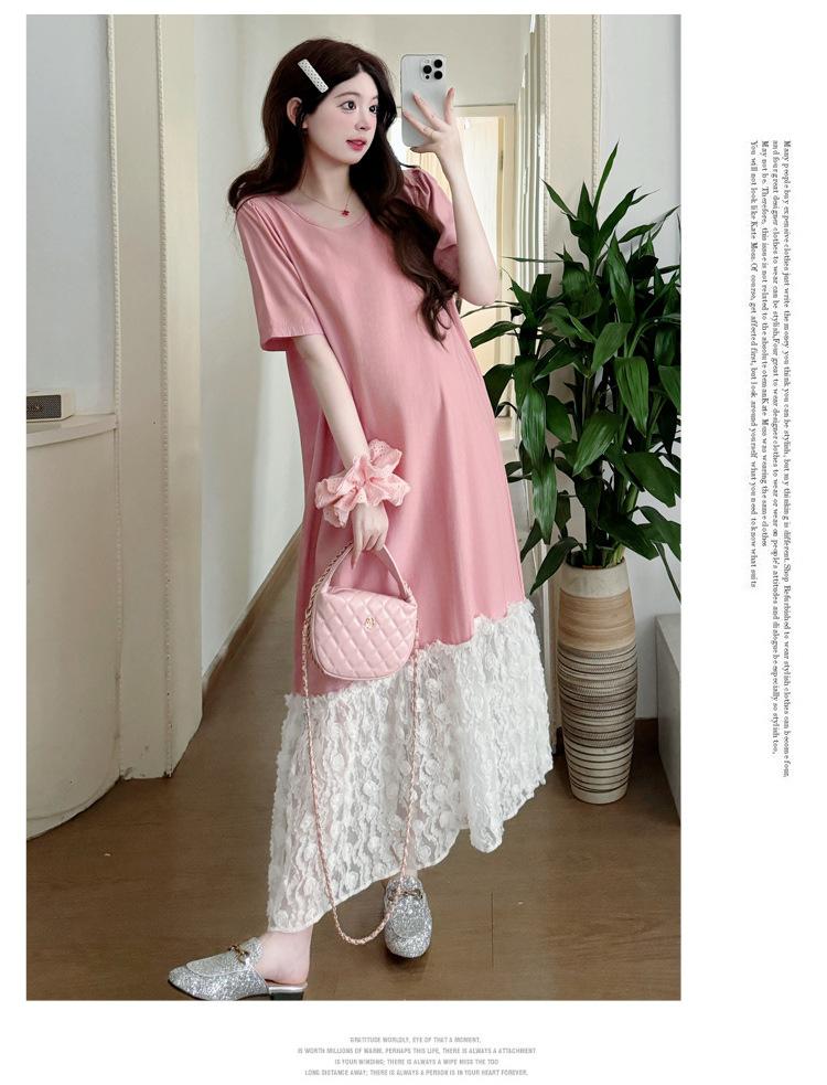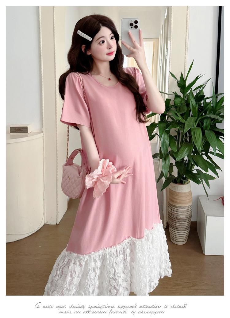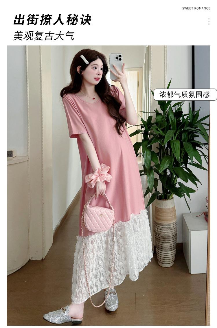Ropa de Maternidad 2025 Nuevo Estilo de Verano Dulce Rosa Francés Encaje Delicado Empalme Talla Grande Vestido de Maternidad