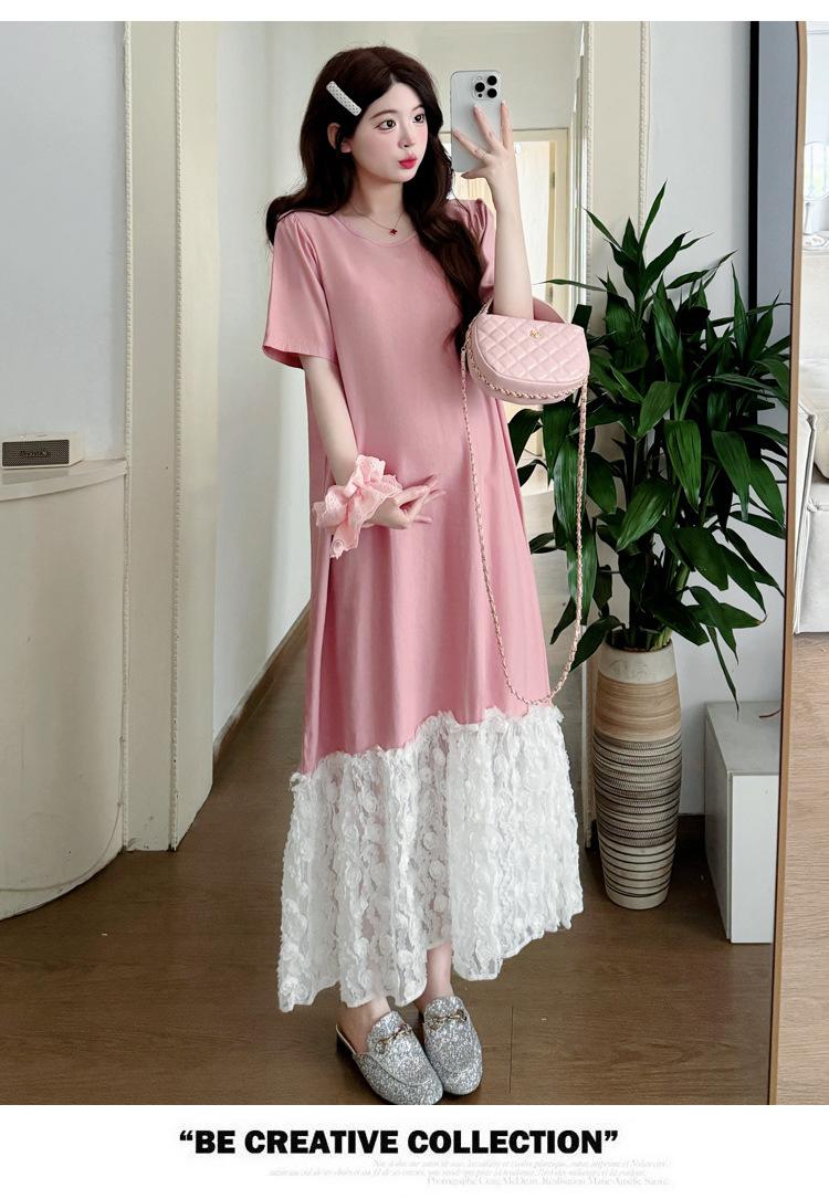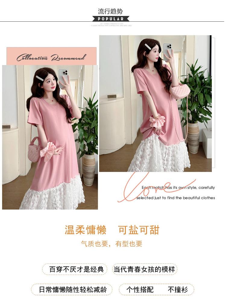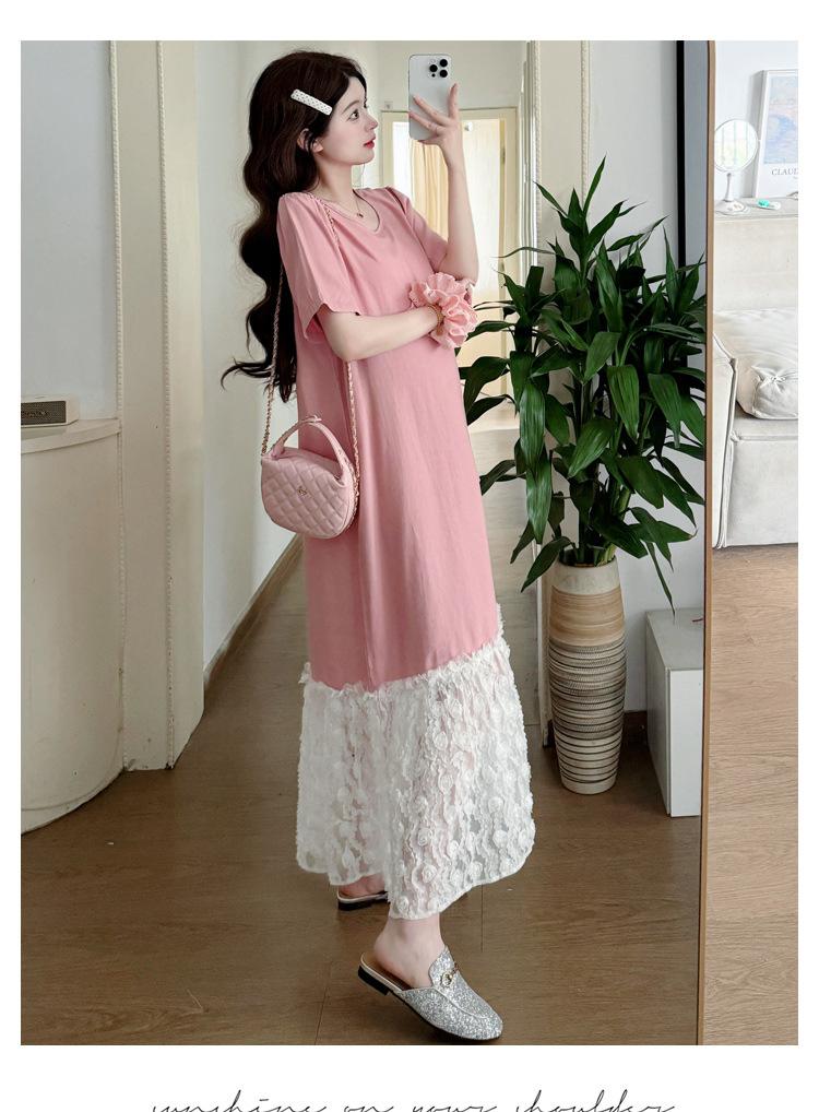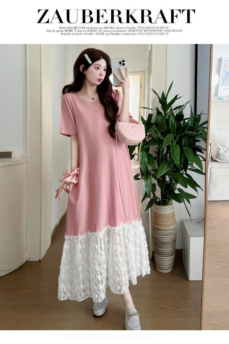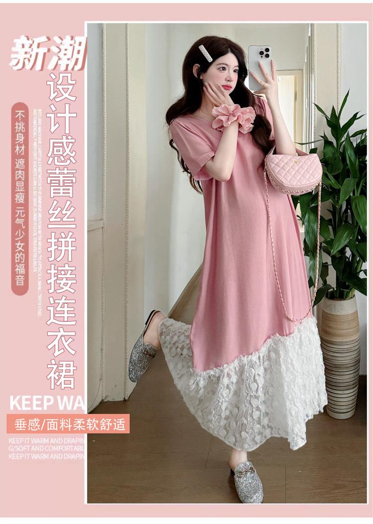 Ropa de Maternidad 2025 Nuevo Estilo de Verano Dulce Rosa Francés Encaje Delicado Empalme Talla Grande Vestido de Maternidad