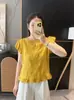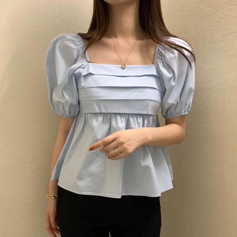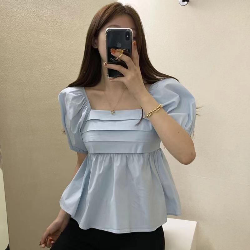 Chic Coreano Verano Suave Azul Claro Cuello Cuadrado 2025 Suelto Casual Versátil Manga Abullonada Camisa Corta para Mujer