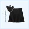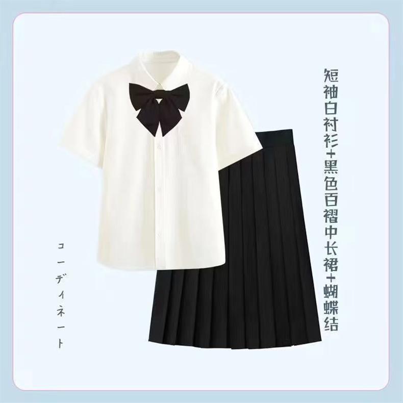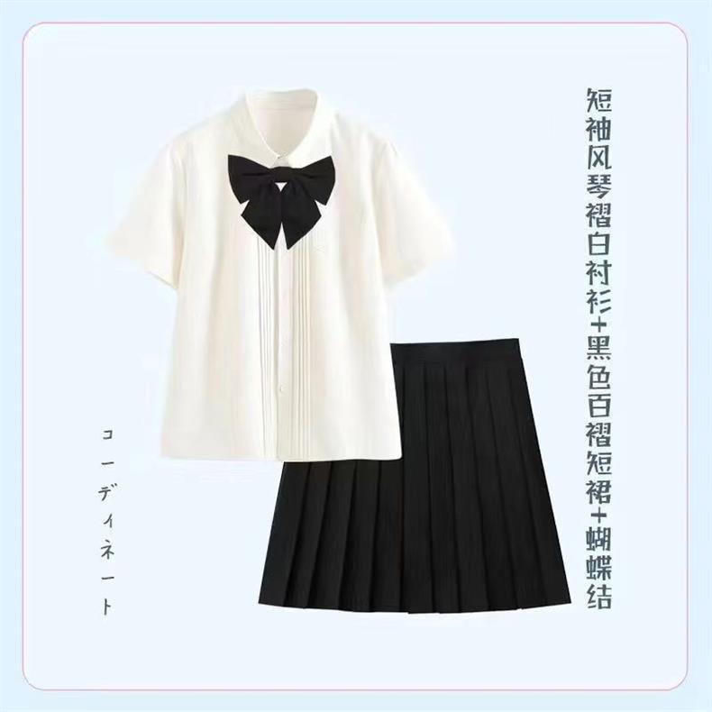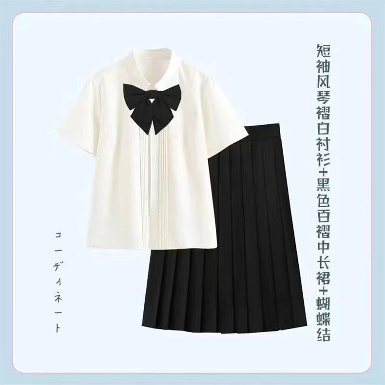 suit organ pleated short sleeve shirt black mid-skirt bow tie