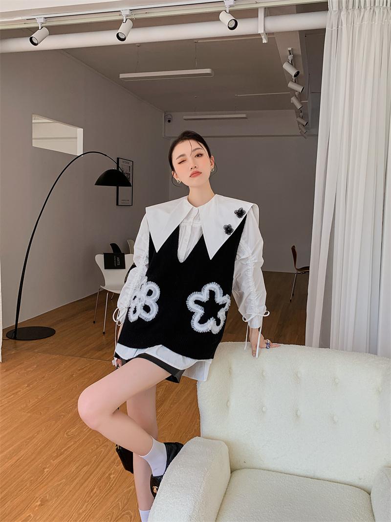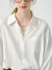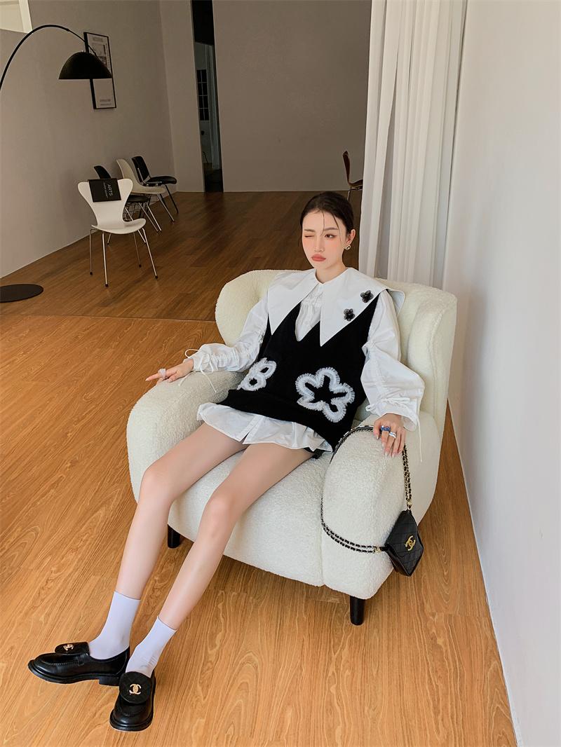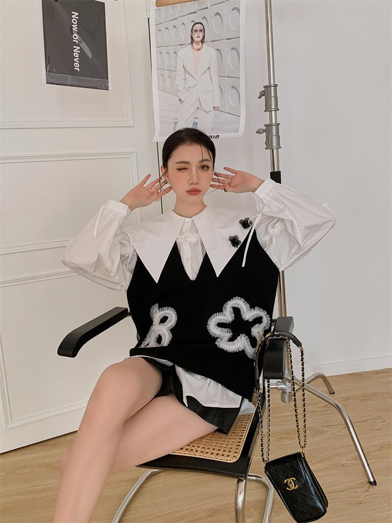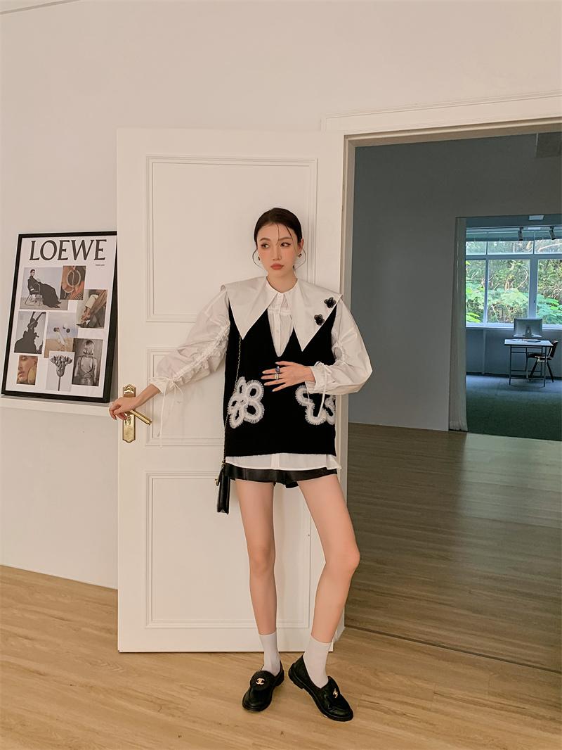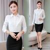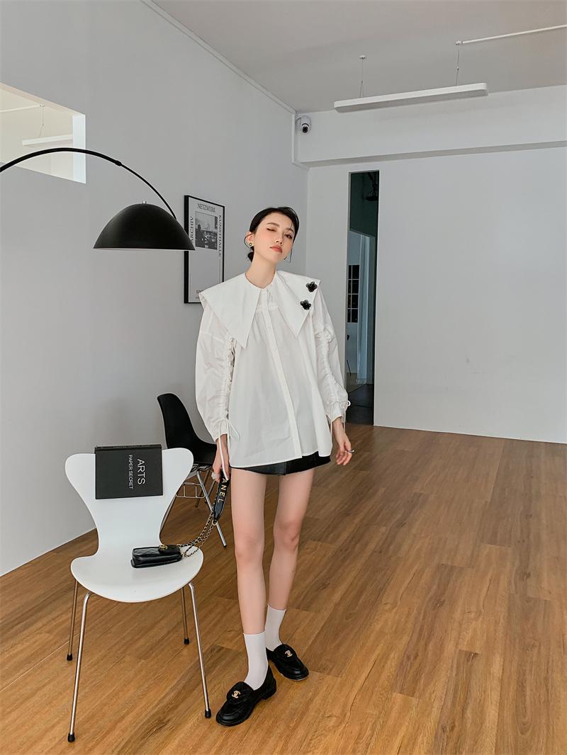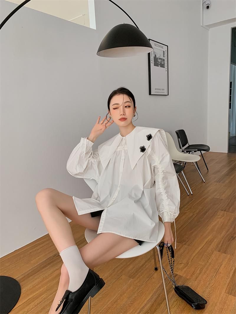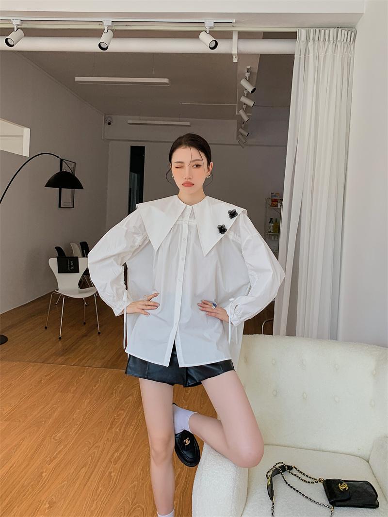 En stock camisa blanca de manga larga con cuello azul marino para mujer otoño Nuevo top holgado de moda