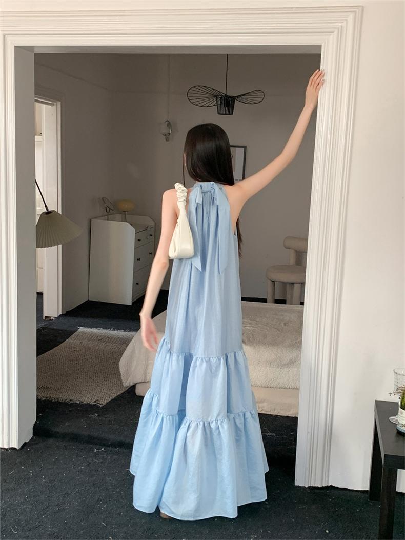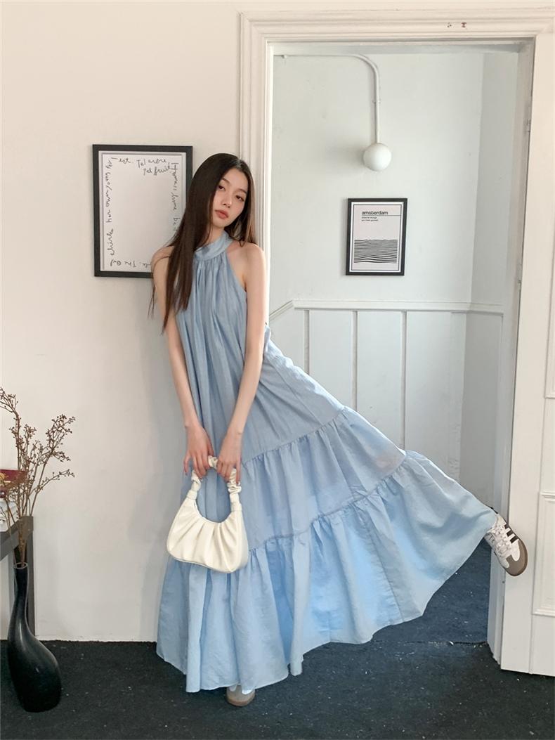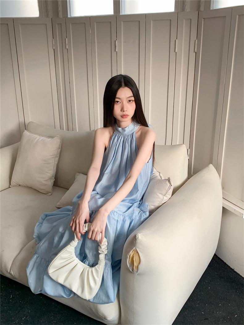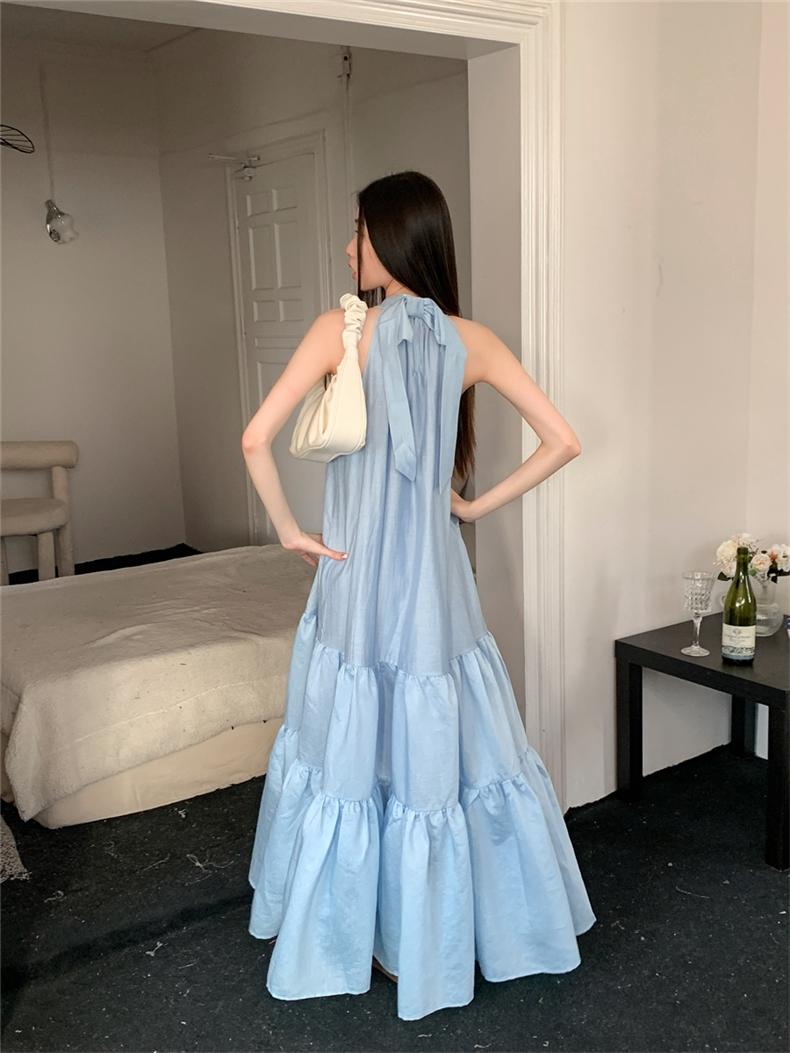 2023 en stock serie primavera y verano vestido azul cielo de cuello halter