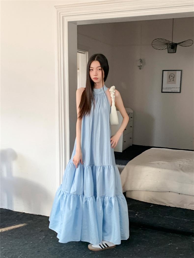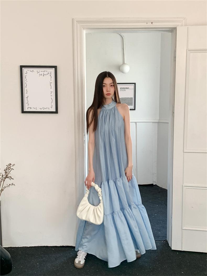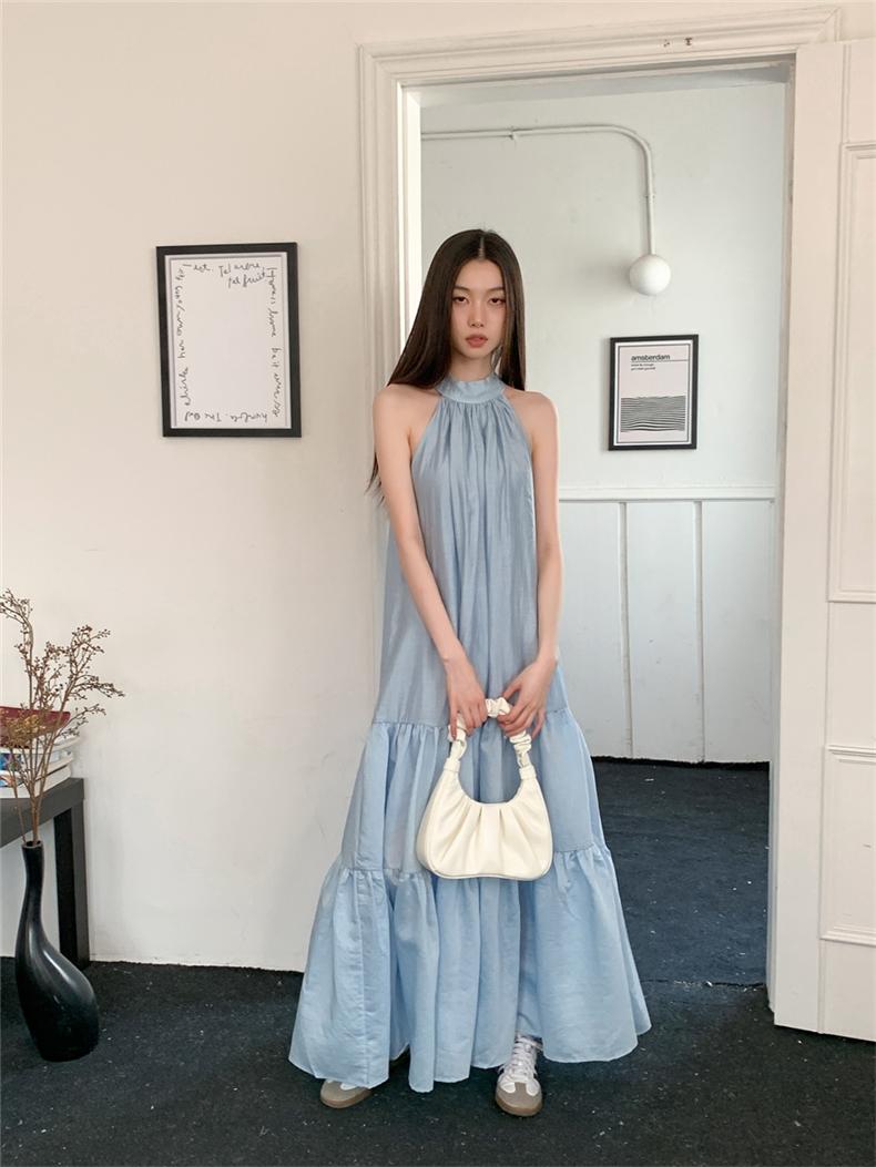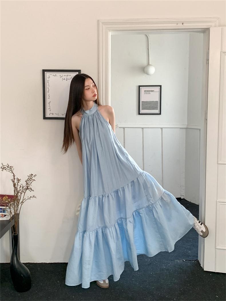 2023 en stock serie primavera y verano vestido azul cielo de cuello halter