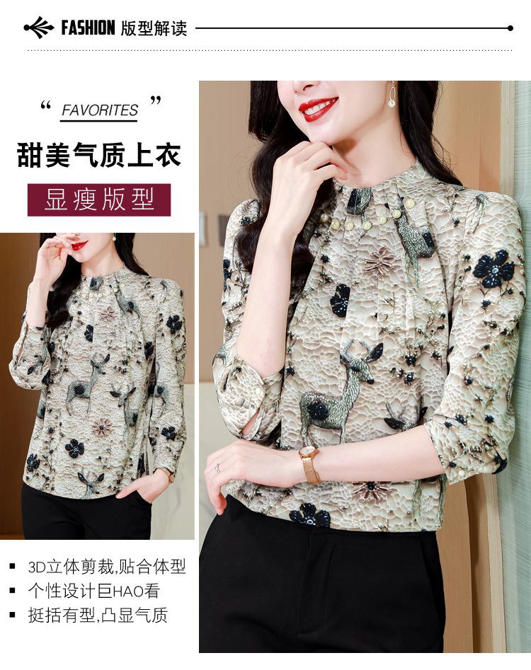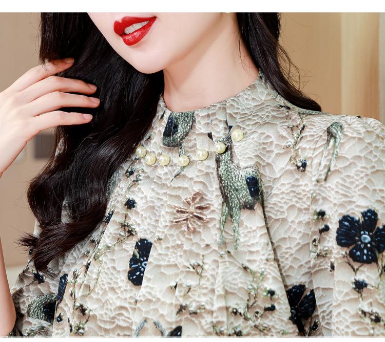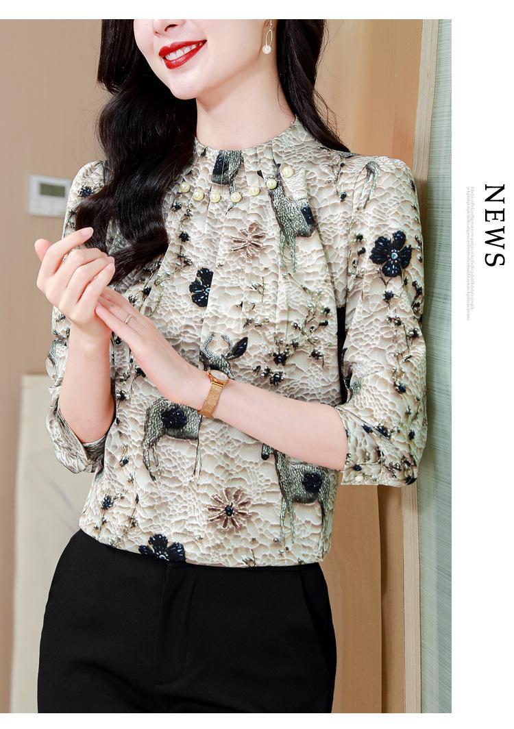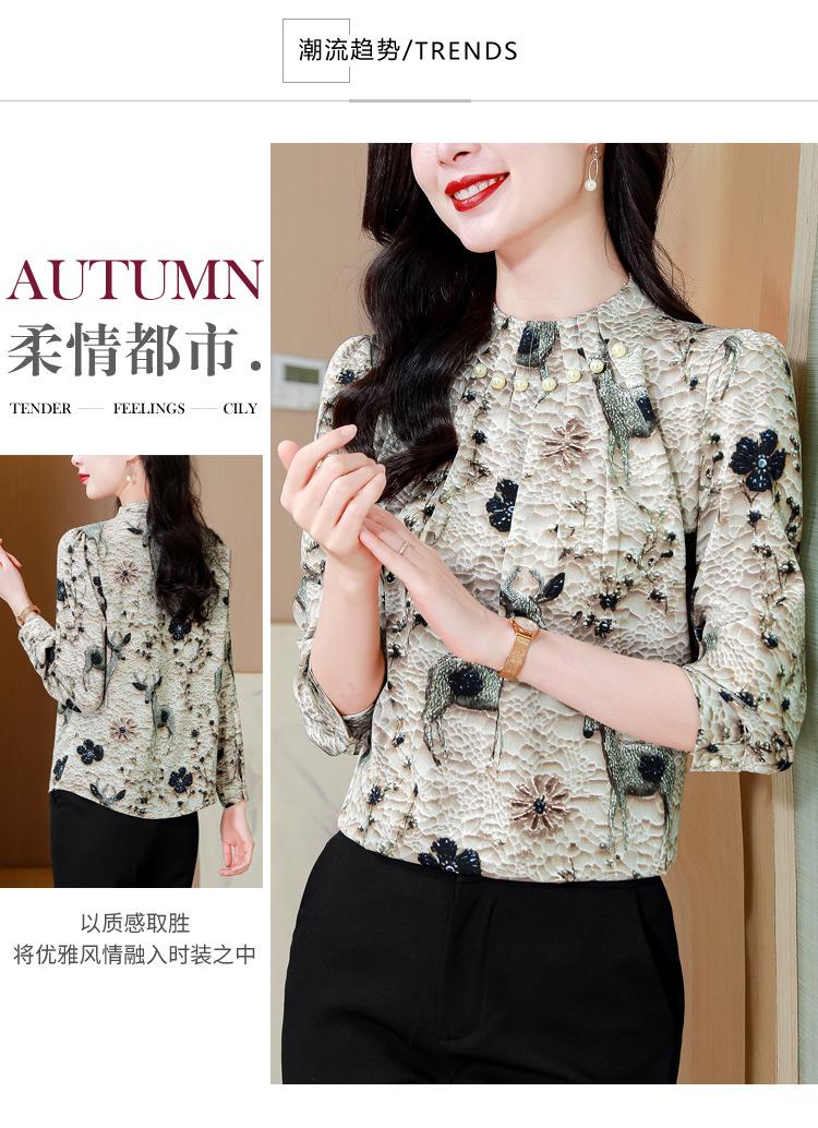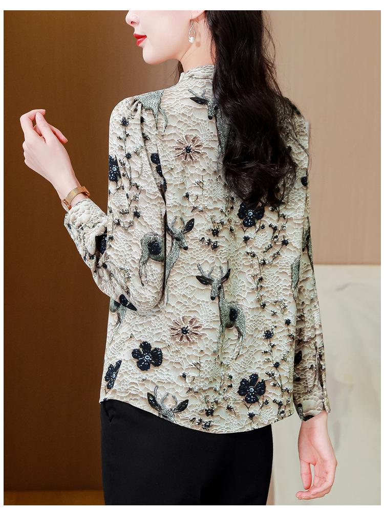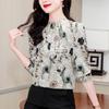 Nueva Camisa de Chifón de Otoño para Mujer con Cuello Alto de Satén, Estampado con Cuentas y Manga Larga, Camisa de Moda de Otoño para Mujer