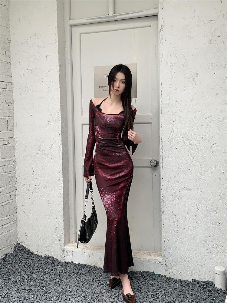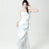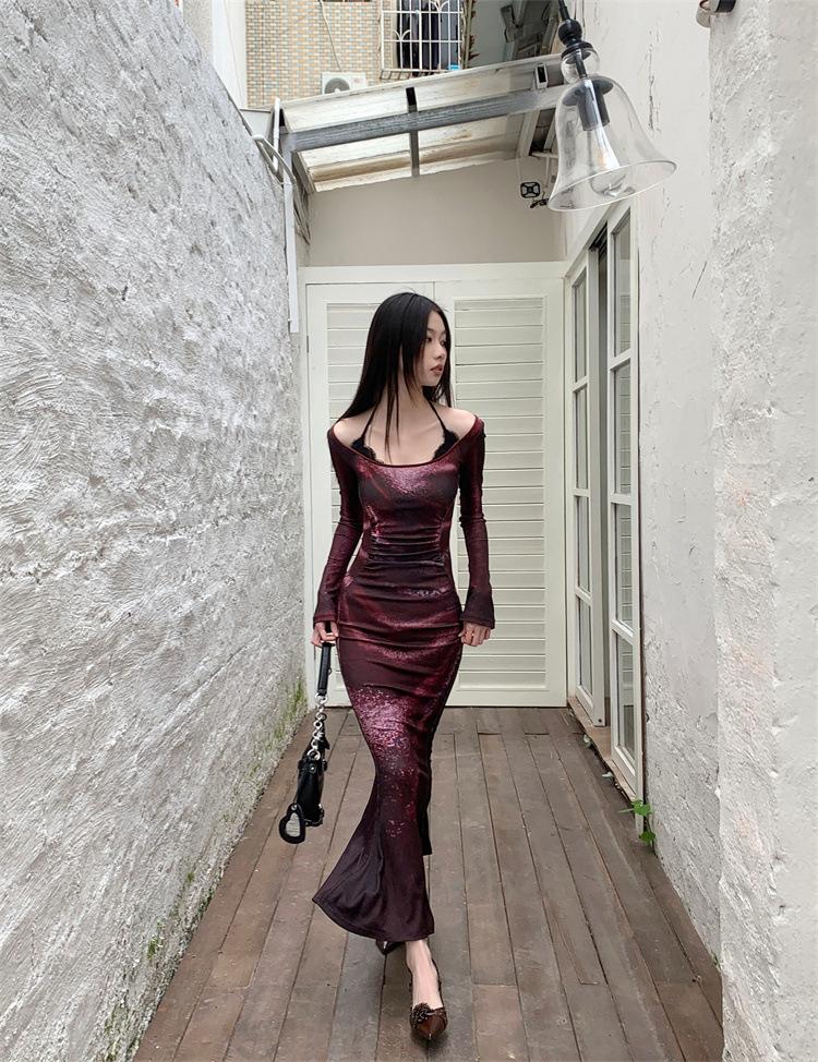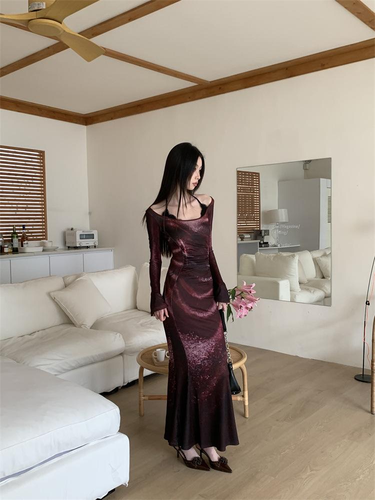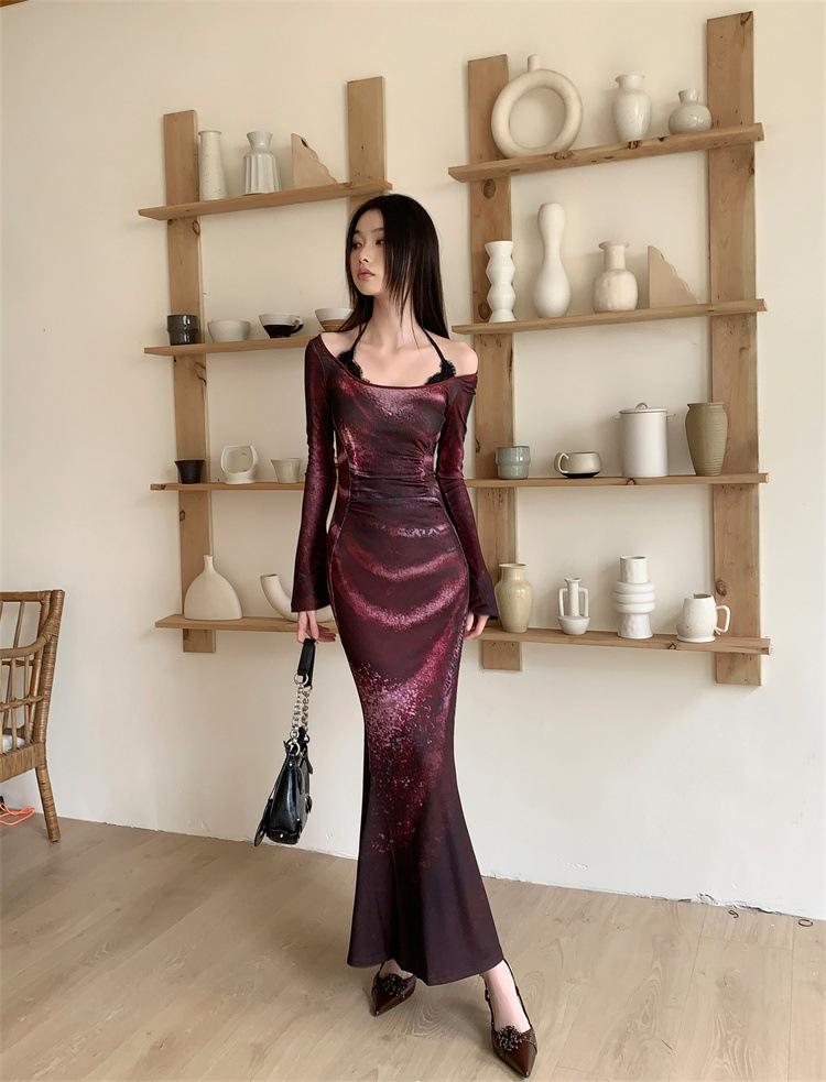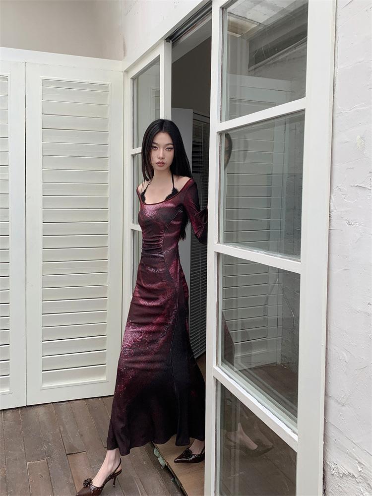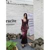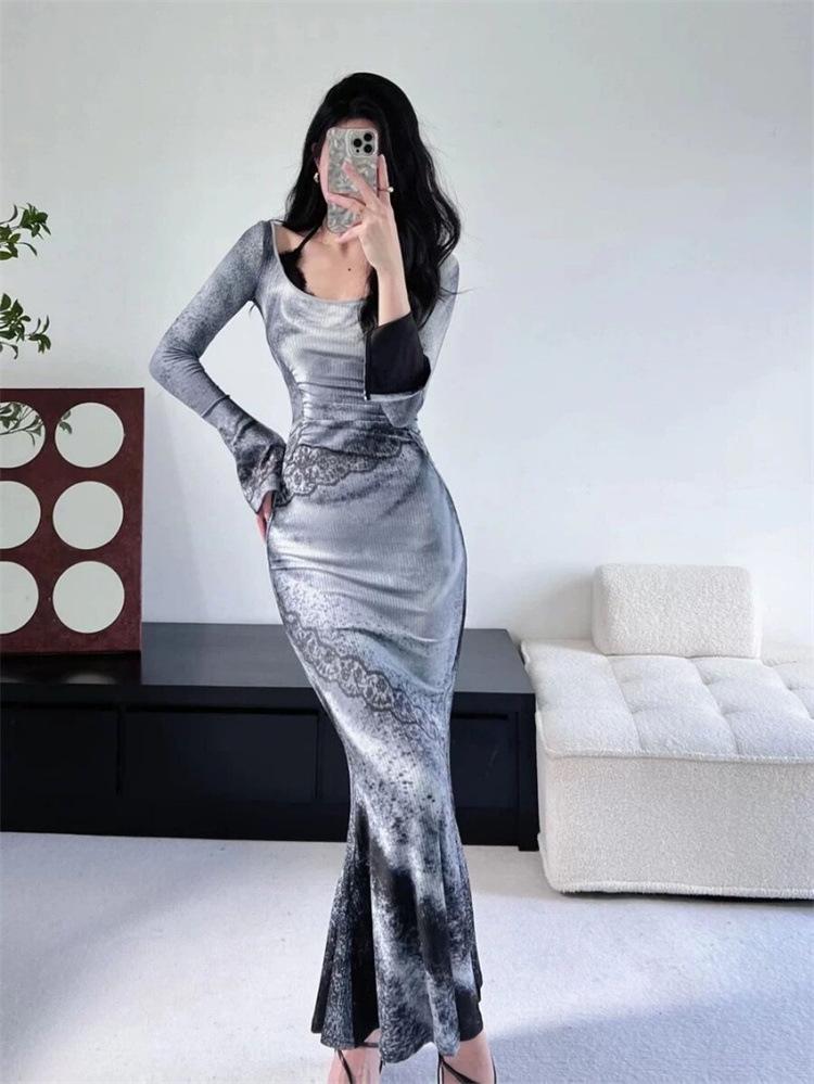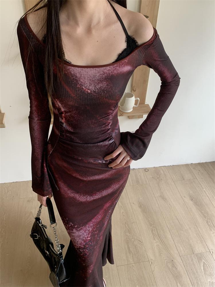 Foto Real de Vestido Estampado de Encaje de Dos Piezas Falso en Existencia para Mujer con Falda de Cola de Pez con Volantes