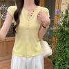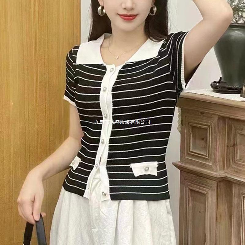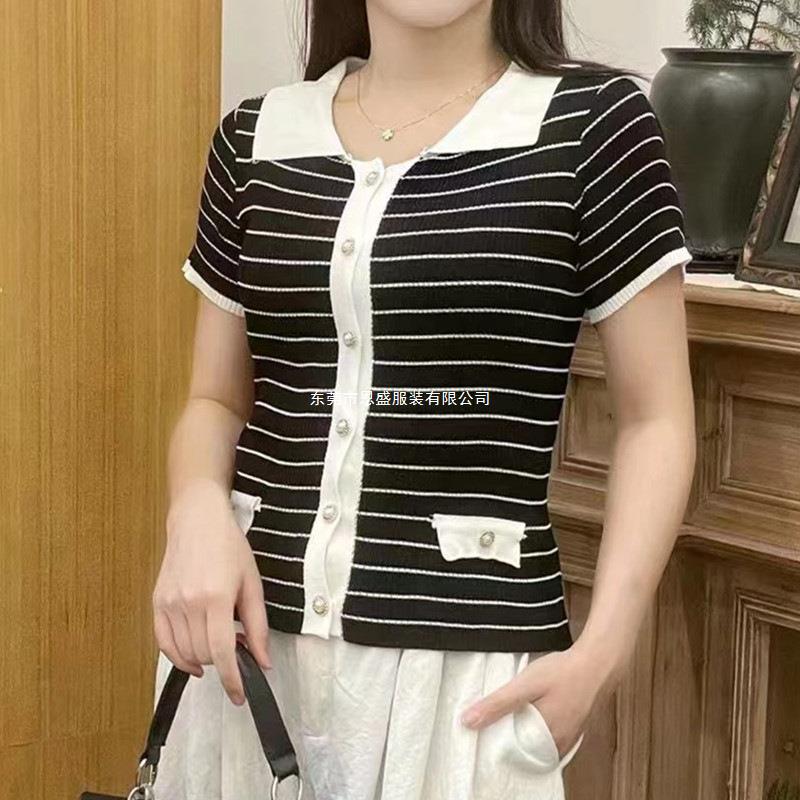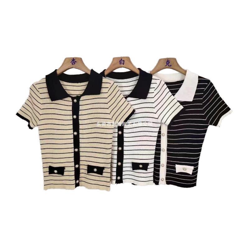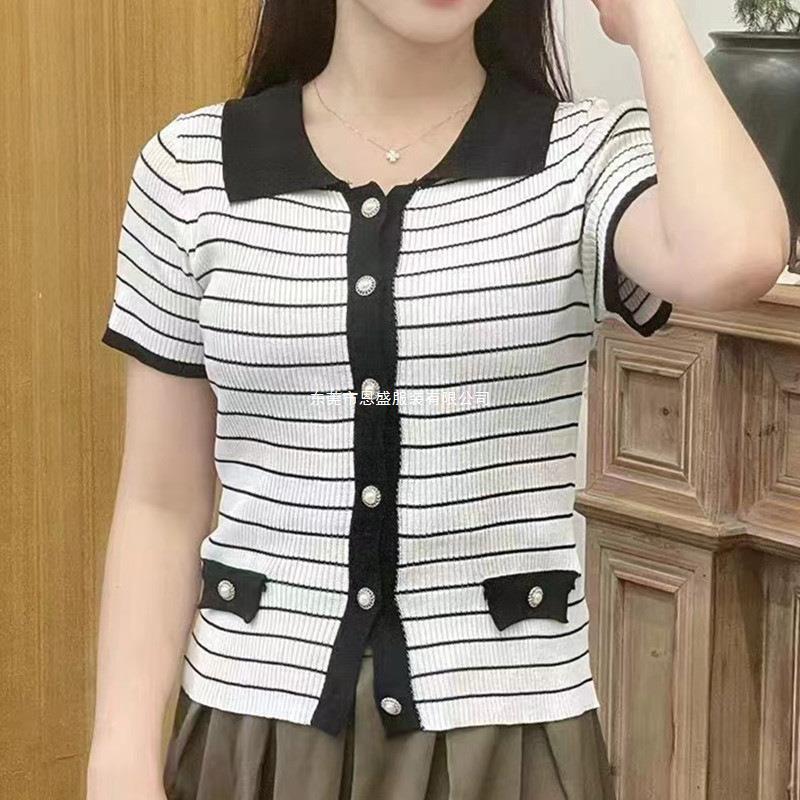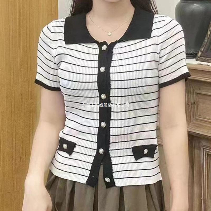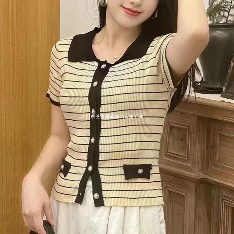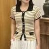 2024 Nuevo Verano Estilo Coreano Versátil Moderno Solapa Rayas Tejido de Punto Manga Corta Camiseta Cárdigan Top para Mujer