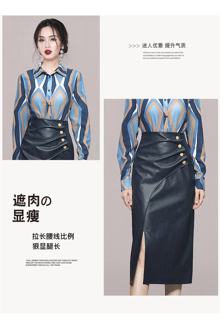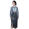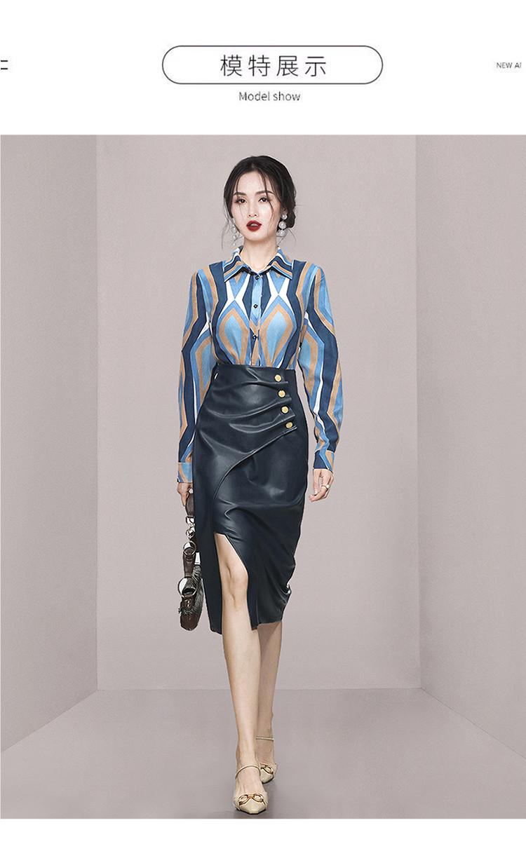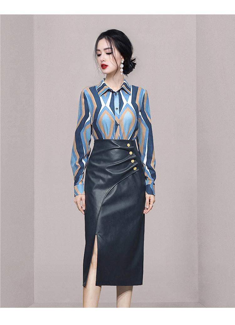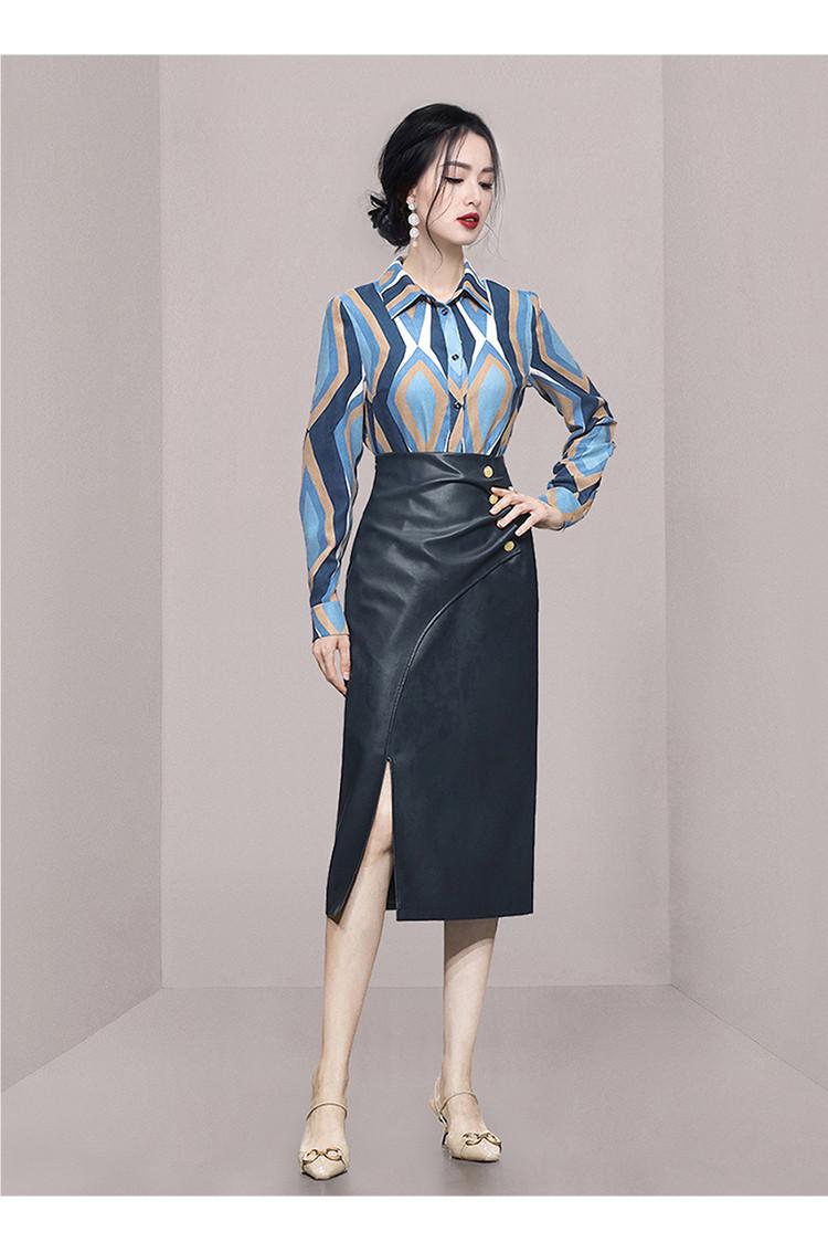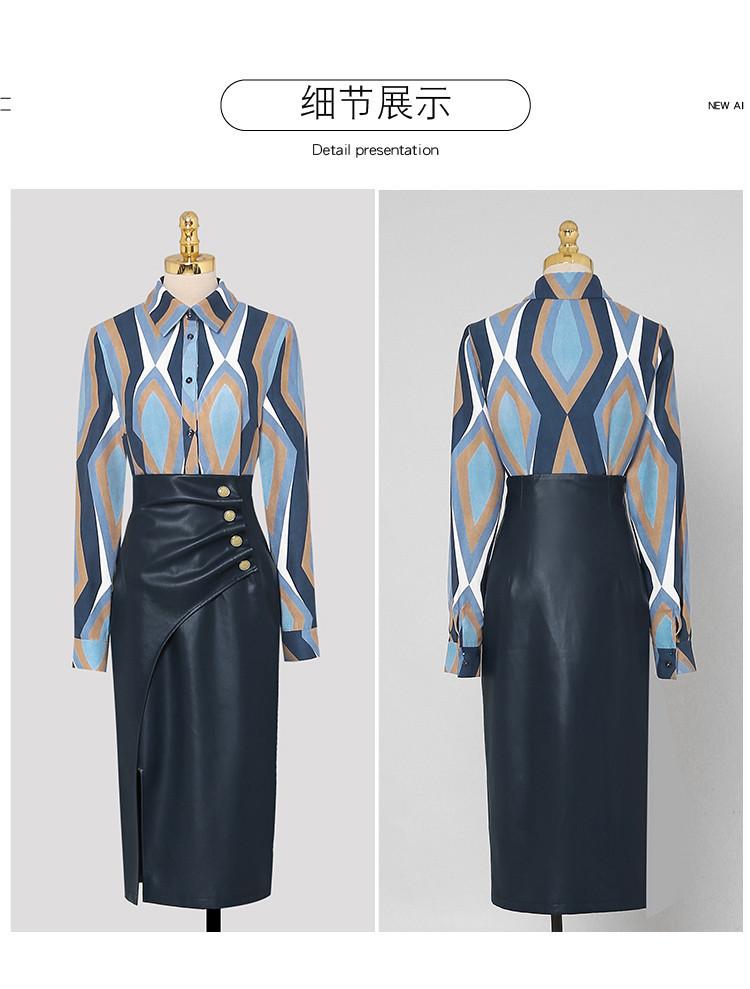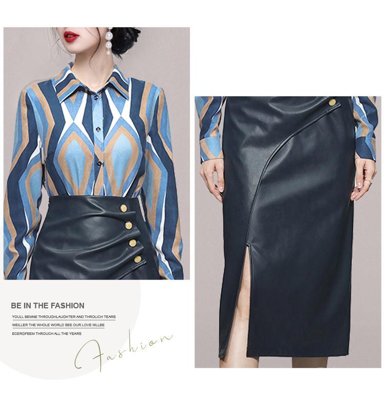 Nuevo conjunto de dos piezas para mujer de moda coreana 2025 transfronterizo, camisa de solapa estampada, falda midi de PU con abertura ajustada de cintura alta