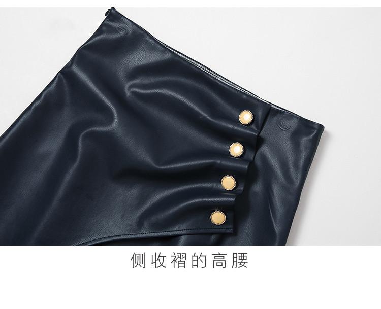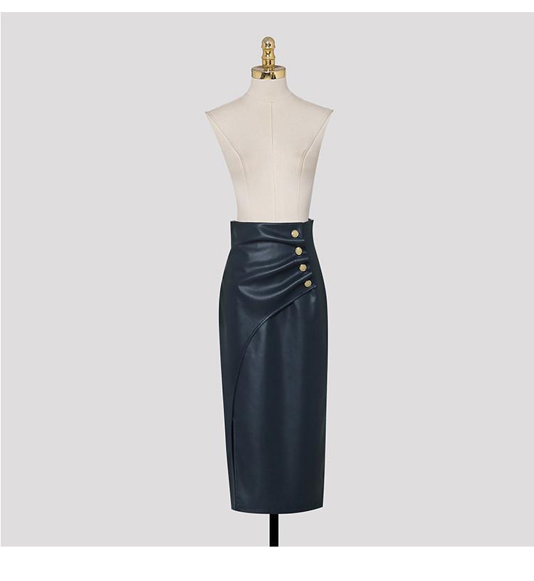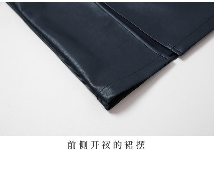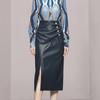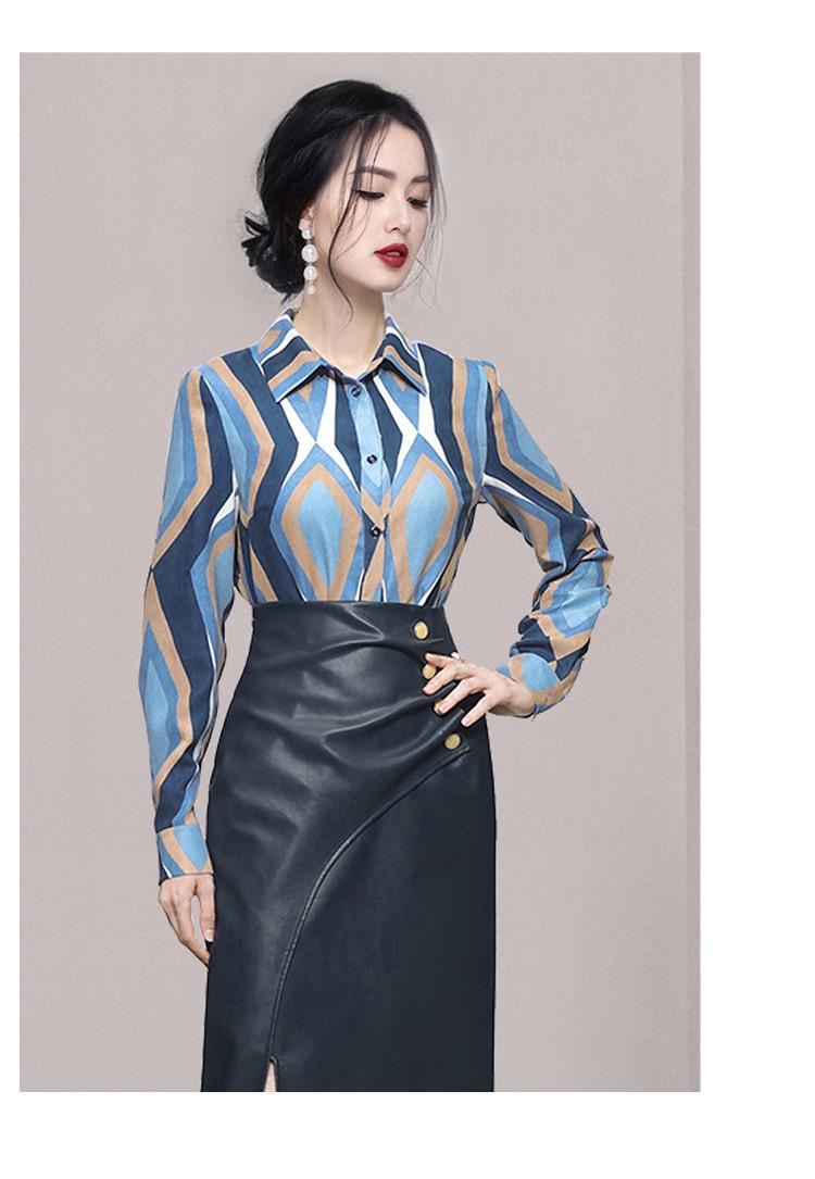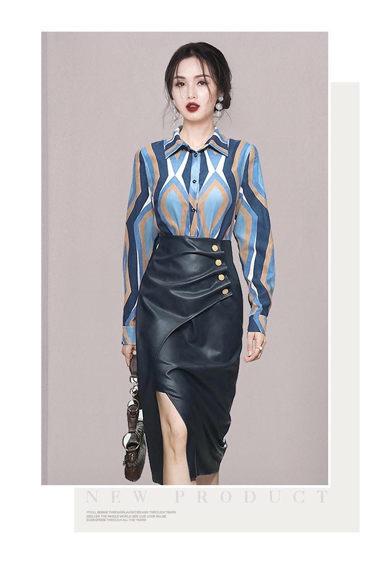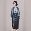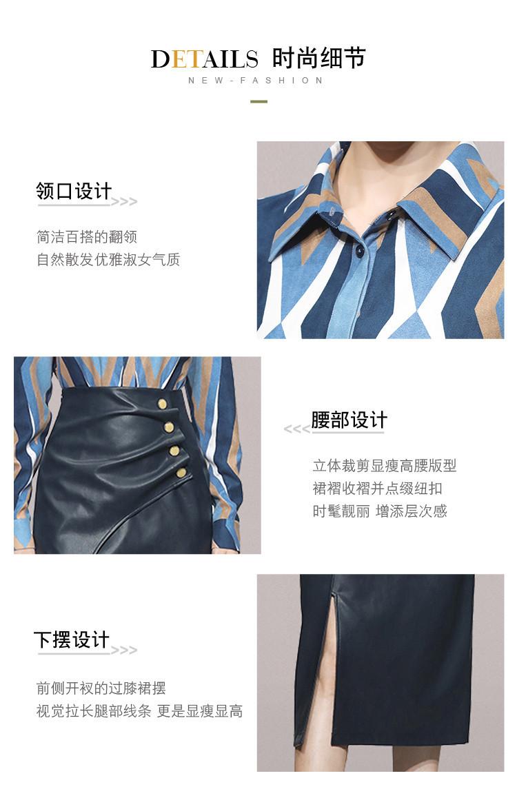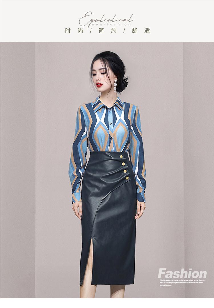 Nuevo conjunto de dos piezas para mujer de moda coreana 2025 transfronterizo, camisa de solapa estampada, falda midi de PU con abertura ajustada de cintura alta