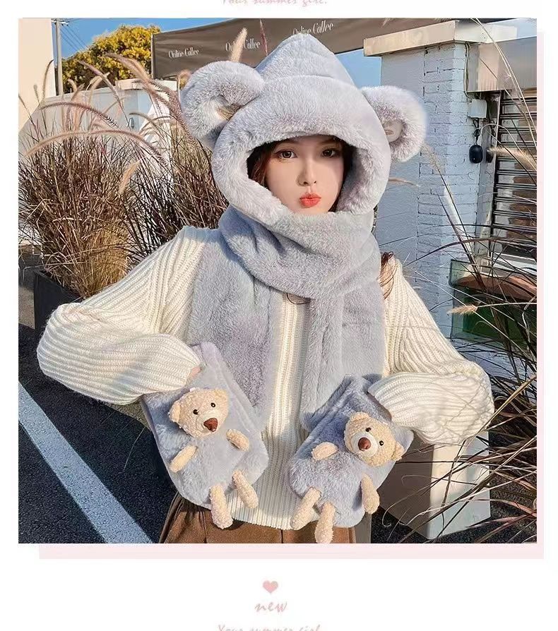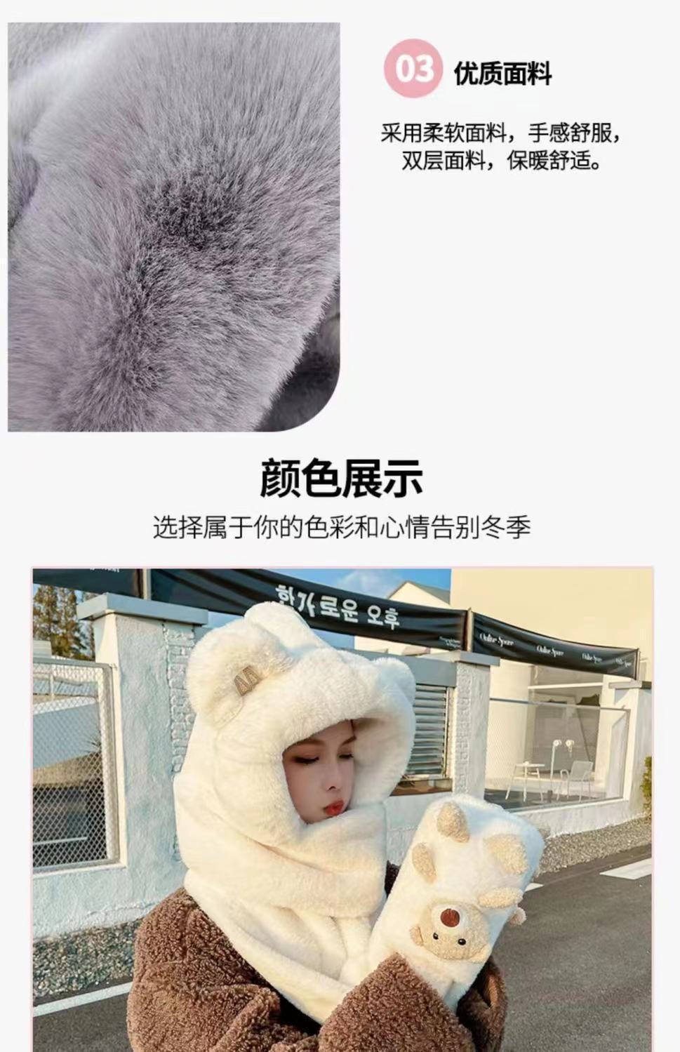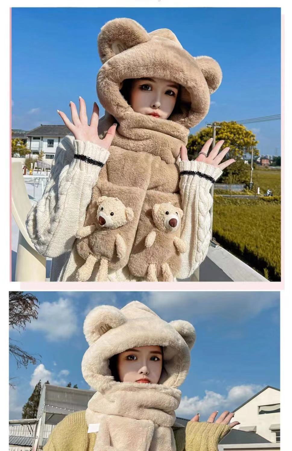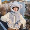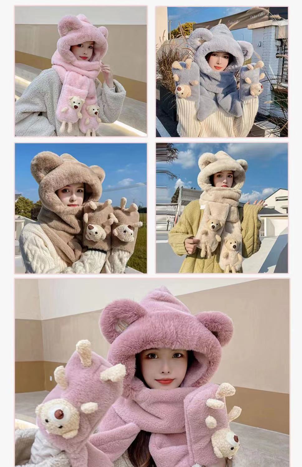 Gorro de Osito para Mujer Bufanda de Invierno Guantes Juego de Tres Piezas Integrado Estudiante Pelo de Conejo Forro Polar Grueso Cálido Gorro de Felpa