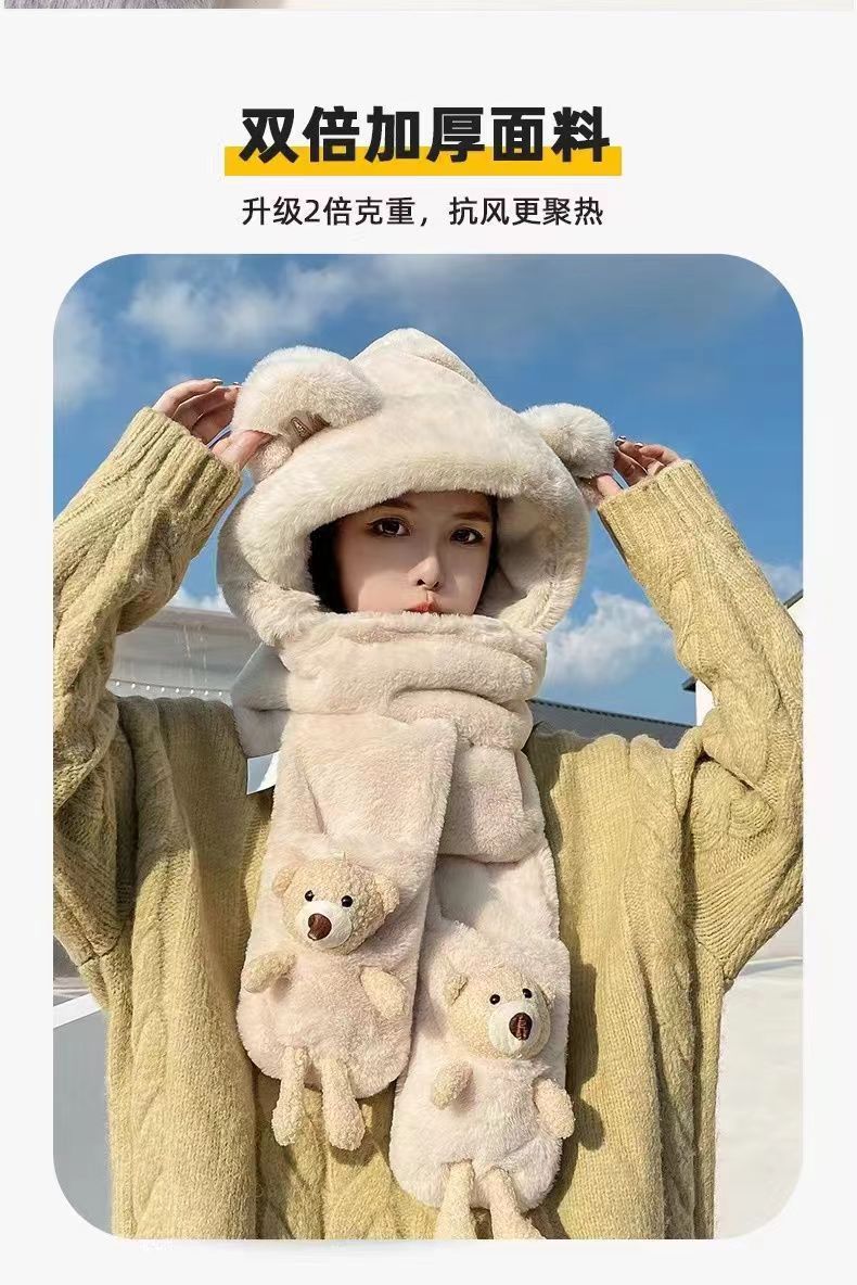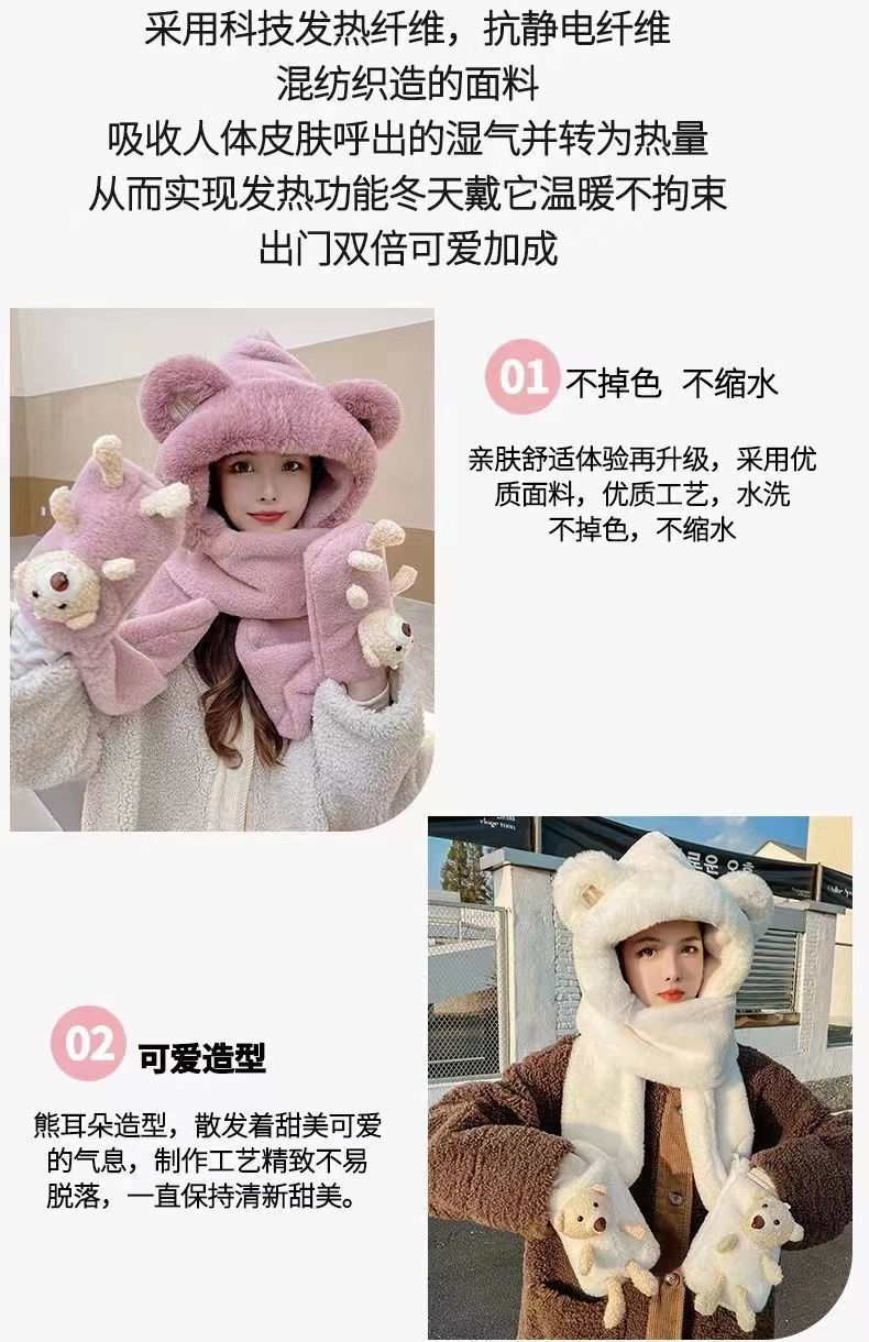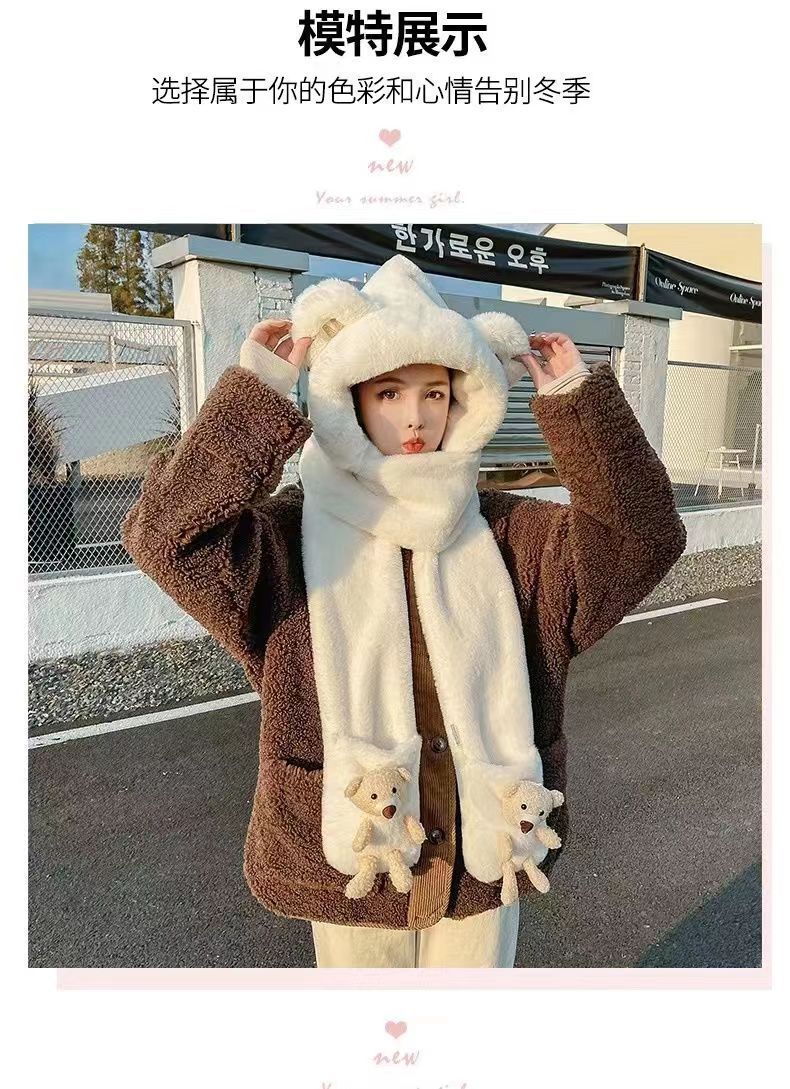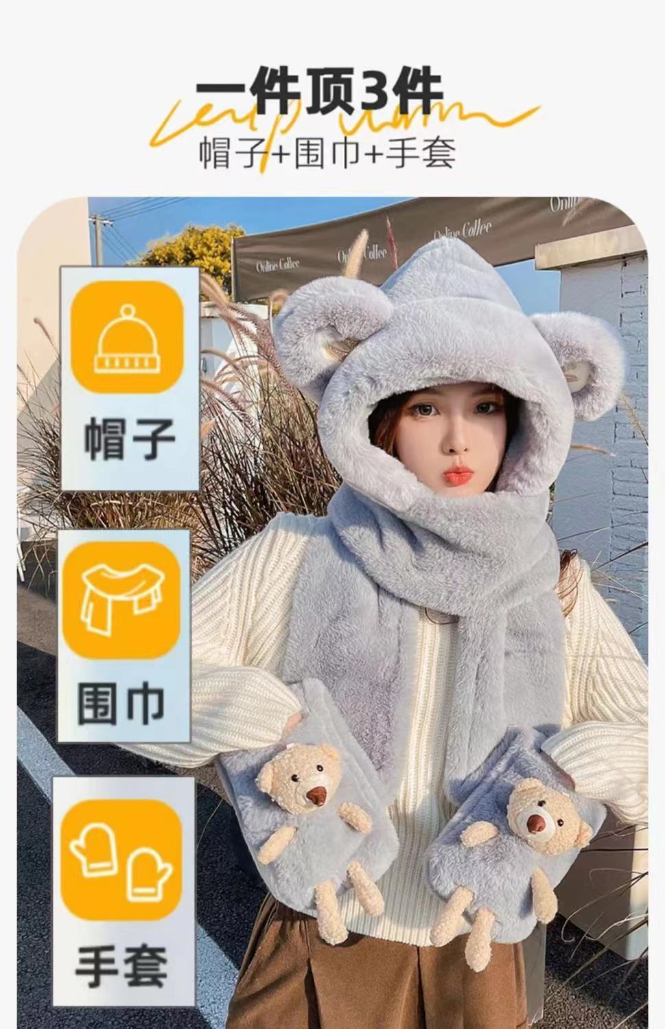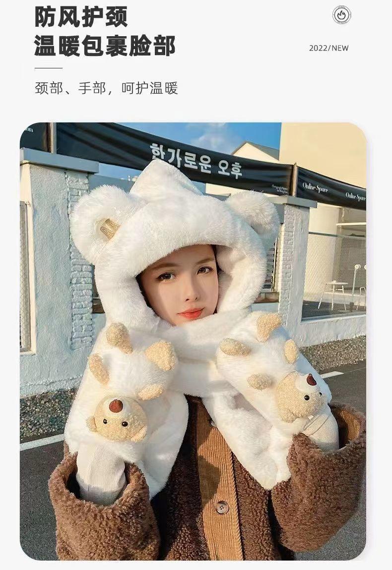 Gorro de Osito para Mujer Bufanda de Invierno Guantes Juego de Tres Piezas Integrado Estudiante Pelo de Conejo Forro Polar Grueso Cálido Gorro de Felpa