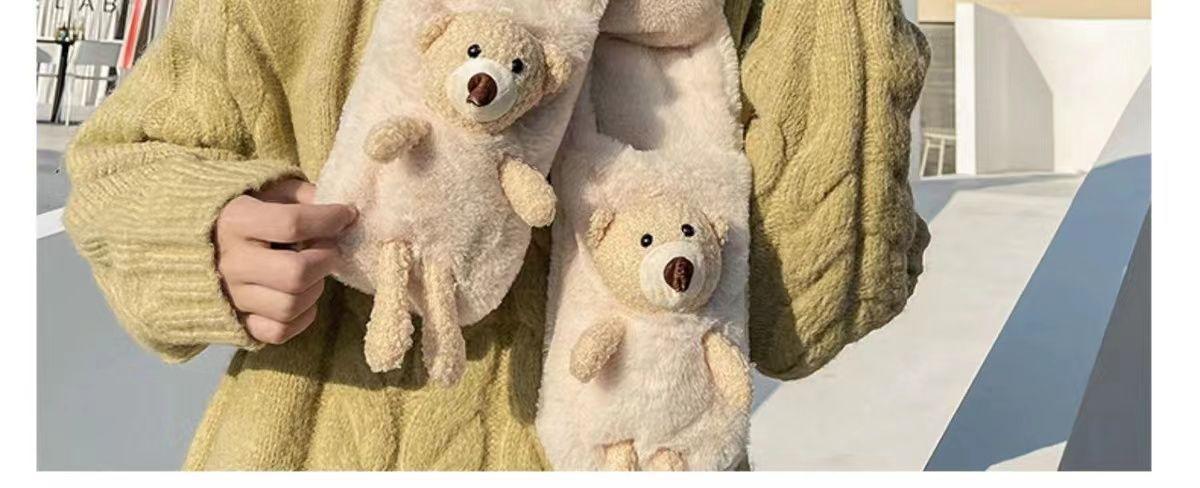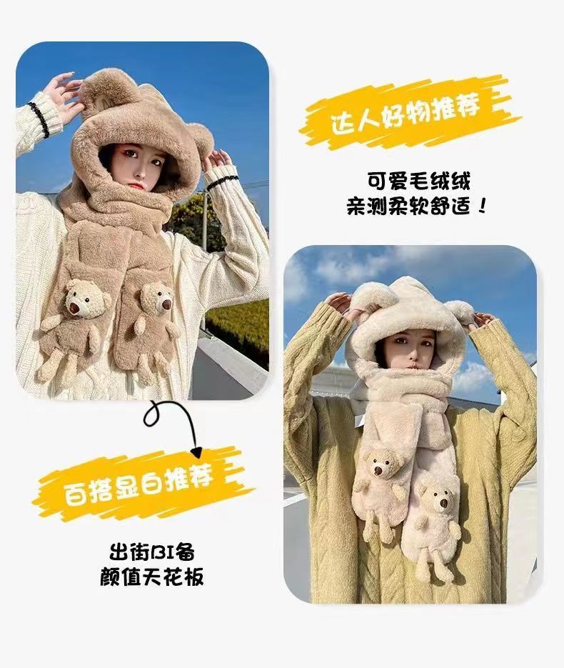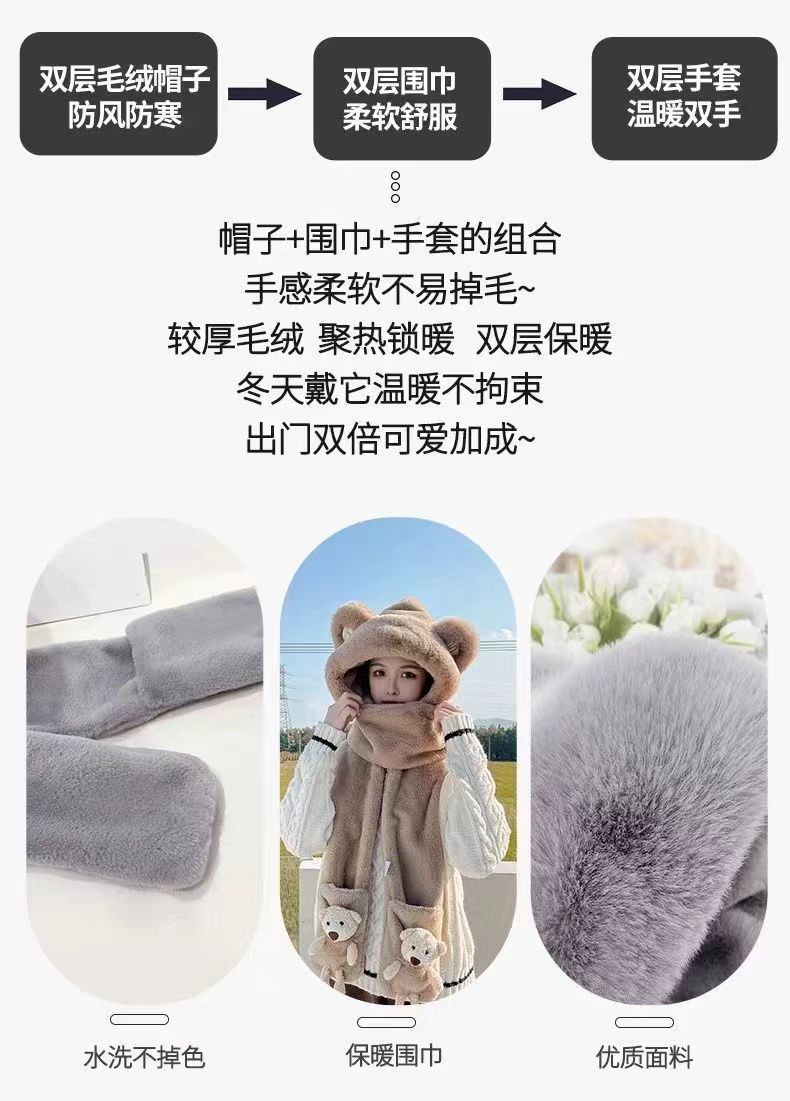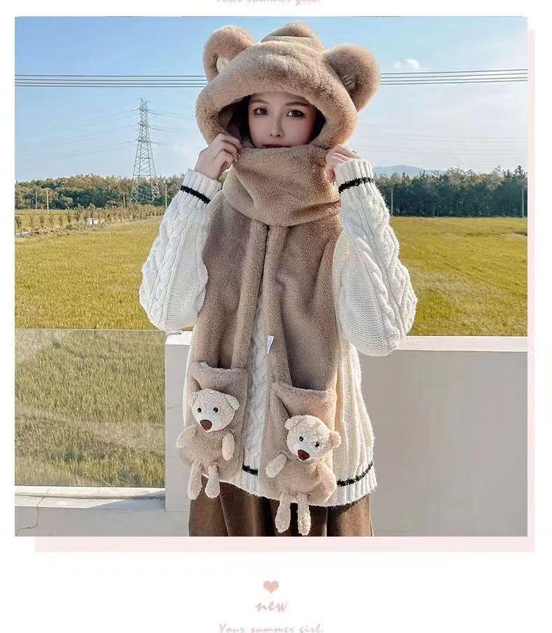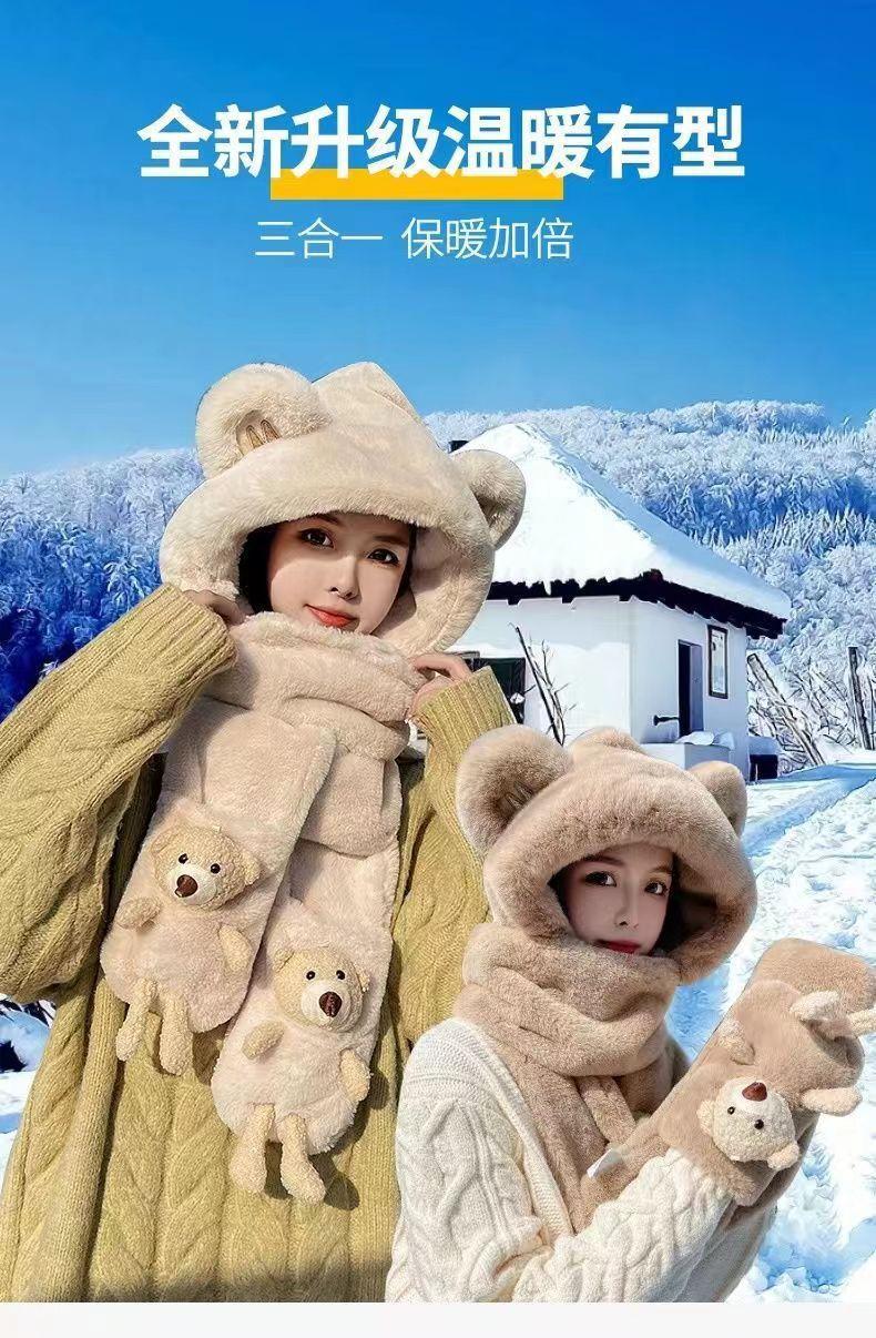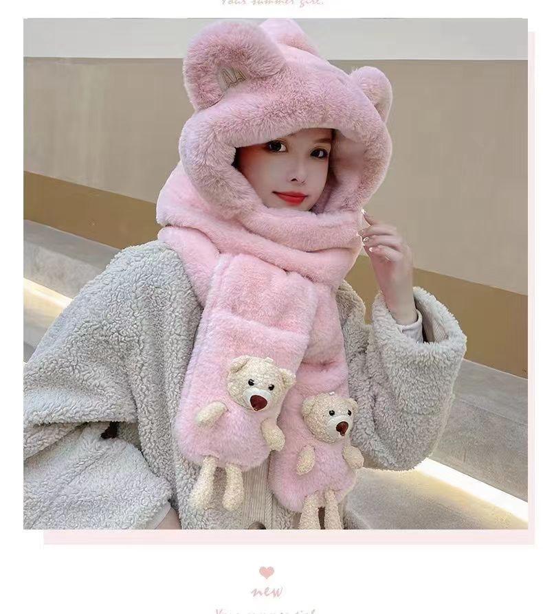 Gorro de Osito para Mujer Bufanda de Invierno Guantes Juego de Tres Piezas Integrado Estudiante Pelo de Conejo Forro Polar Grueso Cálido Gorro de Felpa