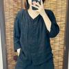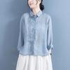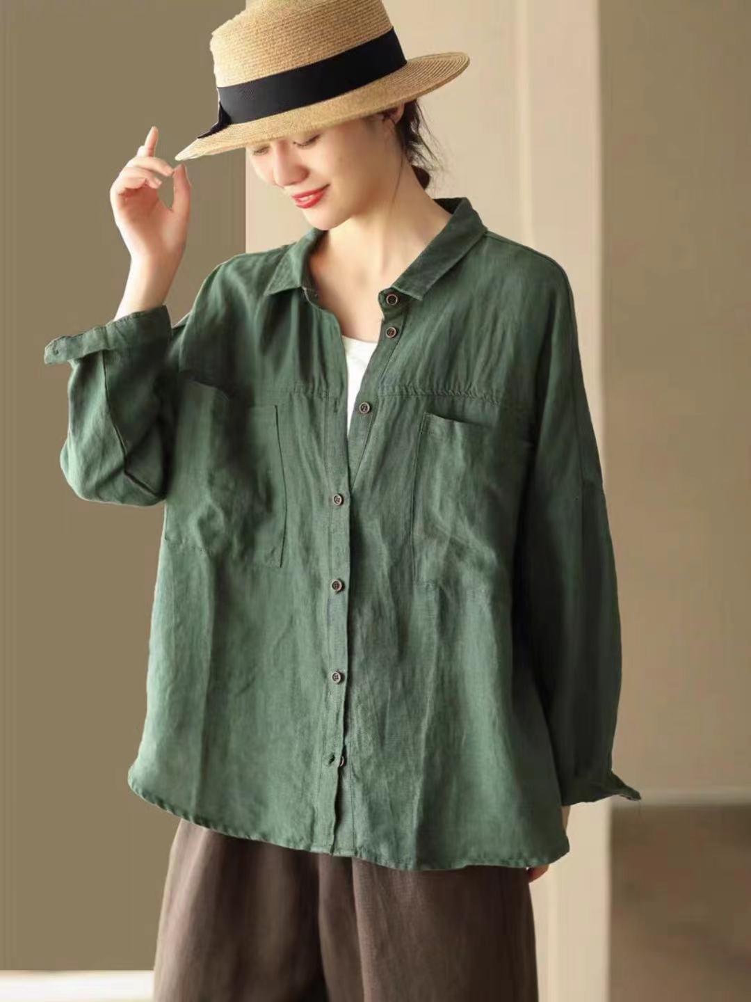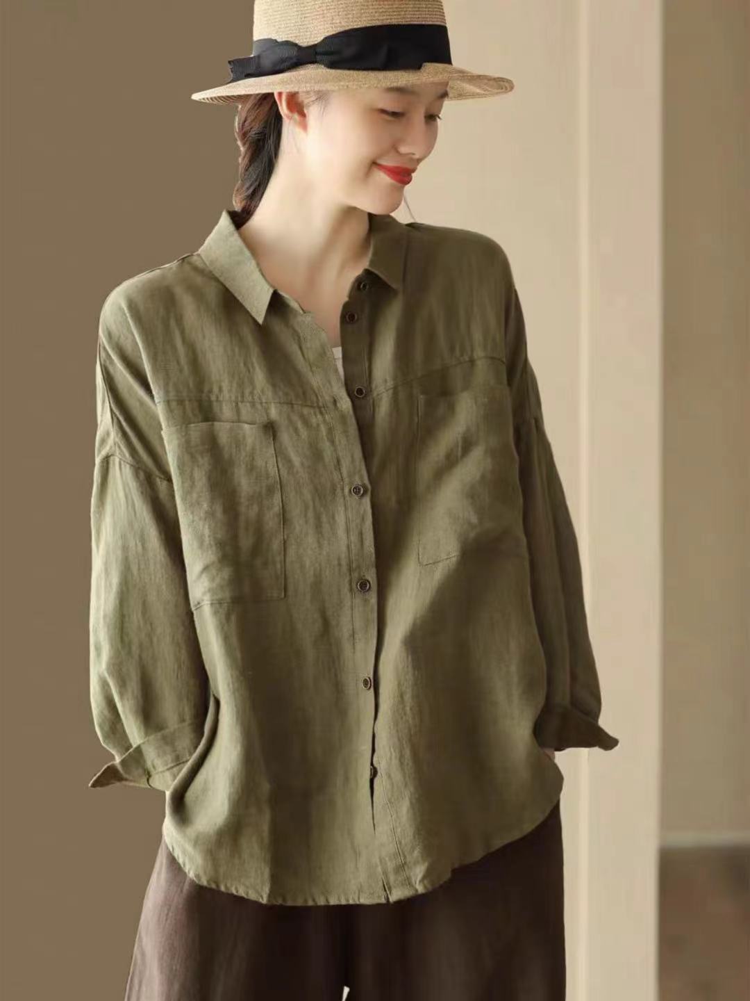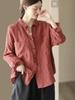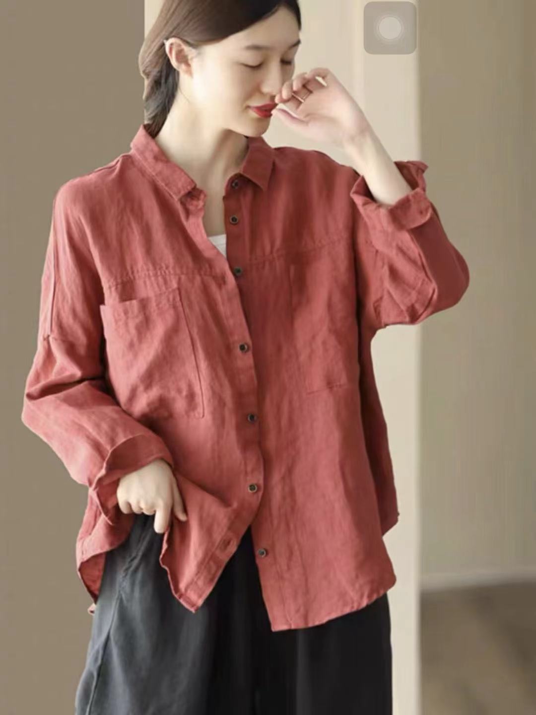 Cárdigan de Lino Otoñal con Cuello Vuelto Literario Versátil Holgado Casual Adelgazante Manga Larga Camisa Color Sólido Top Simple para Mujer