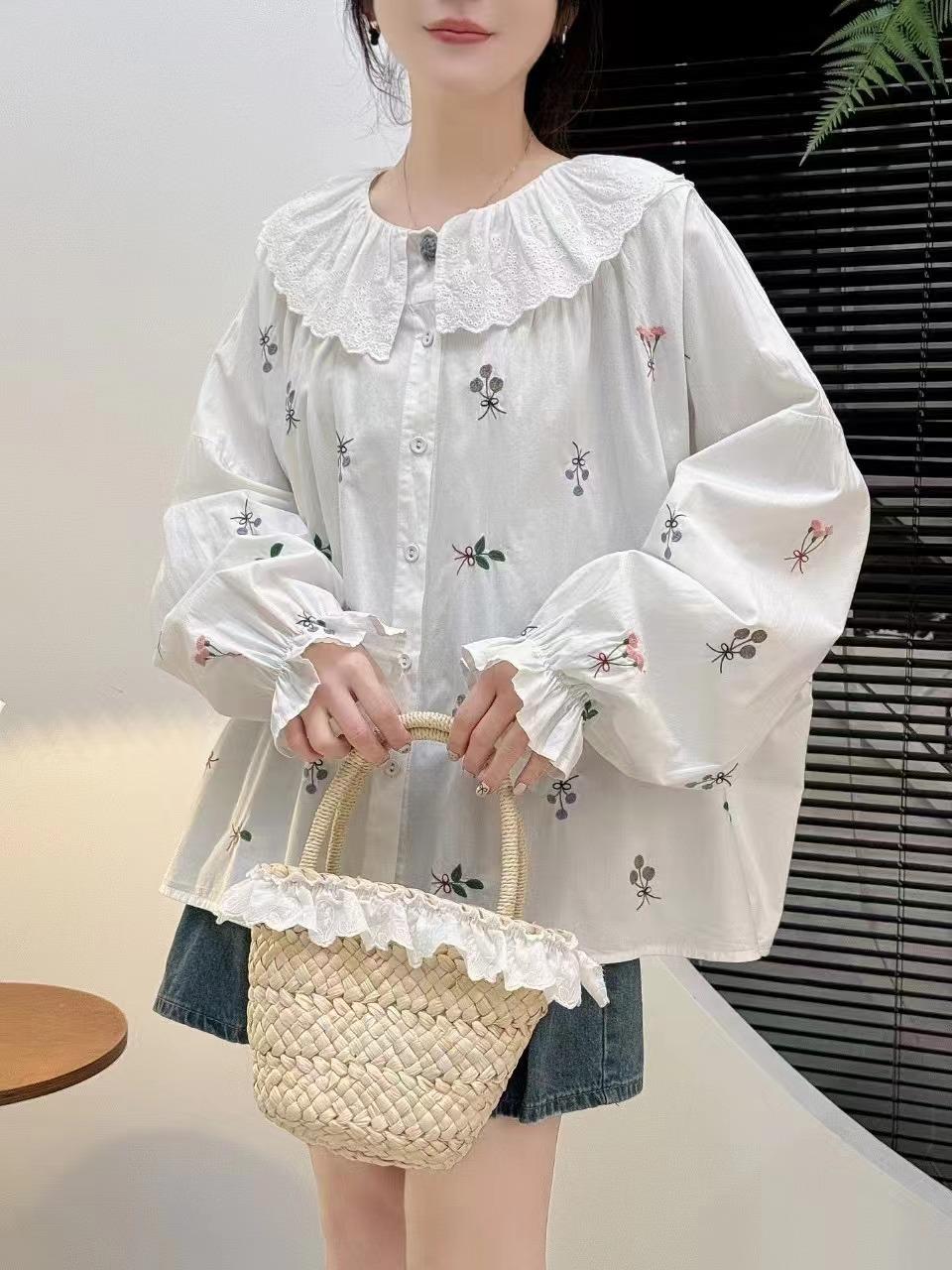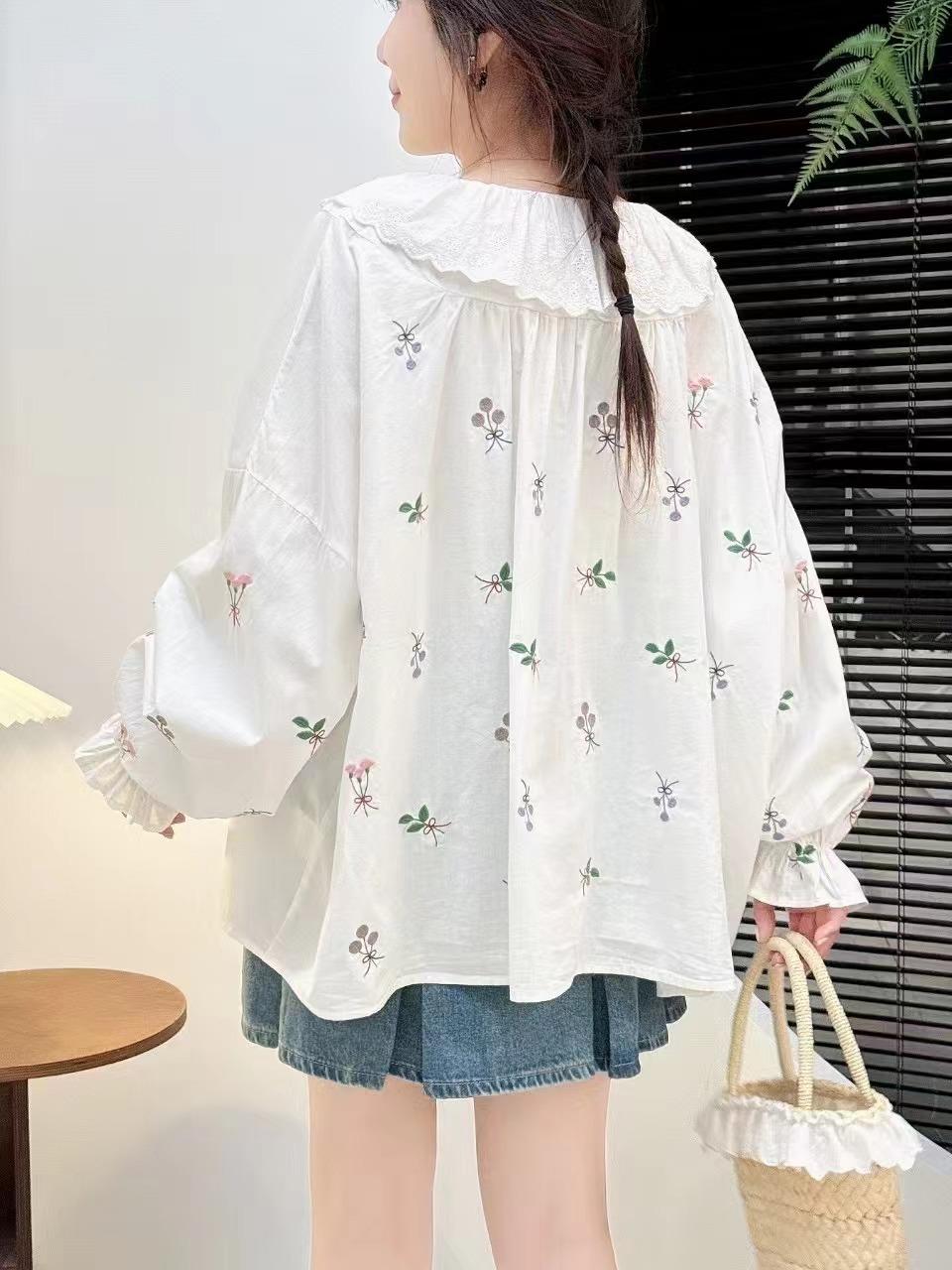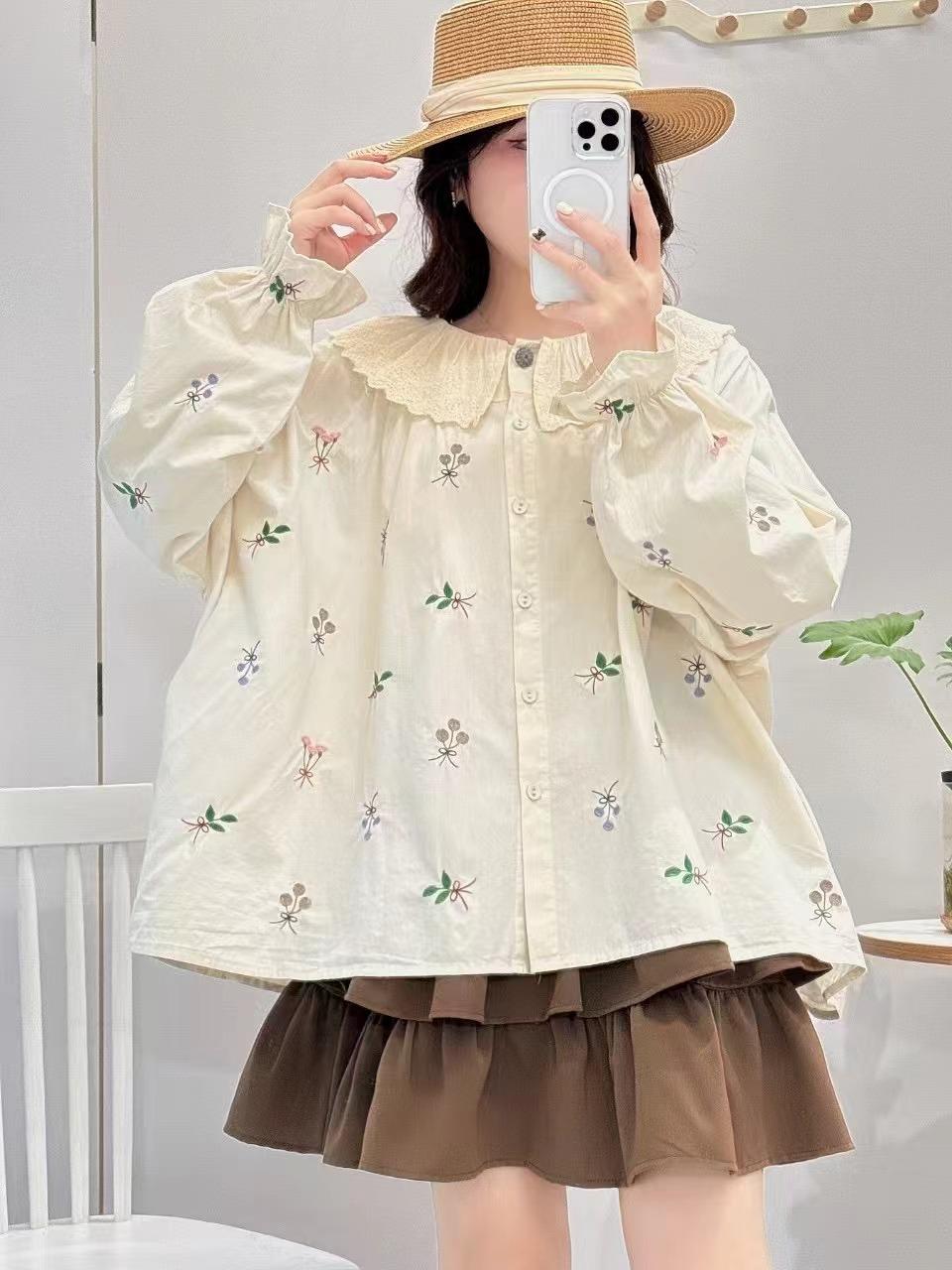 Nueva Camisa de Algodón con Bordado Floral de Primavera y Otoño, Cuello con Adorno de Encaje, Holgada, Reductora de Edad, Manga Larga Babydoll al por Mayor