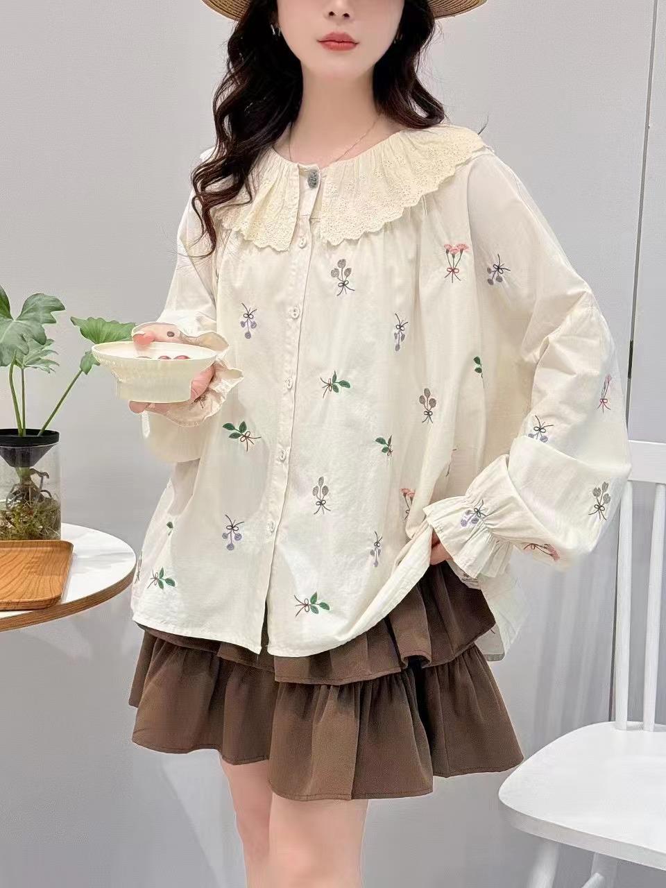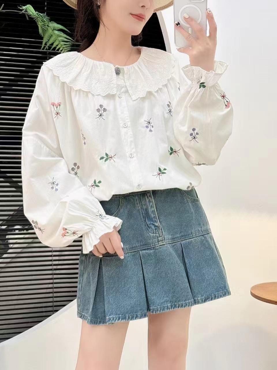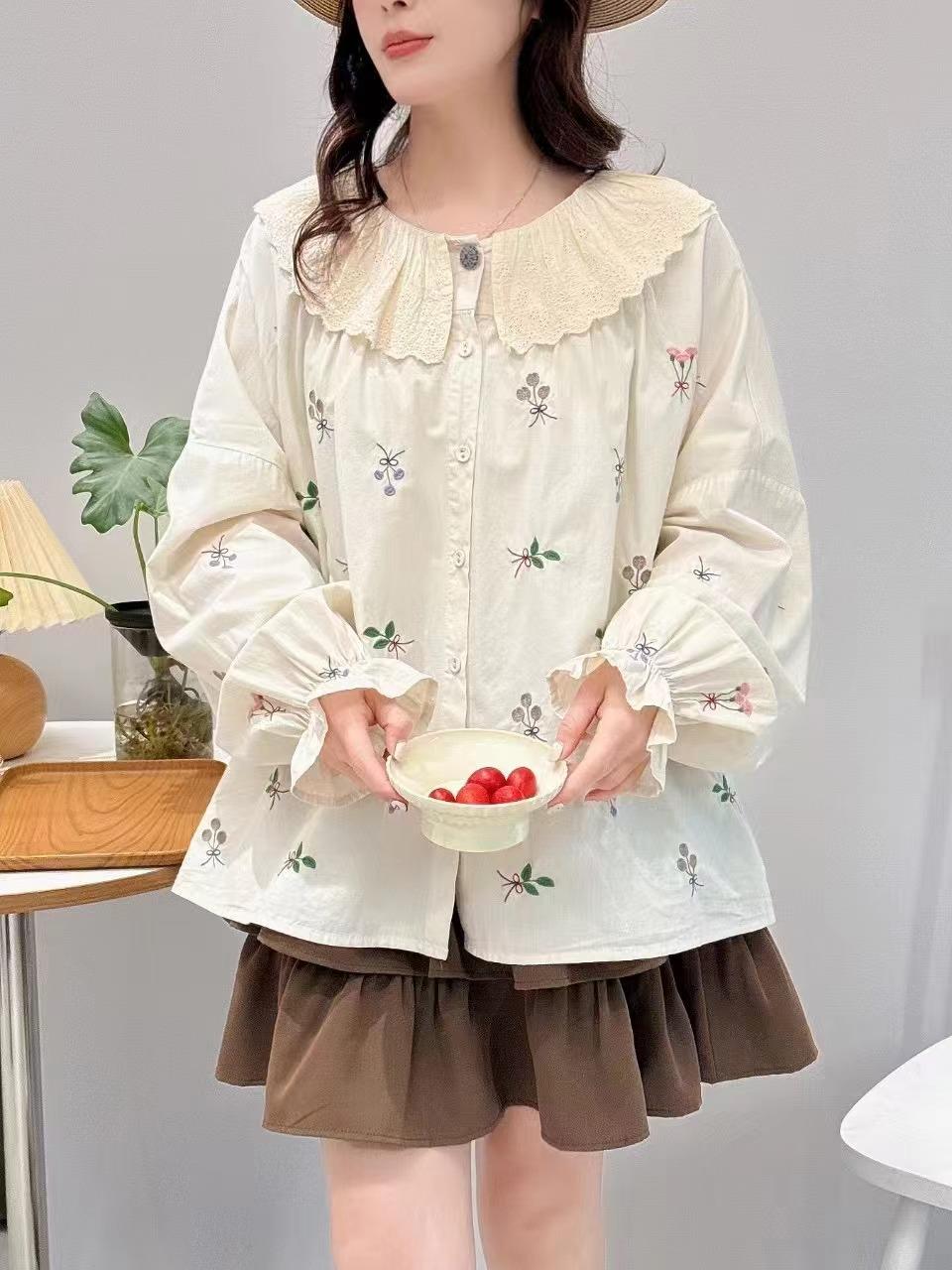 Nueva Camisa de Algodón con Bordado Floral de Primavera y Otoño, Cuello con Adorno de Encaje, Holgada, Reductora de Edad, Manga Larga Babydoll al por Mayor