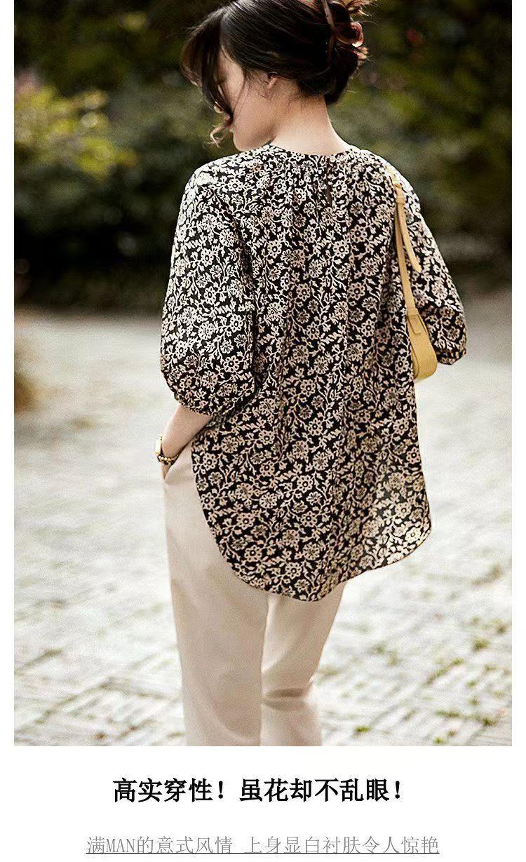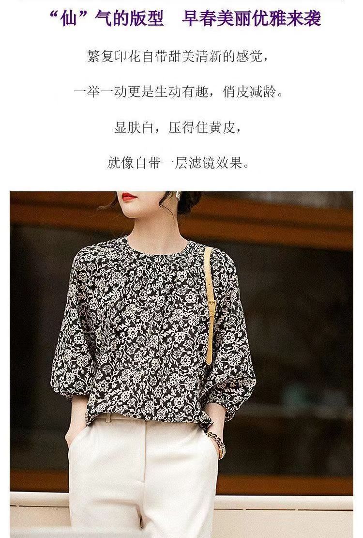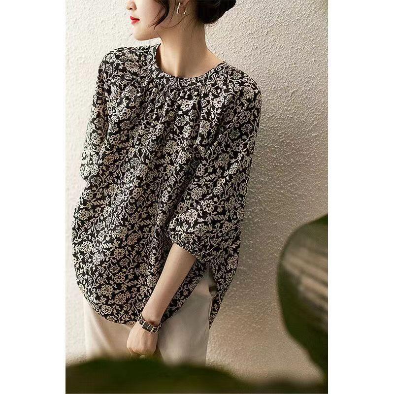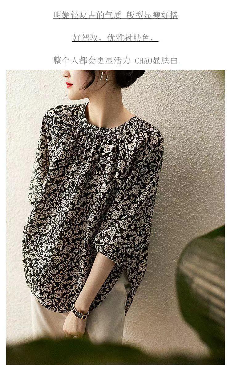 Estilo Étnico 2023 Primavera Nueva Llegada Manga Siete Octavos Floral Suave Holgado Adelgazante Cuello Redondo Suéter Camiseta Top para Mujer