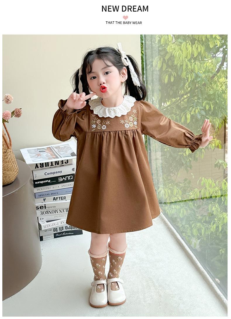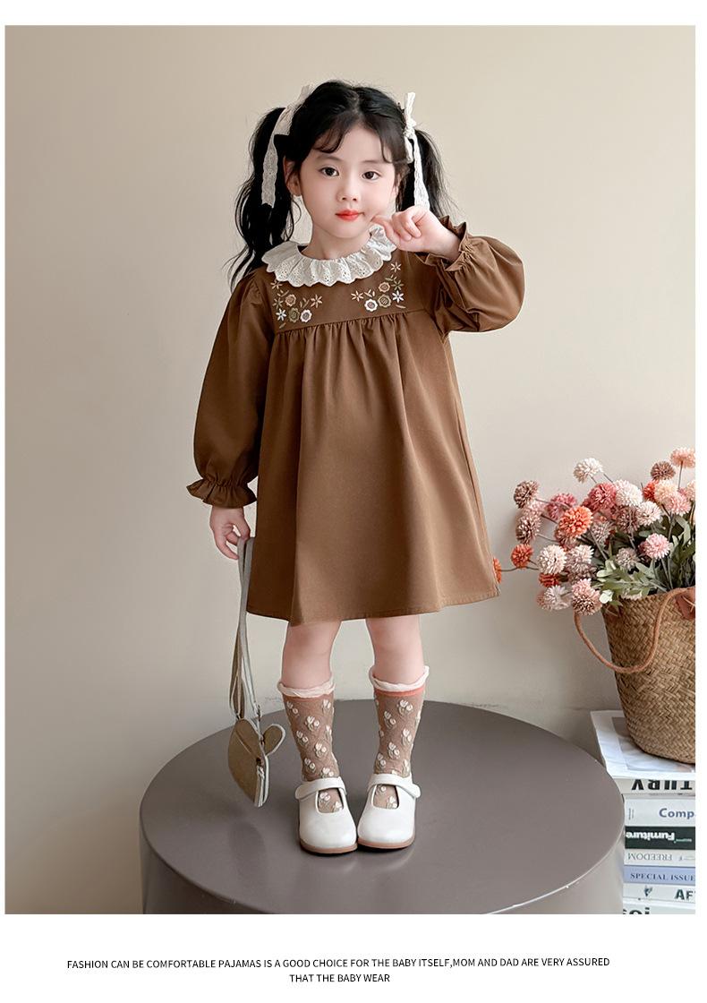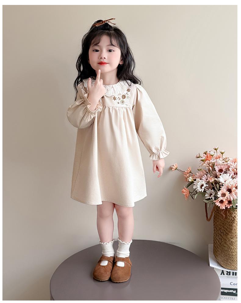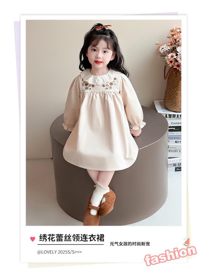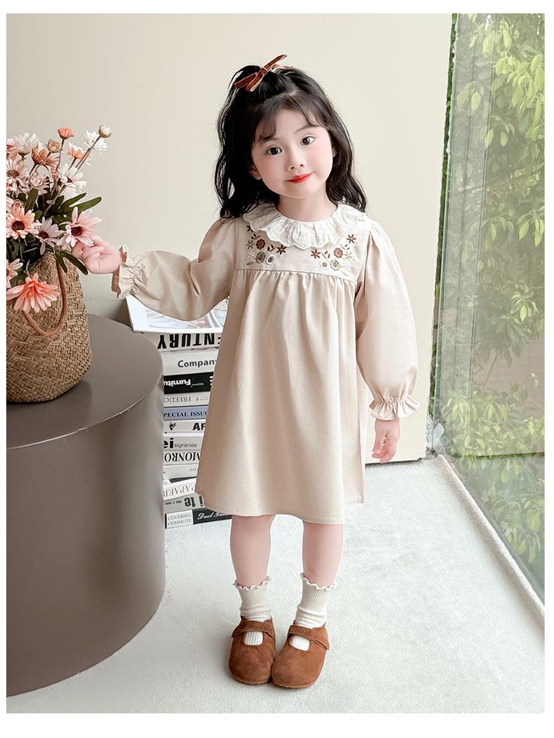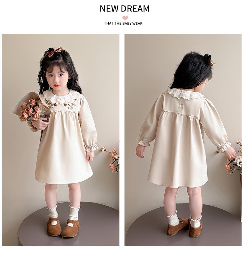 Vestido Bordado con Cuello de Encaje para Niñas Estilo Primavera y Otoño Moda Coreana Infantil Niña Pequeña Vestido de Princesa Elegante Niños Pequeños y Medianos
