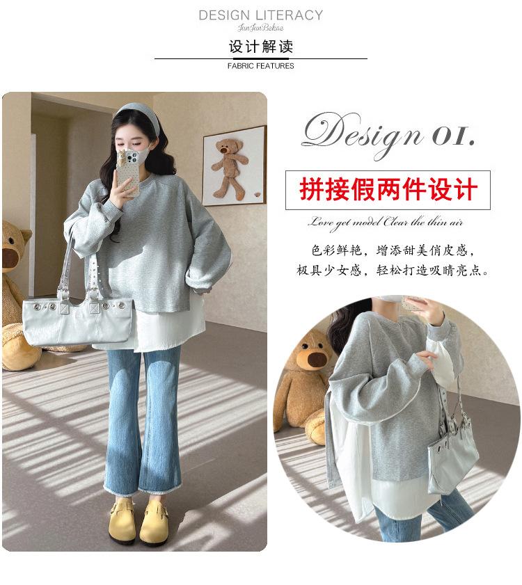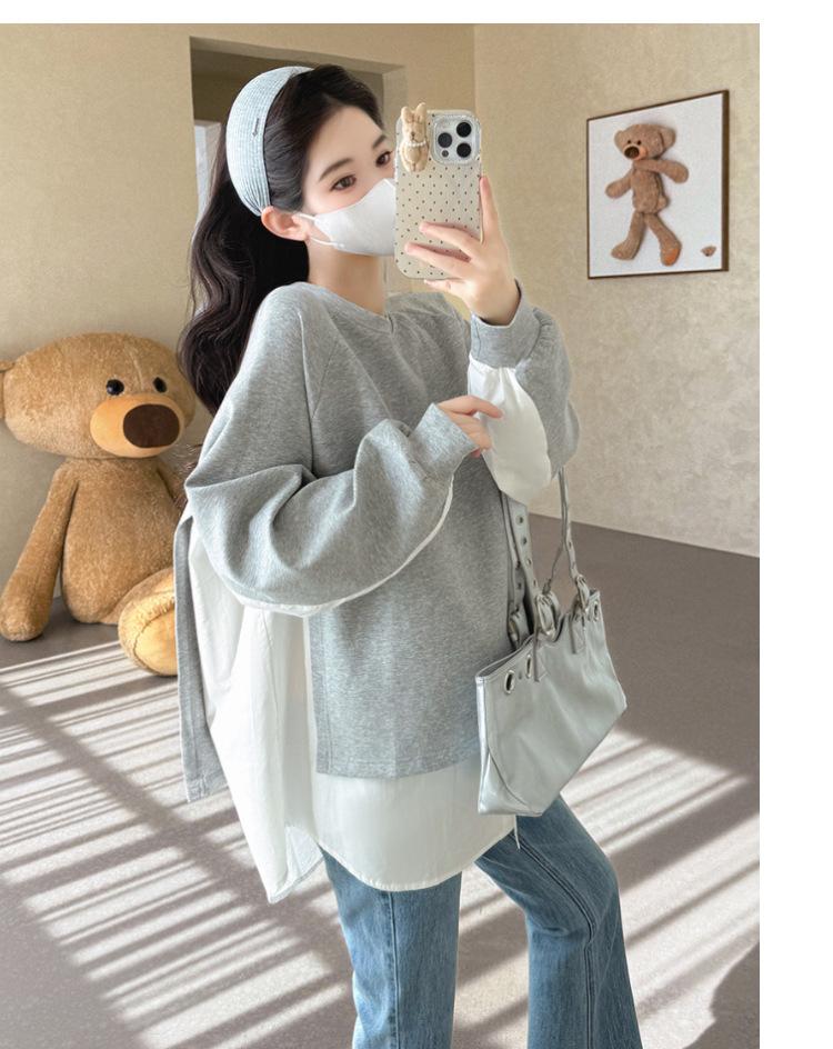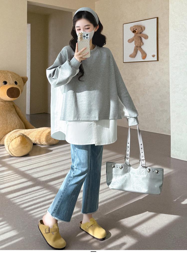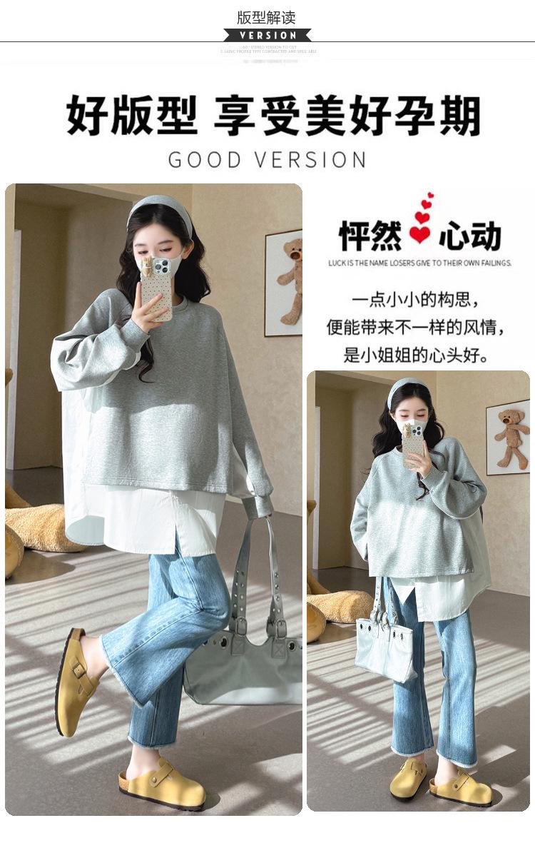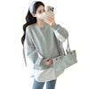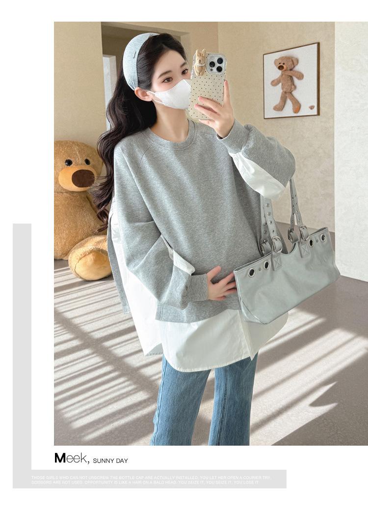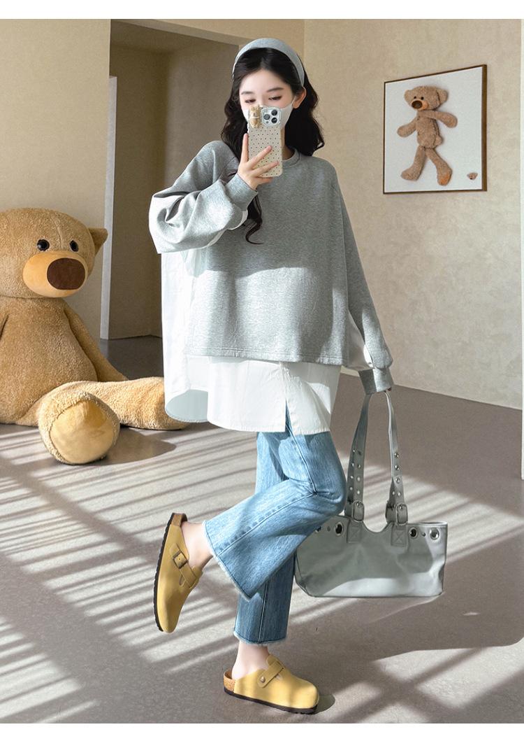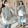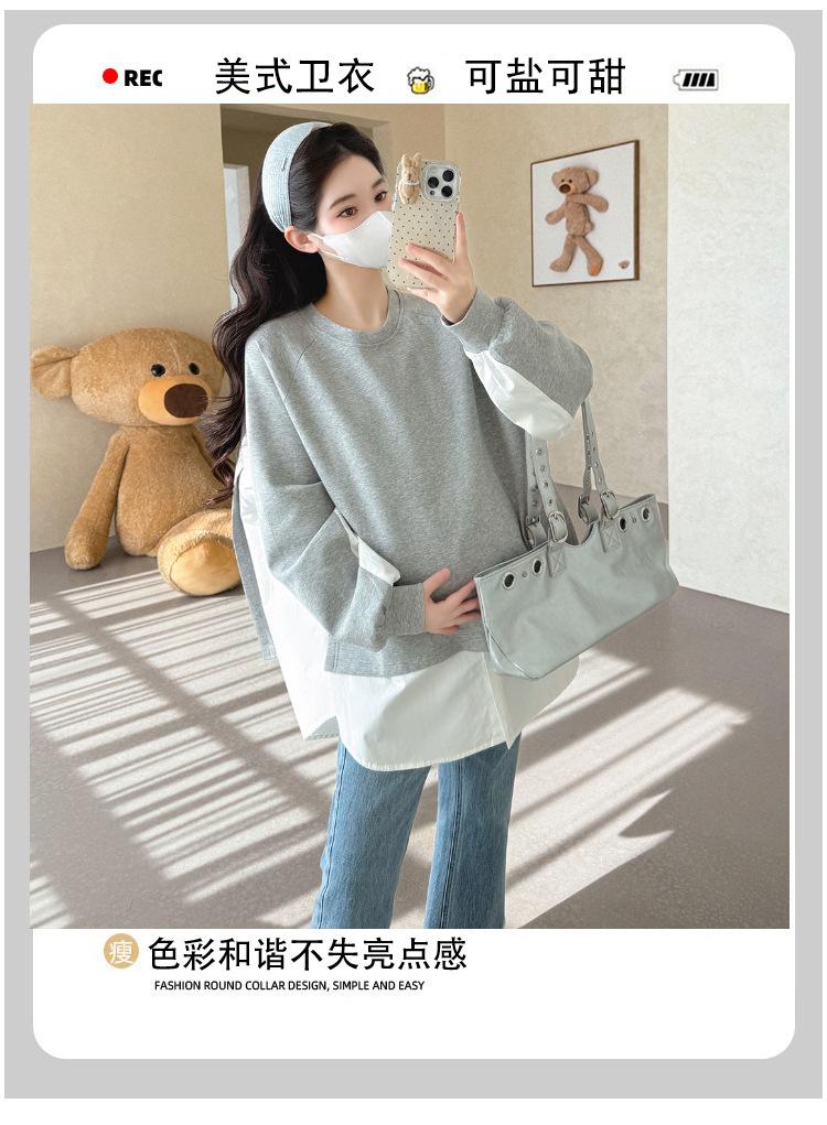 Sudadera premamá gris americano otoño holgada casual falsa de dos piezas top suelto que cubre la cadera