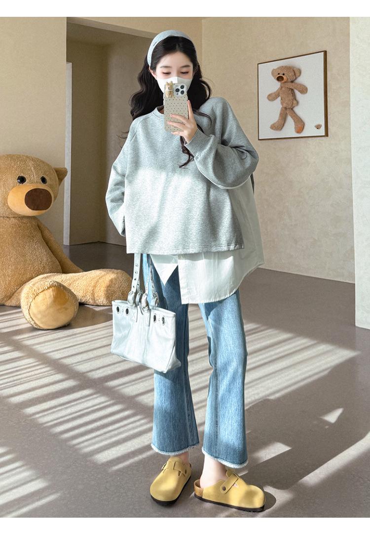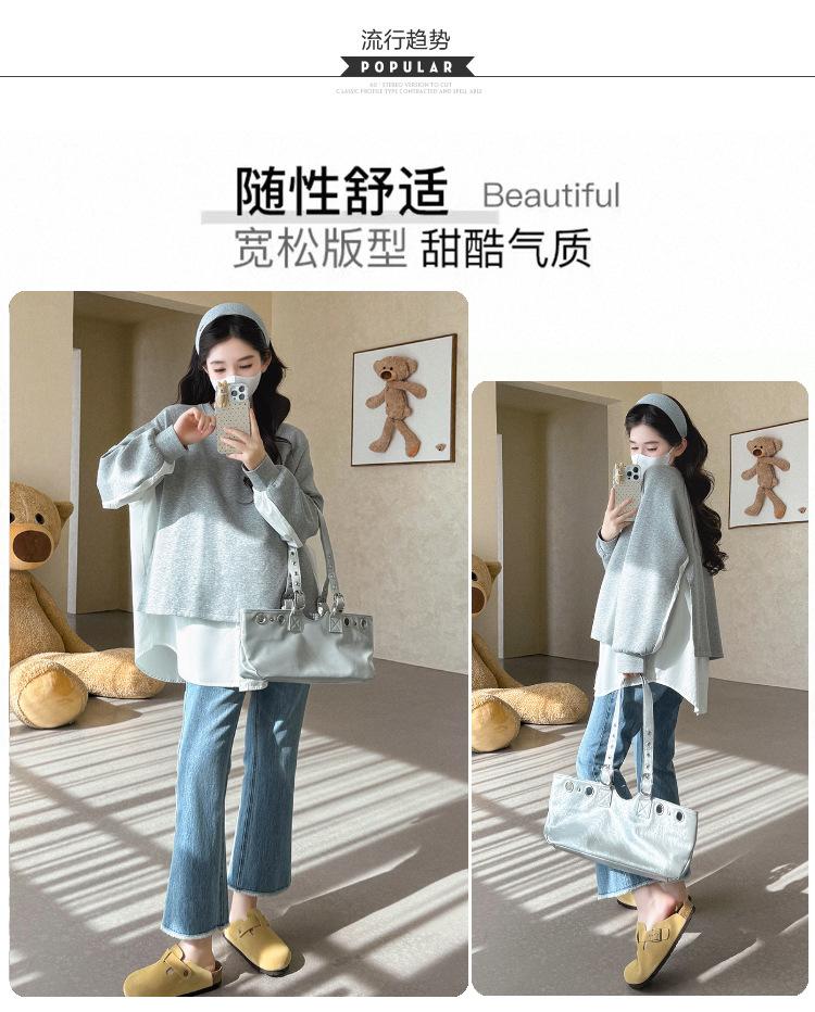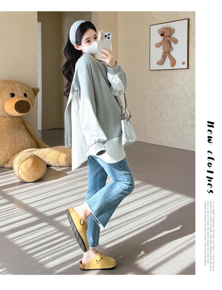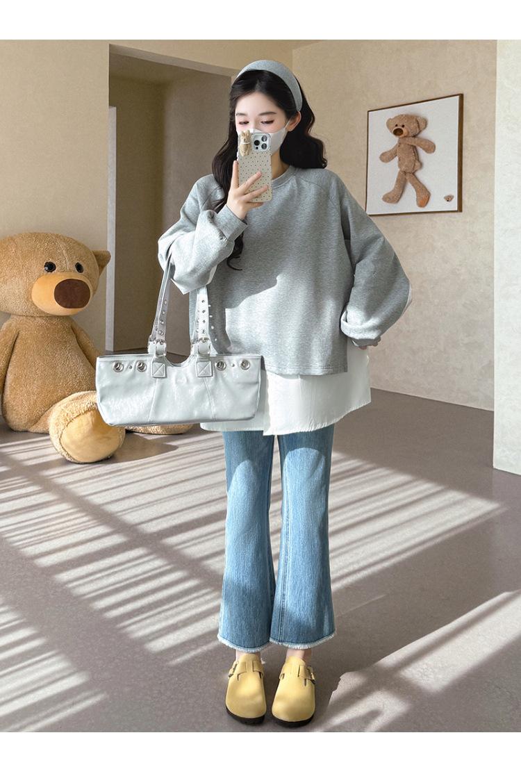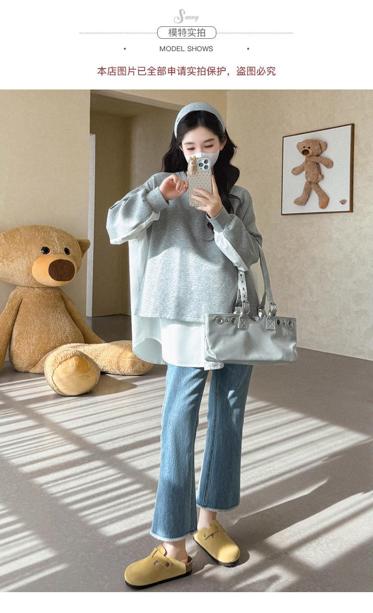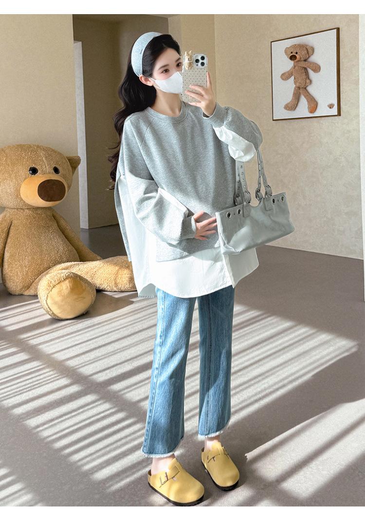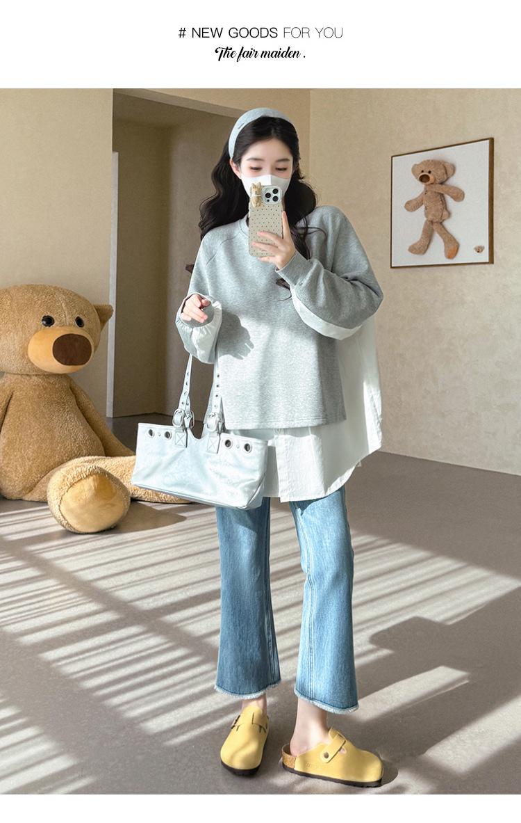 Sudadera premamá gris americano otoño holgada casual falsa de dos piezas top suelto que cubre la cadera